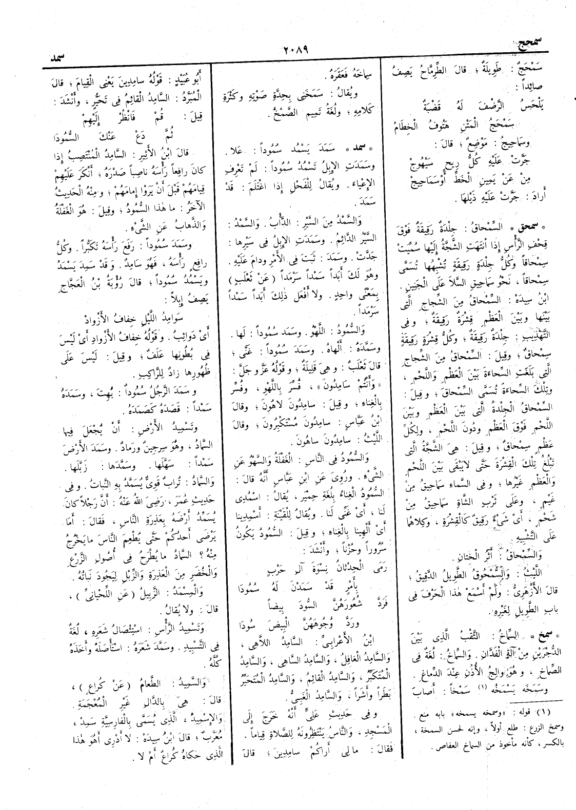 ( سمد ) سَمَدَ يَسْمُد سُموداً علا وسَمَدت الإِبل وتَسْمُدُ سُموداً لم تعرِف الإِعياء ويقال للفحل إِذا اغتلم قد سمَد والسَّمْد من السَّير الدأْب والسَّمْدُ السير الدائم وسَمَدت الإِبل في سيرها جَدَّت وسَمَدَ ثبت في الأَرض ودام غليه وهو لك أَبداً سَمْداً سَرْمَداً عن ثعلب بمعنى واحد ولا أَفعل ذلك أَبداً سمداً سرمداً والسُّمود اللهو وسَمَد سُمُوداً لها وسمَّده أَلهاه وسمَد سُموداً غَنَّى قال ثعلب وهي قليلة وقوله عز وجل وأَنتم سامِدون فَسِّرَ باللهو وفسر بالغِناء وقيل سامدون لاهُون وقال ابن عباس سامدون مستكبرون وقال الليث سامدون ساهون والسُّمود في الناس الغفلة والسَّهْوُ عن الشيء وروي عن ابن عباس أَنه قال السُّمود الغناء بلغة حِمْيَر يقال اسْمُدي لنا أَي غَنِّي لنا ويقال لِلقَيْنَةِ أَسمِدِينا أَي أَلهِينا بالغناء وقيل السُّمود يكون سروراً وحزناً وأَنشد رمَى الحِدْثانُ نِسْوَةَ آلِ حَزْبٍ بأَمْرٍ قد سَمَدْنَ له سُمودا فَرَدَّ شُعورَهُنَّ السُّودَ بِيضاً ورَدَّ وُجوهَهُن البِيضَ سُودا ابن الأَعرابي السامِدُ اللاهي والسامِدُ الغافلُ والسامد الساهي والسامد المُتَكَبِّر والسامد القائم والسامد المُتَحير بَطَراً وأَشَراً والسامد الغبيُّ وفي حديث عليّ أَنه خرج إِلى المسجد والناسُ ينتظرونه للصلاة قياماً فقال ما لي أَراكم سامدين قال أَبو عبيد قوله سامدين يعني القيام قال المبرد السامد القائم في تَحيُّر وأَنشد قيل قُمْ فانظُرْ إِليهم ثم دَعْ عنك السُّمودا قال ابن الأَثير السامد المنتصب إِذا كان رافعاً رأْسه ناصباً صدره أَنكر عليهم قيامهم قبل أَن يَرَوا إِمامهم ومنه الحديث الآخر ما هذا السُّمودُ وقيل هو الغفلة والذَّهابُ عن الشيء وسَمَدَ سُموداً رفع رأْسه تكبُّراً وكلُّ رافعٍ رأْسَه فهو سامد وقد سَمِدَ يَسْمَدُ ويَسْمُد سموداً قال رؤْبة بن العجاج يصف إِبلاً سَوامِدُ الليلِ خِفافُ الأَزوادْ أَي دَوائبُ وقوله خِفافُ الأَزواد أَي ليس في بطونها علَف وقيل ليس على ظهورها زاد للراكب وسَمَدَ الرجلُ سُموداً بُهِتَ وسَمَدَه سَمْداً قصده كصَمَده وتسميدُ الأَرض أَن يُجْعَل فيها السَّمادُ وهو سِرجِينٌ ورَماد وسَمَدَ الأَرض سَمْداً سهلها وسمَّدها زبَّلها والسَّمادُ تراب قَوِيٌّ يُسَمَّدُ به النبات وفي حديث عمر رضي الله عنه أَن رجلاً كان يُسَمِّدُ أَرضَه بعَذِرَة الناس فقال أَما يَرضى أَحدُكم حتى يُطِعمَ الناس ما يَخرج منه ؟ السَّماد ما يُطرح في أُصول الزرع والخُضَر من العذرة والزِّبْل ليَجود نَباتُه والمِسْمَد الزَّبيلُ عن اللحياني قال ولا يقال وتَسْميدُ الرأْس استئصالُ شَعَره لغة في التسبيدِ وسَمَّد شعره استأْصله وأَخذه كله والسَّميدُ الطعام عن كراع قال هي بالدال غير المعجمة والإِسميدُ الذي يسمى بالفارسية سَمِدْ معرّب قال ابن سيده لا أَدري أَهو هذا الذي حكاه كراع أَم لا