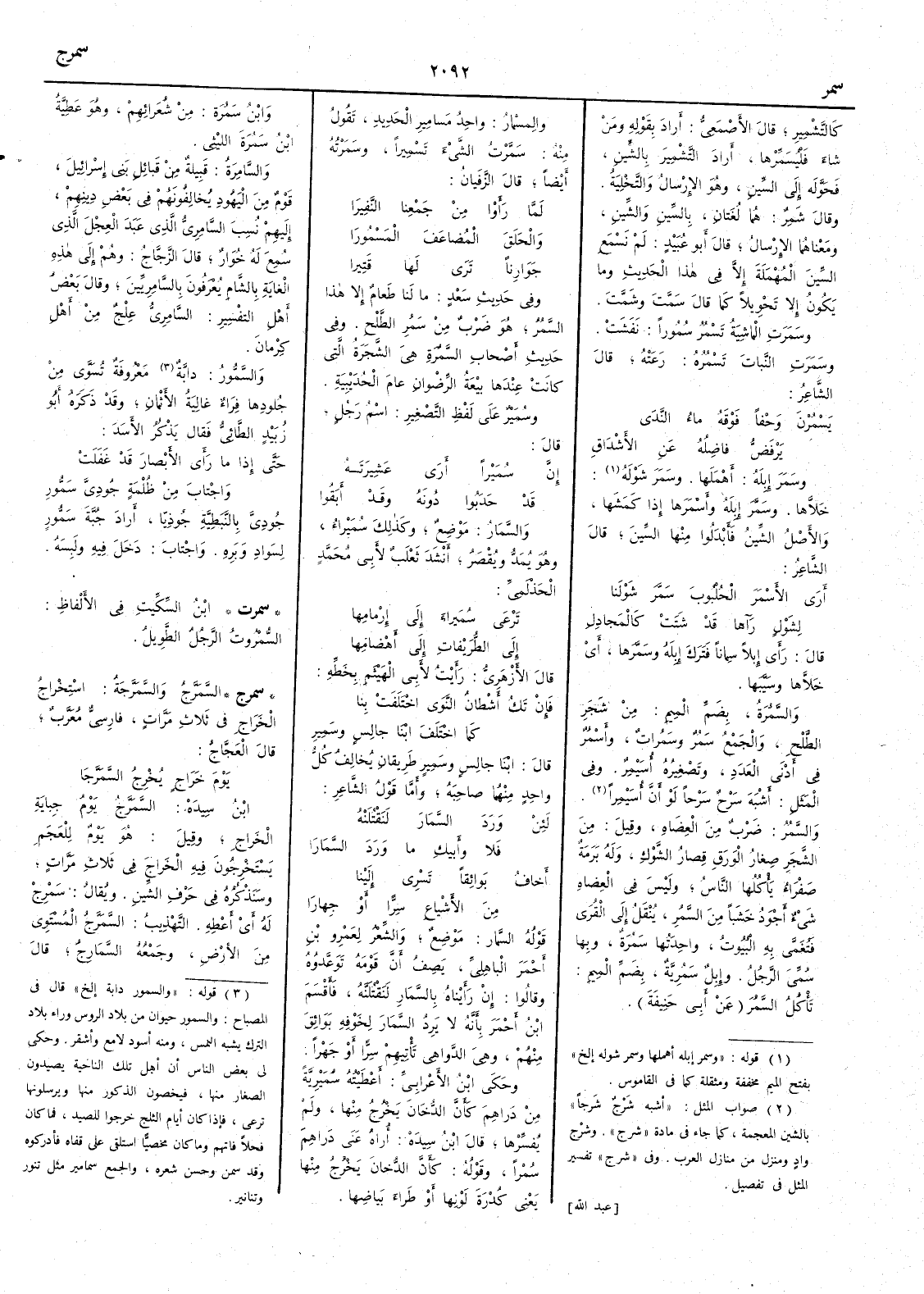 ( * قوله « وسمر إِبله أهملها وسمر شوله إلخ » بفتح الميم مخففة ومثقلة كما في القاموس ) خَلاَّها وسَمَّرَ إِبلَهُ وأَسْمَرَها إِذا كَمَشَها والأَصل الشين فأَبدلوا منها السين قال الشاعر أَرى الأَسْمَرَ الحُلْبوبَ سَمَّرَ شَوْلَنا لِشَوْلٍ رآها قَدْ شَتَتْ كالمَجادِلِ قال رأَى إِبلاً سِماناً فترك إِبله وسَمَّرَها أَي خلاها وسَيَّبَها والسَّمُرَةُ بضم الميم من شجر الطَّلْحِ والجمع سَمُرٌ وسَمُراتٌ وأَسْمُرٌ في أَدنى العدد وتصغيره أُسَيمِيرٌ وفي المثل أَشْبَهَ سَرْحٌ سَرْحاً لَوْ أَنَّ أُسَيْمِراً والسَّمُرُ ضَرُبٌ من العِضَاهِ وقيل من الشَّجَرِ صغار الورق قِصار الشوك وله بَرَمَةٌ صَفْرَاءُ يأْكلها الناس وليس في العضاه شيء أَجود خشباً من السَّمُرِ ينقل إِلى القُرَى فَتُغَمَّى به البيوت واحدتها سَمْرَةٌ وبها سمي الرجل وإِبل سَمُرِيَّةٌ بضم الميم تأْكل السِّمُرَ عن أَبي حنيفة والمِسْمارُ واحد مسامير الحديد تقول منه سَمَّرْتُ الشيءَ تَسْمِيراً وسَمَرْتُه أَيضاً قال الزَّفَيان لَمَّا رَأَوْا مِنْ جَمْعِنا النَّفِيرا والحَلَقَ المُضاعَفَ المَسْمُورا جَوَارِناً تَرَى لهَا قَتِيرا وفي حديث سعد ما لنا طعام إِلاَّ هذا السَّمُر هو ضرب من سَمُرِ الطَّلْحِ وفي حديث أَصحاب السَّمُرة هي الشجرة التي كانت عندها بيعة الرضوان عام الحديبية وسُمَير على لفظ التصغير اسم رجل قال إِن سُمَيْراً أَرَى عَشِيرَتَهُ قد حَدَبُوا دُونَهُ وقد أَبَقُوا والسَّمَارُ موضع وكذلك سُمَيراءُ وهو يمدّ ويقصر أَنشد ثعلب لأَبي محمد الحذلمي تَرْعَى سُمَيرَاءَ إِلى أَرْمامِها إِلى الطُّرَيْفاتِ إِلى أَهْضامِها قال الأَزهري رأَيت لأَبي الهيثم بخطه فإِنْ تَكُ أَشْطانُ النَّوَى اخْتَلَفَتْ بِنا كما اخْتَلَفَ ابْنَا جالِسٍ وسَمِيرِ قال ابنا جالس وسمير طريقان يخالف كل واحد منهما صاحبه وأَما قول الشاعر لَئِنْ وَرَدَ السَّمَارَ لَنَقْتُلَنْهُ فَلا وأَبِيكِ ما وَرَدَ السَّمَارَا أَخافُ بَوائقاً تَسْري إِلَيْنَا من الأَشيْاعِ سِرّاً أَوْ جِهَارَا قوله السَّمار موضع والشعر لعمرو بن أَحمر الباهلي يصف أَن قومه توعدوه وقالوا إِن رأَيناه بالسَّمَار لنقتلنه فأَقسم ابن أَحمر بأَنه لا يَرِدُ السَّمَار لخوفه بَوَائقَ منهم وهي الدواهي تأْتيهم سرّاً أَو جهراً وحكى ابن الأَعرابي أَعطيته سُمَيْرِيَّة من دراهم كأَنَّ الدُّخَانَ يخرج منها ولم يفسرها قل ابن سيده أُراه عنى دراهم سُمْراً وقوله كأَن الدخان يخرج منها يعني كُدْرَةَ لونها أَو طَراءَ بياضِها وابنُ سَمُرَة من شعرائهم وهو عطية بن سَمُرَةَ الليثي والسَّامِرَةُ قبيلة من قبائل بني إِسرائيل قوم من اليهود يخالفونهم في بعض دينهم إِليهم نسب السَّامِرِيُّ الدي عبد العجل الذي سُمِعَ له خُوَارٌ قال الزجاج وهم إِلى هذه الغاية بالشام يعرفون بالسامريين وقال بعض أَهل التفسير السامري عِلْجٌ من أَهل كِرْمان والسَّمُّورُ دابة