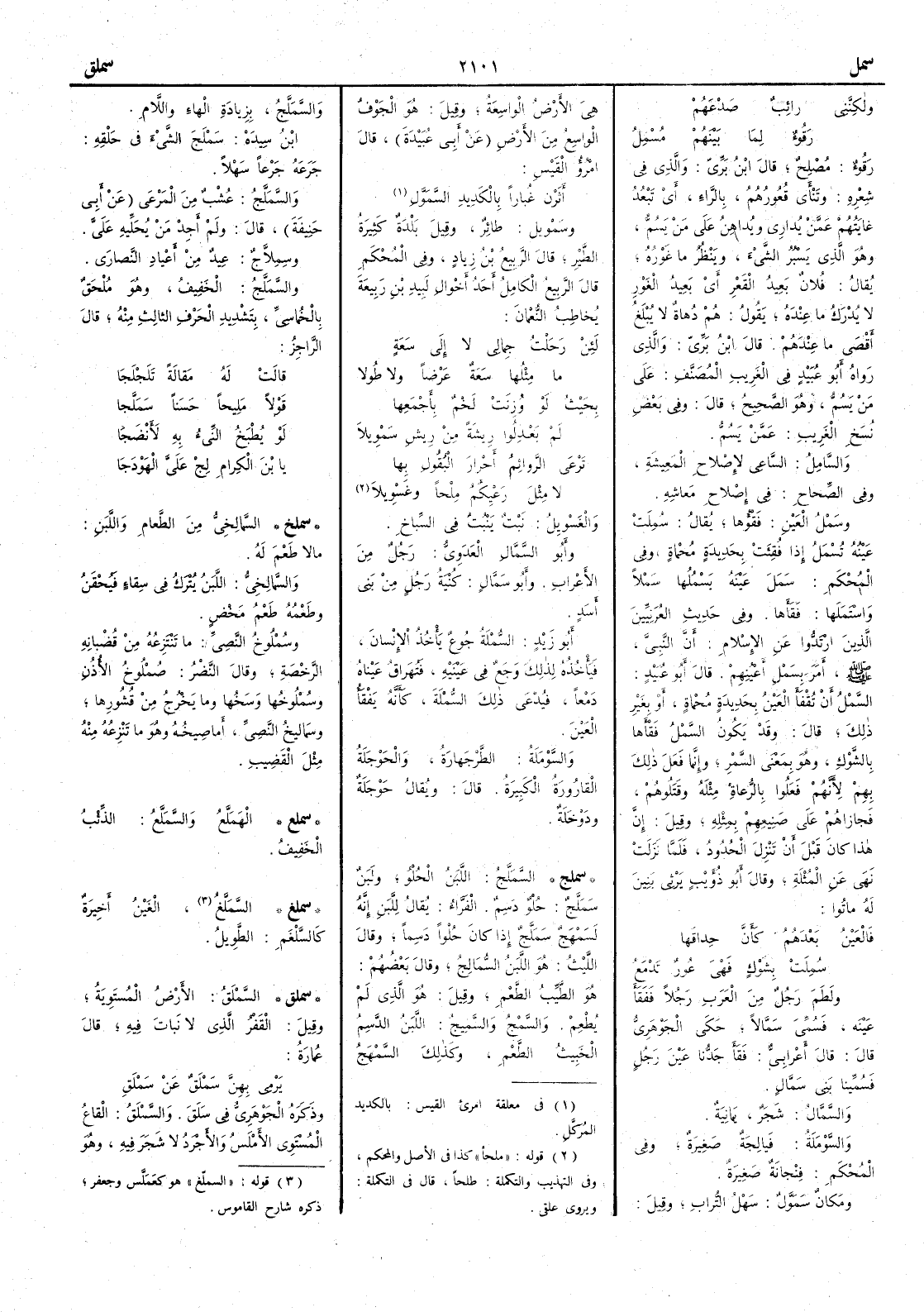 ( سملع ) الهَمَلَّعُ والسَّمَلَّعُ الذئب الخفيف ( سملغ ) السَّمَلَّغُ الغين أَخيرة كالسَّلْغَمِ الطويلُ ( سملق ) السَّمْلَق الأَرض المستوية وقيل القَفْر الذي لا نبات فيه قال عمارة يَرْمِي بهِنَّ سَمْلَقٌ عن سَمْلَقِ وذكره الجوهري في سلق والسَّمْلَق القاع المستوي الأملس والأجْرَد لا شجر فيه وهو