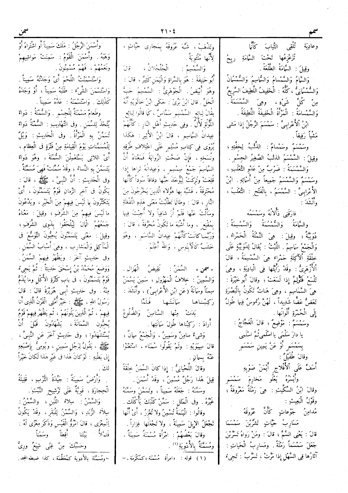 ( سمن ) السِّمَنُ نقيض الهُزال والسَّمِينُ خلاف المَهْزول سَمِنَ يَسْمَنُ سِمَناً وسَمانةً عن ابن الأَعرابي وأَنشد رَكِبْناها سَمانَتَها فلما بَدَتْ منها السَّناسِنُ والضُّلوعُ أَراد ركبناها طُولَ سَمانتِها وشيء سامِنٌ وسمين والجمع سِمانٌ قال سيبويه ولم يقولوا سُمَناء اسْتَغنَوْا عنه بسِمانٍ وقال اللحياني إذا كان السِّمَنُ خِلْقة قيل هذا رجل مُسْمِن وقد أَسْمَن وسَمَّنه جعله سميناً وتسَمَّنَ وسَمَّنه غيرُه وفي المثل سَمِّنْ كلْبَك يأْكُلْك وقالوا اليَنَمةُ تُسْمِن ولا تُغْزر أَي أَنها تجعل الإِبل سَمينة ولا تجعلها غِزاراً وقال بعضهم امرأَة مُسْمَنة سَمينة ومُسَمَّنة بالأَدْوية وأَسْمَن الرجلُ ملك سَميناً أَو اشتراه أَو وهبه وأَسْمَنَ القومُ سَمِنَتْ مواشيهم ونَعَمُهم فهم مُسْمِنون واسْتَسْمَنتُ اللحمَ أَي وجدته سَميناً واسْتَسْمَن الشيءَ طلبه سميناً أَو وجده كذلك واسْتَسْمَنه عَدَّه سَميناً وطعام مَسْمَنة للجسم والسُّمنة دواء يتخذ للسِّمَن وفي التهذيب السُّمْنة دواء تُسَمَّن به المرأَةُ وفي الحديث وَيلٌ للمُسَمَّنات يوم القيامة من فَترة في العظام أَي اللاتي يستعملن السُّمْنةَ وهو دواء يَتَسَمَّنُ به النساء وقد سُمِّنَتْ فهي مُسَمَّنة وفي الحديث أَن النبي صلى الله عليه وسلم قال يكون في آخر الزمان قوم يتَسَمَّنون أَي يتَكثَّرون بما ليس فيهم من الخير ويَدَّعون ما ليس فيهم من الشَّرَفِ وقيل معناه جَمْعُهم المالَ ليُلْحَقُوا بذَوي الشَّرَف وقيل معنى يَتَسَمَّنُون يحِبون التَّوَسُّعَ في المَآكل والمَشارِب وهي أَسباب السِّمَنِ وفي حديث آخر ويَظْهَرُ فيهم السِّمَنُ ووضع محمد بن إسحق حديثاً ثم يجيء قوم يَتَسَمَّنُون في باب كثرة الأَكل وما يُذَمُّ منه وفي حديث أَبي هريرة قال قال رسول الله صلى الله عليه وسلم خير أُمتي القَرْنُ الذي أَنا فيهم ثم الذين يَلُونهم ثم يظهرَ فيهم قومٌ يُحِبُّون السَّمَانةَ يَشْهَدُونَ قبل أَن يُسْتَشْهَدُوا وفي حديث آخر عن النبي صلى الله عليه وسلم يقول لرجلٍ سَمِينٍ ويُومِئُ بإصبعه إلى بطنه لو كان هذا في غير هذا لكان خيراً لك وأَرضٌ سَمِينة جَيِّدة التُّرْب قليلة الحجارة قوية على ترشيح النبت والسَّمْنُ سِلاءُ اللَّبَنِ والسَّمْنُ سِلاءُ الزُّبْد والسَّمْنُ للبقر وقد يكون للمِعْزَى قال امرؤ القيس وذكر مِعْزًى له فتَمْلأُ بَيْتَنا أَقِطاً وسَمْناً وحَسْبُكَ من غِنًى شِبَعٌ ورِيُّ