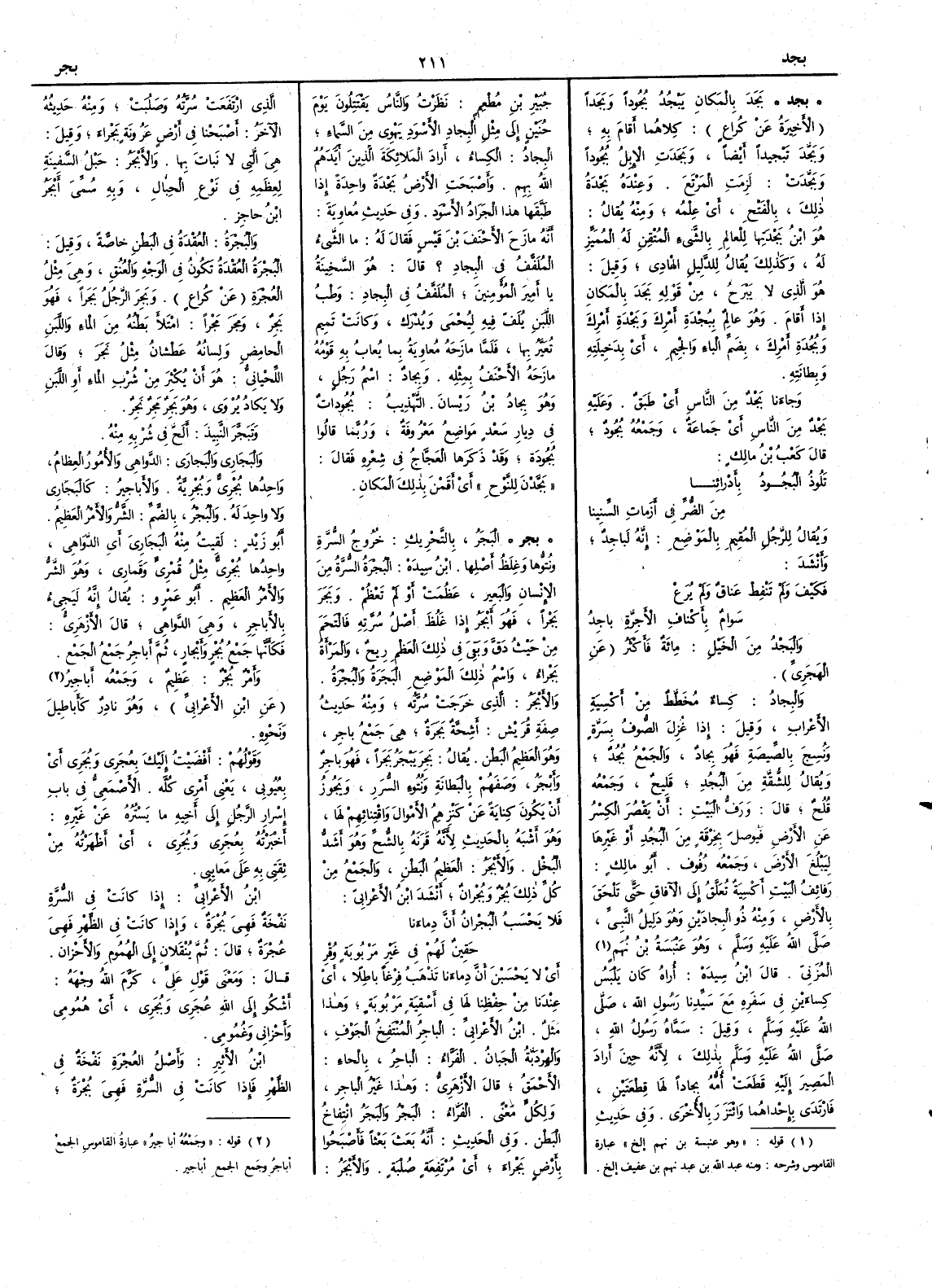 ( * قوله « وجمعه أباجير » عبارة القاموس الجمع أَباجر وجمع الجمع أَجير ) عن ابن الأَعرابي وهو نادر كأَباطيل ونحوه وقولهم أَفْضَيْتُ إِليك بِعُجَرِي وبُجَري أَي بعيوبي يعني أَمري كله الأَصمعي في باب إِسرار الرجل إِلى أَخيه ما يستره عن غيره أَخبرته بِعُجَرِي وبُجَرِي أَي أَظهرته من ثقتي به على مَعايبي ابن الأَعرابي إِذا كانت في السُّرَّة نَفْخَةٌ فهي بُجْرَةٌ وإِذا كانت في الظهر فهي عُجْرَةٌ قال ثم ينقلان إِلى الهموم والأَحزان قال ومعنى قول علي كرم الله وجهه أَشْكُو إِلى الله عُجَرِي وبُجَرِي أَي همومي وأَحزاني وغمومي ابن الأَثير وأَصل العُجْرَةِ نَفْخَةٌ في الظهر فإِذا كانت في السرة فهي بُجْرَةٌ