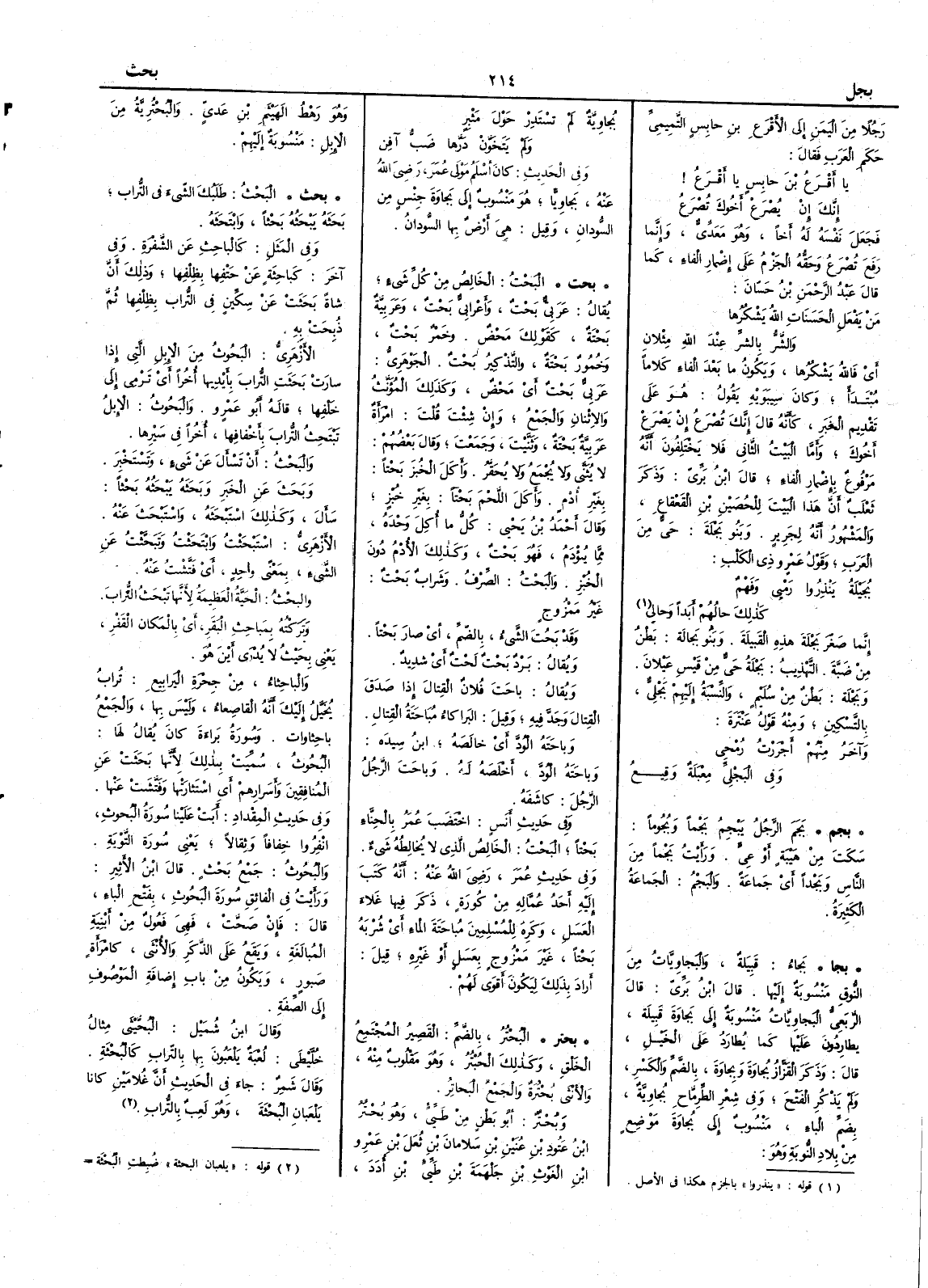 ( بحث ) البَحْثُ طَلَبُكَ الشيءَ في التُّراب بَحَثَه يَبْحَثُه بَحْثاً وابْتَحَثَه وفي المثل كالباحِثِ عن الشَّفْرة وفي آخر كباحِثةٍ عن حَتْفها بظِلْفها وذلك أَن شاةً بَحَثَتْ عن سِكِّين في التراب بظِلْفِها ثم ذُبِحَتْ به الأَزهري البَحُوثُ من الإِبل التي إِذا سارتْ بحثت الترابَ بأَيديها أُخُراً أَي ترمِي إِلى خَلْفِها قاله أَبو عمرو والبَحوثُ الإِبلُ تَبْتَحثُ الترابَ بأَخْفافِها أُخُراً في سَيرها والبَحْثُ أَن تَسْأَل عن شيء وتَسْتَخْبر وبَحَثَ عن الخَبر وبَحَثَه يَبْحَثُه بَحْثاً سأَل وكذلك اسْتَبْحَثَه واسْتَبْحَثَ عنه الأَزهري اسْتَبْحَثْتُ وابْتَحَثْتُ وتَبَحَّثْتُ عن الشيء بمعنى واحد أَي فَتَّشْتُ عنه والبَحْث الحَيَّةُ العظيمة لأَنها تَبْحَثُ التُّرابَ وتَرَكْتُه بمباحِثِ البَقَر أَي بالمكان القَفْر يعني بحيثُ لا يُدْرى أَين هو والباحِثاء من جِحرَة اليرابيع تُرابٌ يُخَيَّلُ إِليكَ أَنه القاصِعاء وليس بها والجمعُ باحِثاواتُ وسُورةُ بَراءةَ كان يقال لها البُحُوثُ سمِّيت بذلك لأَنها بَحَثَتْ عن المنافقين وأَسرارهم أَي اسْتَثارتْها وفَتَشَتْ عنها وفي حديث المِقداد أَبَتْ علينا سُورةُ البُحوثِ انْفِرُوا خِفافاً وثِقالاً يعني سورةَ التوبة والبُحوثُ جمع بَحْثٍ قال ابن الأَثير ورأَيت في الفائق سورة البَحُوث بفتح الباء قال فإِن صحت فهي فَعُول من أَبنية المبالغة ويقع على الذكر والأُنثى كامرأَة صَبور ويكون في باب إِضافة الموصوف إِلى الصفة وقال ابن شميل البُحَّيْثى مثال خُلَّيْطَى لُعْبة يَلْعَبون بها بالتراب كالبُحْثَة وقال شمر جاء في الحديث أَن غُلامين كانا يَلْعَبانِ البُحْثَةَ