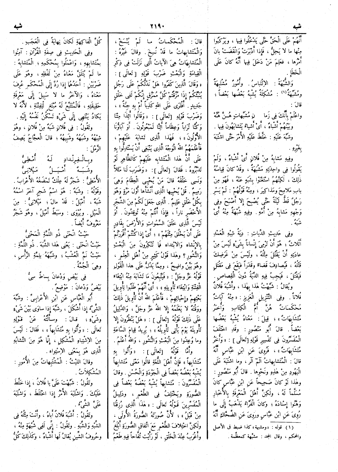 ( * قوله ومشبهة » كذا ضبط في الأصل والمحكم وقال المجد مشبهة كمعظمة ) مُشْكِلَة يُشْبِهُ بعضُها بعضاً قال واعْلَمْ بأَنَّك في زَما نِ مُشَبِّهاتٍ هُنَّ هُنَّهْ وبينهم أَشْباهٌ أَي أَشياءُ يتَشابهون فيها وشَبَّهَ عليه خَلَّطَ عليه الأَمْرَ حتى اشْتَبه بغيره وفيه مَشابهُ من فلان أَي أَشْباهٌ ولم يقولوا في واحدته مَشْبَهةٌ وقد كان قياسه ذلك لكنهم اسْتَغْنَوْا بشَبَهٍ عنه فهو من باب مَلامِح ومَذاكير ومنه قولهم لم يَسْرِ رجلٌ قَطُّ ليلةً حتى يُصْبِحَ إلا أَصْبَح وفي وجهه مَشابِهُ من أُمِّه وفيه شُبْهَةٌ منه أَي شَبَهٌ وفي الحديث الدِّياتِ دِيَةُ شِبْهِ العَمْدِ أَثْلاثٌ هو أَن ترمي إِنساناً بشيءٍ ليس من عادته أَن يَقْتُل مِثْلُه وليس من غَرَضِكَ قتله فيُصادِفَ قَضاءً وقَدَراً فيَقَعَ في مَقْتَلٍ فيَقْتُل فيجب فيه الديةُ دون القصاص ويقال شَبَّهْتُ هذا بهذا وأَشْبَه فلانٌ فلاناً وفي التنزيل العزيز منه آياتٌمُحْكَماتٌ هُنَّ أُمُّ الكتاب وأُخَرُ مُتَشابِهاتٌ قيل معناه يُشْبِهُ بعضُها بعضاً قال أَبو منصور وقد اختلف المفسرون في تفسير قوله وأُخر متشابهات فروي عن ابن عباس أَنه قال المتشابهات الم الر وما اشْتَبه على اليهود من هذه ونحوها قال أَبو منصور وهذا لو كان صحيحاً ابن عباس كان مُسَلَّماً له ولكن أَهل المعرفة بالأَخبار وَهَّنُوا إسْنادَه وكان الفراء يذهب إلى ما روي عن ابن عباس وروي عن الضحاك أَنه قال المحكمات ما لم يُنْسَخْ والمُتَشابِهات ما قد نسخ وقال غيره المُتَشابِهاتُ هي الآياتُ التي نزلت في ذكر القيامة والبعث ضَرْبَ قَوْلِه وقال الذين كفروا هل نَدُلُّكُمْ على رجل يُنَبِّئُكم إذا مُزِّقْتُمْ كُلَّ ممَزَّقٍ إنَّكم لفي خَلْقٍ جديد أَفْتَرى على الله كَذِباً أَم به جِنَّةٌ وضَرْبَ قولِه وقالوا أَئِذا مِتْنا وكنا تُراباً وعِظاماً أَئنا لمَبْعُوثون أَو آباؤُنا الأَوَّلونَ فهذا الذي تشابه عليهم فأَعْلَمهم الله الوَجْهَ الذي ينبغي أَن يَسْتَدِلُّوا به على أَن هذا المُتَشابِهَ عليهم كالظاهر لو تَدَبَّرُوه فقال وضَرَب لنا مثلاً ونَسِيَ خَلْقَه قال من يُحْيِي العِظامَ وهي رَمِيمٌ قل يُحْيِيها الذي أَنْشأَها أَوَّلَ مرَّةٍ وهو بكل خَلْقٍ عليم الذي جَعَلَ لكم من الشَّجر الأَخضَرِ ناراً فإذا أَنتم منه تُوقِدُون أَوَلَيْس الذي خلق السموات والأَرض بقادر على أَن يَخْلُق مثلهم أَي إذا كنتم أَقررتم بالإِنشاء والابتداء فما تنكرون من البعث والنُّشور وهذا قول كثير من أَهل العلم وهو بَيِّنٌ واضح ومما يدل على هذا القول قوله عز وجل فيَتَّبِعُونَ ما تَشابَه منه ابْتِغاء الفِتْنة وابتغاء تَأْويله أَي أَنهم طلبوا تأويل بعثهم وإِحيائهم فأَعلم الله أَن تأْويل ذلك ووقته لا يعلمه إلا الله عز وجل والدليل على ذلك قوله هل يَنْظُرون إلا تأْويلَه يومَ يأْتي تأْويلُه يريد قيام الساعة وما وُعِدُوا من البعث والنشور والله أَعلم وأَما قوله وأُتُوا به مُتَشابهاً فإن أَهل اللغة قالوا معنى مُتَشابهاً يُشْبِهُ بعضُه بعضاً في الجَوْدَة والحُسْن وقال المفسرون متشابهاً يشبه بعضه بعضاً في الصورة ويختلف في الطَّعْم ودليل المفسرين قوله تعالى هذا الذي رُزِقْنا من قَبْلُ لأَن صُورتَه الصورةُ الأُْولى ولكنَّ اختلافَ الطعم مع اتفاق الصورة أَبلغُ وأَغرب عند الخلق لو رأَيت تفاحاً فيه طعم كل الفاكهة لكان نهايةً في العَجَبِ وفي الحديث في صفة القرآن آمنوا بمُتَشابهِه واعْمَلُوا بمُحْكَمِه المُتَشابه ما لم يُتَلَقَّ معناه من لفظه وهو على ضربين أَحدهما إذا رُدَّ إلى المُحْكم عُرف معناه والآخر ما لا سبيل إلى معرفة حقيقته فالمُتَتَبِّعُ له مُبْتَغٍ للفتنة لأَنه لا يكاد ينتهي إلى شيء تَسْكُنُ نَفْسُه إليه وتقول في فلان شَبَهٌ من فلان وهو شِبْهُه وشَبَهُه وشَبِيهُه قال العجاج يصف الرمل وبالفِرِنْدادِ له أُمْطِيُّ وشَبَهٌ أَمْيَلُ مَيْلانيُّ الأُمْطِيُّ شجر له عِلْكٌ تَمْضَغُه ا