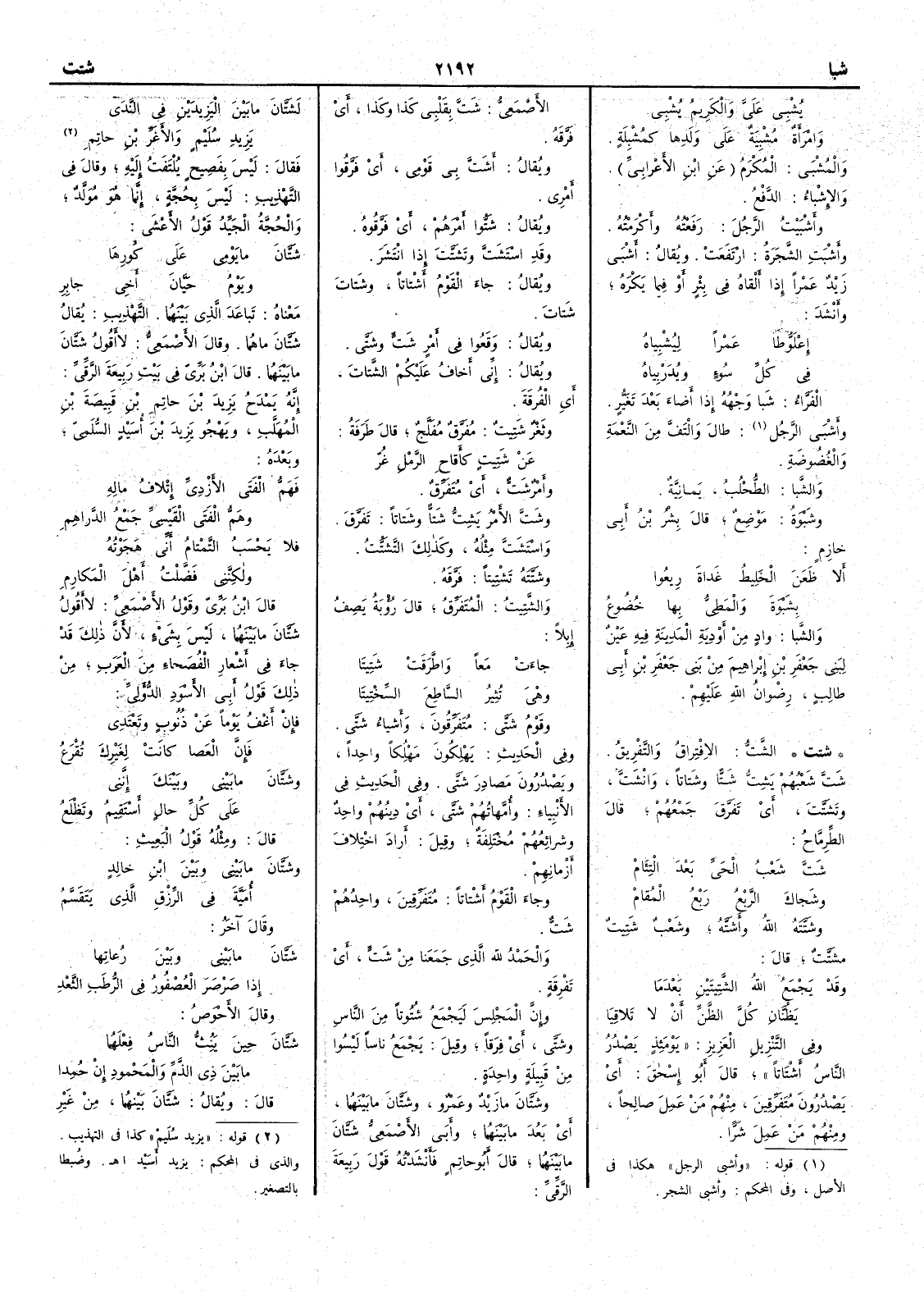 ( شتت ) الشَّتُّ الافتراق والتَّفْريقُ شَتَّ شَعْبُهم يَشِتُّ شَتًّا وشَتاتاً وانْشَتَّ وتَشَتَّتَ أَي تَفَرَّقَ جمعُه قال الطرماح شَتَّ شَعْبُ الحَيِّ بعد التِئامِ وشَجاكَ الرَّبْعُ رَبْعُ المُقامِ وشَتَّته اللهُ وأَشَتَّه وشَعْبٌ شَتِيتٌ مُشَتَّتٌ قال وقد يَجْمَعُ اللهُ الشَّتِيتَينِ بعدما يَظُنَّانِ كلَّ الظَّنِّ أَنْ لا تَلاقِيا وفي التنزيل العزيز يومئذ يَصْدُر الناسُ أَشْتاتاً قال أَبو إِسحق أَي يَصْدُرُونَ متفرِّقين منهم مَن عَمِلَ صالحاً ومِنهم مَن عمل شرّاً الأَصمعي شَّتَّ بقلبي كذا وكذا أَي فَرَّقه ويقال أَشَتَّ بي قومي أَي فَرَّقُوا أَمْري ويقال شَتُّوا أَمْرَهم أَي فَرَّقوه وقد اسْتَشَتَّ وتَشَتَّتَ إِذا انْتَشَر ويقال جاء القوم أَشْتاتاً وشَتاتَ شَتاتَ ويقال وقعوا في أَمْرٍ شَتٍّ وشَتَّى ويقال إِني أَخافُ عليكم الشَّتاتَ أَي الفُرْقة وثَغْرٌ شَتِيتٌ مُفَرَّقٌ مُفَلَّج قال طرفة عن شَتِيتٍ كأَقاحِ الرَّمْلِ غُرّ وأَمْرٌ شَتُّ أَي مَتَفَرِّقٌ وشَتَّ الأَمْرُ يَشِتُّ شَتًّا وشَتاتاً تَفَرَّقَ واسْتَشَتَّ مثلُه وكذلك التَّشَتُّتُ وشَتَّته تَشْتِيتاً فَرَّقه والشَّتِيتُ المُتَفَرِّقُ قال رؤْبة يصف إِبلاً جاءَتْ مَعاً واطَّرَقَتْ شَتِيتا وهي تُثِيرُ السَّاطِعَ السِّخْتِيتا وقومٌ شَتَّى مُتَفَرِّقون وأَشياء شَتَّى وفي الحديث يَهْلِكُون مَهْلَكاً واحداً ويَصْدُرونَ مَصادِرَ شَتَّى وفي الحديث في الأَنبياء وأُمهاتُهُم شَتَّى أَي دينُهم واحدٌ وشرائعُهم مختلفة وقيل أَراد اختلاف أَزمانهم وجاءَ القَوْم أَشْتاتاً مُتَفَرِّقين واحدُهم شَتَّ والحمد لله الذي جمعنا من شَتٍّ أَي تَفْرقةٍ وإِنَّ المجلس لَيَجْمَعُ شُتُوتاً من الناس وشَتَّى أَي فِرَقاً وقيل يجمع ناساً ليسوا من قبيلة واحدة وشَتَّانَ ما زيدٌ وعمرٌو وشَتَّانَ ما بينهما أَي بَعُدَ ما بينهما وأَبَى الأَصمَعيُّ شَتَّانَ ما بينهما قال أَبو حاتم فأَنشدته قولَ ربيعةَ الرَّقِّيِّ لَشَتَّانَ ما بين اليَزِيدَينِ في النَّدَى يَزيدِ سُلَيْمٍ والأَغَرَّ بنِ حاتِم