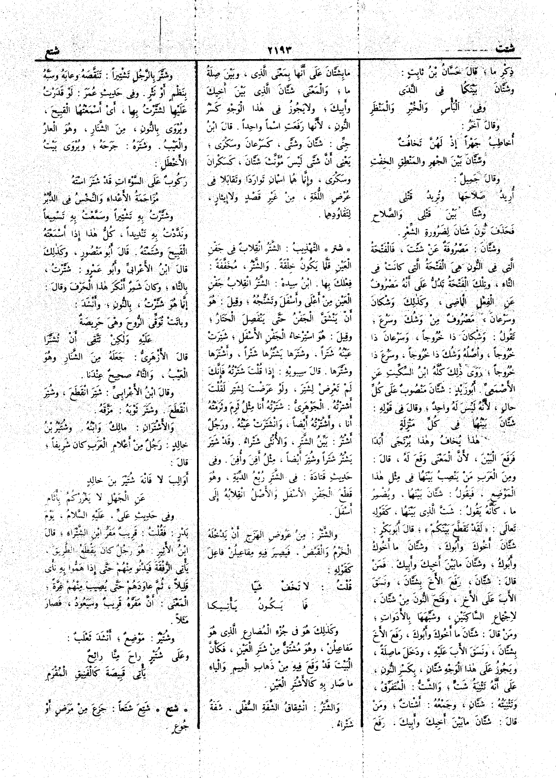 ( شتر ) التهذيب الشَّتَرُ انقلابٌ في جفن العين قلما يكون خلقة والشَّتْرُ مخففةً فِعْلك بها ابن سيده الشَّتَرُ انقلاب جَفْنِ العين من أَعلى وأَسفل وتَشَنُّجُه وقيل هو أَن ينشَقَّ الجفن حتى ينفصل الحَتَارُ وقيل هو استرخاء الجفن الأَسفل شَتِرَتْ عينُه شَتَراً وشَتَرَها يَشْتُرُها شَتْراً وأَشْتَرَها وشَتَّرَها قال سيبويه إِذا قلت شَتَرْتُهُ فإِنك لم تَعْرِضْ لِشتِرَ ولو عَرَضْتَ لِشترَ لقلتَ أَشْتَرْتُه الجوهري شَتَرْتُه أَنا مثل ثَرِم وثَرَمْتُه أَنا وأَشْتَرْتُه أَيضاً وانشَتَرتْ عينُه ورجل أَشْتَرُ بَيِّنُ الشَّتَرِ والأُنثى شَتْراء وقد شَتِرَ يَشْتَرُ شَتَراً وشُتِرَ أَيضاً مثل أَفِنَ وأُفِنَ وفي حديث قتادة في الشَّتَرِ ربع الدية وهو قطع الجفن الأَسفل والأَصل انقلابُه إِلى أَسفل والشَّتْرُ من عَروض الهَزَجِ أَن يدخله الخَرْمُ والقَبْضُ فيصير فيه مفاعيلن فاعل كقوله قلتُ لا تَخَفْ شيّا فما يكونُ يأْتيكا وكذلك هو في جزء المضارع الذي هو مفاعيلن وهو مشتق من شَتَرِ العين فكأَن البيت قد وقع فيه من ذهاب الميم والياء ما صار به كالأَشْتَرِ العيْن والشَّتَرُ انشقاق الشفة السفلى شَفَة شَتْراء وشَتَّرَ بالرجل تَشْتِيراً تَنَقَّصَه وعابه وسبَّه بنظم أَو نثر وفي حديث عمر لو قَدَرْتُ عليهما لشَتَّرْتُ بهما أَي أَسمعتهما القبيح ويروى بالنون من الشَّنَارِ وهو العار والعيب وشَتَرَه جَرَحَهُ ويروى بيت الأَخطل رَكُوبٌ على السَّوْآتِ قد شَتَرَ اسْتَهُ مُزَاحَمَةُ الأَعداءِ والنَّخْسُ في الدُّبُرْ وشَتَّرْت به تَشْتِيراً وسَمَّعْتُ به تسميعاً ونَدَّدْتُ به تنديداً كل هذا إِذا أَسمعتَه القبيح وشتمتَه قال أَبو منصور وكذلك قال ابن الأَعرابي وأَبو عمرو شَتَّرْت بالتاء وكان شمر أَنكر هذا الحرف وقال إِنما هو شَنَّرْتُ بالنون وأَنشد وباتَتْ تُوَقِّي الرُّوحَ وهي حَرِيصَةٌ عليه ولكنْ تَتَّقِي أَنْ تُشَنَّرَا قال الأَزهري جعله من الشَّنَارِ وهو العيب والتاء صحيح عندنا وقال ابن الأَعرابي شَتِرَ انقطع وشُتِرَ انقطع وشَتَرَ ثوبه مَزَّقَهُ والأَشْتَرَانِ مالك وابنه وشُتَيْرُ بن خالد رجل من أَعْلام العرب كان شريفاً قال أَوَالِبَ لا فانْهَ شُتَيْرَ بنَ خالِدٍ عن الجَهْلِ لا يَغْرُرْكُمُ بِأَثَامِ وفي حديث علي عليه السلام يوم بدر فقلتُ قريبٌ مَفَرُّ ابن الشَّتْرَاءِ قال ابن الأَثير هو رجل كان يقطع الطريق يأْتي الرُّفقة فيدنو منهم حتى إِذا هَمُّوا به نأَى قليلاً ثم عاوَدَهم حتى يصيب منهم غِرَّة المعنى أَن مَفَرَّه قريب وسيعود فصار مثلاً وشُتَيْرٌ موضع أَنشد ثعلب وعلى شُتَيْر راحَ مِنَّا رائحٌ يأْتي قَبِيصَةَ كالفَنِيق المُقْرَمِ