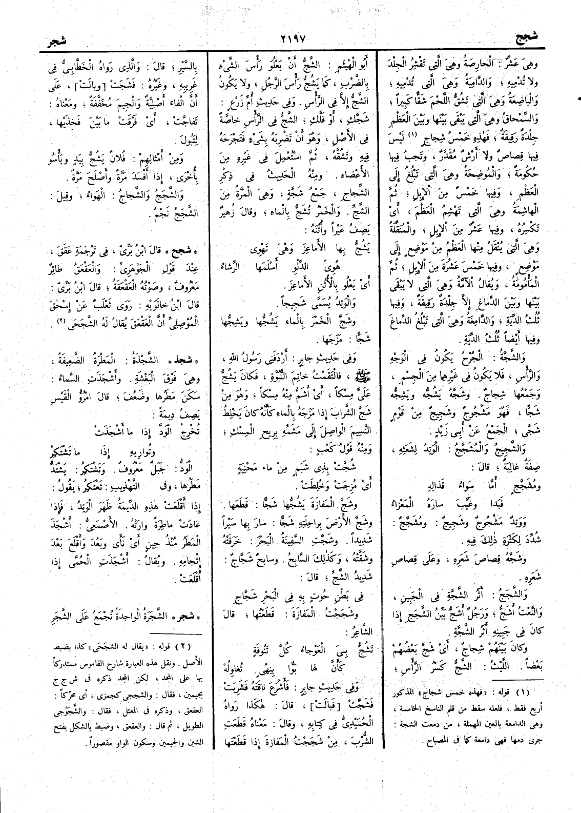 ( * قوله « فهذه خمس شجاج » المذكور أربع فقط فلعله سقط من قلم الناسخ الخامسة وهي الدامعة بالعين المهملة من دمعت الشجة جرى دمها فهي دامعة كما في المصباح ) ليس فيها قصاص ولا أَرش مقدَّر وتجب فيها حكومة والمُوضِحَةُ وهي التي تبلغ إِلى العظم وفيها خمس من الإِبل ثم الهاشمة وهي التي تَهْشِمُ العظم أَي تكسره وفيها عشر من الإِبل والمُنَقِّلةُ وهي التي ينقل منها العظم من موضِع إِلى موضع وفيها خمس عشرة من الإِبل ثم المَأْمُومَةُ ويقال الآمَّةُ وهي التي لا يبقى بينها وبين الدماغ إِلا جلدة رقيقة وفيها ثلث الدية والدَّامِغَةُ وهي التي تبلغ الدماغ وفيها أَيضاً ثلث الدية والشَّجَّةُ الجُرْحُ يكون في الوجه والرأْس فلا يكون في غيرهما من الجسم وجمعها شِجاجٌ وشَجَّهُ يَشُجُّه ويَشِجُّه شَجّاً فهو مَشْجُوجٌ وشَجِيجٌ من قوم شَجَّى الجمع عن أَبي زيد والشَّجِيجُ والمُشَجَّجُ الوَتِدُ لِشَعَثِهِ صِفةٌ غالبة قال ومُشَجَّجٍ أَمَّا سَواءُ قَذالِهِ فَبَدا وغَيَّبَ سارَهُ المَعْزاءُ ووتِدٌ مَشْجُوجٌ وشَجِيجٌ ومُشَجَّجٌ شُدِّدَ لكثرة ذلك فيه وشَجَّهُ قِصاصَ شَعَره وعلى قِصاصِ شعره والشَّجَجُ أَثر الشَّجَّةِ في الجَبِين والنعت أَشَجُّ ورجل أَشَجُّ بَيِّنُ الشَّجَج إِذا كان في جبينه أَثر الشَّجَّةِ وكان بينهم شِجاجٌ أَي شَجَّ بعضُهم بعضاً الليث الشَّجُّ كسر الرأْس أَبو الهيثم الشَّجُّ أَن يعلو رأْسَ الشيءِ بالضرب كما يَشُجُّ رأْسَ الرجل ولا يكون الشَّجُّ إِلا في الرأْس وفي حديث أُمِّ زَرْعٍ شَجَّكِ أَو فَلَّكِ الشَّجُّ في الرأْس خاصة في الأَصل وهو أَن تضربه بشيءٍ فتجرحه فيه وتشقه ثم استعمل في غيره من الأَعضاء وفي الحديث في ذكر الشِّجاجِ جمع شَجَّةٍ وهي المرّة من الشَّجِّ والخمر تُشَجُّ بالماءِ وقال زهير يصف عَيْراً وأُتُنَه يَشُجُّ بها الأَماعِزَ وهي تَهْوي هُوِيَّ الدَّلْوِ أَسْلَمها الرِّشاءُ أَي يعلو بالأُتن الأَماعِزَ والوَتَدِ يسمى شَجِيجاً وشَجَّ الخمر بالماءِ ويَشِجُّها شَجّاً مزجها وفي حديث جابر أَرْدَفَني رسولُ الله صلى الله عليه وسلم فالتقمتُ خاتم النبوّة فكان يَشُجُّ عليَّ مِسْكاً أَيْ أَشمُّ منه مسكاً وهو من شَجَّ الشرابَ إِذا مزجه بالماءِ كأَنه كان يخلطُ النسِيم الواصِلَ إِلى مَشَمِّه بريح المسك ومنه قول كعب شُجَّتْ بِذِي شَبَمٍ من ماءٍ مَحنِيَةٍ أَي مزجت وخلطت وشَجَّ المفازة يَشُجُّها شَجّاً قطعها وشَجَّ الأَرض براحلته شَجّاً سار بها سيراً شديداً وشَجَّتِ السفينةُ البحرَ خرقته وشقته وكذلك السابحُ وسابحٌ شَجَّاجٌ شديدُ الشَّجِّ قال في بَطْنِ حُوتٍ بِهِ في البحرِ شَجَّاجِ وشَجَجْتُ المفازةَ قطعتها قال الشاعر تَشُجُّ بيَ العَوْجاءُ كلَّ تَنُوفةٍ كأَنَّ لها بَوّاً بِنِهْيٍ تُغاوِلُهْ وفي حديث جابر فأَشْرَعَ ناقَتَه فشرِبت فَشَجَّتْ قال هكذا رواه الحُمَيدي في كتابه وقال معناه قطَعَت الشُّرب من شَجَجْت المَفازة إِذا قطعتَها بالسَّيْر قال والذي رواه الخطابي في غَريبه وغيره فََشَجَتْ على أَن الفاءَ أَصلية والجيم مخفَّفة ومعناه تفاجَّت أَي فرَّقت ما بين فَخِذَيْها لِتَبول ومن أَمثالهم فلان يَشُجُّ بِيَدٍ ويَأْسُو بأُخرى إِذا أَفسد مرَّة وأَصلح مرة والشَّجَجُ والشَّجاج الهواءُ وقيل الشَّجَجُ نَجْم