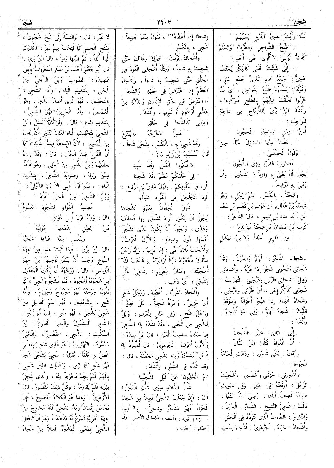 لما رأَيتُ عَدِيَّ القوْمِ يَسْلُبُهُمْ طَلْحُ الشَّواجِنِ والطَّرْفاءُ والسَّلَمُ كَفَتُّ ثَوْبيَ لا أُلْوِي على أَحَدٍ إِني شَنِئْتُ الفَتى كالبَكْرِ يُخْتَطَمُ عَدِيٌّ جمع عاد كغَزِيٍّ جمع غازٍ وقوله يَسلبُهم طَلْحُ الشَّواجن أَي لما هربوا تعلقت ثيابُهم بالطَّلْح فتركوها وأَنشد ابن بري للطرماح في شاجنة للواحدة أَمِنْ دِمَنٍ بشاجِنَةِ الحَجُونِ عَفَتْ منها المنازِلُ مُنْذُ حِينِ وقول الحَذْلَمِيِّ فضارِبَ الضَّبْه وذي الشُّجُونِ يجوز أَن يعني به وادياً ذا الشُّجون وأَن يعني به موضعاً وشِجْنَة بالكسر اسم رجل وهو شِجْنة بن عُطارِد بن عَوْف بن كَعْب بن سَعْد بن زيد مناة بن تميم قال الشاعر كَرِبُ بنُ صَفْوانَ بنِ شِجْنةَ لم يَدَعْ من دَارِمٍ أَحَداً ولا من نَهْشَلِ