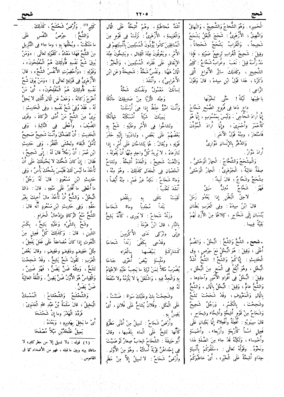( * قوله « لا تسيل إلا من مطر كثير » لا منافاة بينه وبين ما قبله فهو من الأضداد كما في القاموس ) وأَرضٌ شَحْشَحٌ كذلك والشُّحُّ حِرْصُ النفس على ما ملكت وبخلها به وما جاء في التنزيل من الشُّحِّ فهذا معناه كقوله تعالى ومن ُيوقَ شُحَّ نفسه فأُولئك هم المفلحون وقوله وأُحْضِرَتِ الأَنْفُسُ الشُّحَّ قال الأَزهري في قوله ومن يوق شح نفسه فأُولئك هم المفلحون أَي من أَخرج زكاته وعف عن المال الذي لا يحل له فقد وُقِيَ شُحَّ نفسه وفي الحديث بَرِئَ من الشُّحِّ من أَدَّى الزكاة وقَرَى الضَّيْفَ وأَعطى في النائبة وفي الحديث أَن تتصدق وأَنت شَحِيح صَحيح تَأْمُلُ البقاء وتَخْشى الفقر وفي حديث ابن عمر أَن رجلاً قال له إِني شَحِيح فقال إِن كان شُحُّكَ لا يحملك على أَن تأْخذ ما ليس لك فليس بشُحِّكَ بأْسٌ في حديث ابن مسعود قال له رجل ما أُعْطِي ما أَقْدِرُ على منعه قال ذاك البخلُ والشح أَن تأْخذ مال أَخيك بغير حقه وفي حديث ابن مسعود أَنه قال الشح منع الزكاة وإِدخال الحرام وشَحَّ بالشيء وعليه يَشِحُّ بكسر الشين قال وكذلك كل فَعِيل من النعوت إِذا كان مضاعفاً على فَعَلَ يَفْعِل مثل خفيف ودَفِيف وعَفِيف وقال بعض العرب تقول شَحَّ يَشِحُّ وقد شَحِحْتَ تَشَحُّ ومثله ضَنَّ يَضَنُّ فهو ضنين والقياس هو الأَول ضَنَّ يَضِنُّ واللغة العالية ضَنَّ يَضَنُّ والشَّحْشَحُ والشَّحْشاحُ الممسك البخيل قال سلمة ابن عبد الله العَدَوِيّ فَرَدَّدَ الهَدْرَ وما أَن شَحْشَحا أَي ما بخل بهديره وبعده يميلُ عَلْخَدَّيْنِ ميْلاً مُصْفَحا