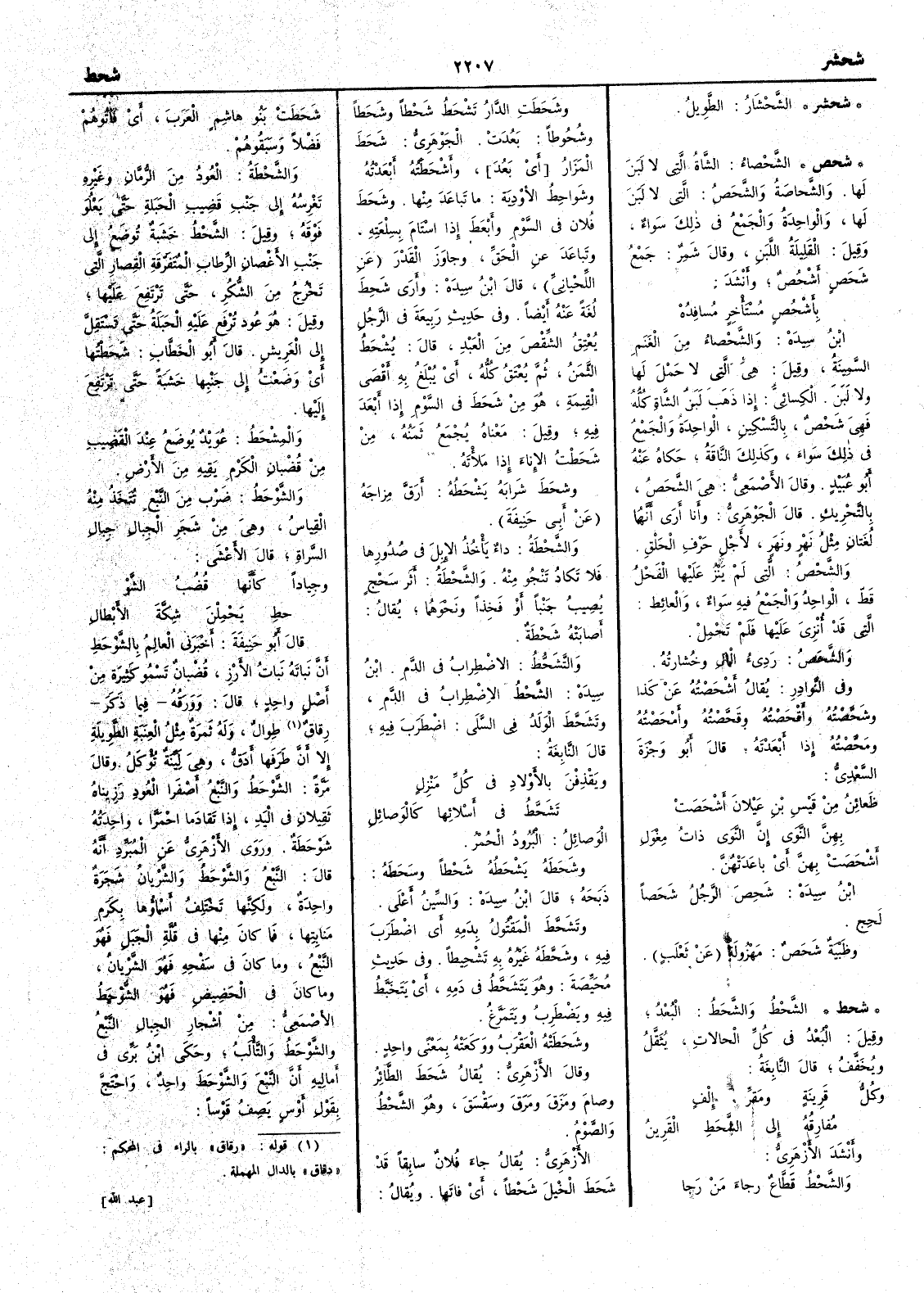 ( شحشر ) الشَّحْشَار الطويل ( شحص ) الشَّحْصاءُ الشاةُ التي لا لبن لها والشَّحاصةُ والشَّحَصُ التي لا لبن لها والواحدة والجمع في ذلك سواء وقيل القليلة اللبن وقال شمر جمع شَحَصٍ أَشْحُصٌ وأَنشد بَأَشْحُصٍ مُسْتَأْخِرٍ مسافِدُهْ ابن سيده والشَّحْصاءُ من الغَنَم السمينةُ وقيل هي التي لا حمل لها ولا لبن الكسائي إِذا ذهب لبَنُ الشاة كلُّه فهي شَحْصٌ بالتسكين الواحدة والجمع في ذلك سواء وكذلك الناقة حكاه عنه أَبو عبيد وقال الأَصمعي هي الشَّحَصُ بالتحريك قال الجوهري وأَنا أَرى أَنهما لُغَتانِ مثل نَهْرٍ ونَهَرٍ لأَجل حرف الحلق والشَّحْصُ التي لم يَنْزُ عليها الفحلُ قط الواحد والجمع فيه سواء والعائطُ التي قد أُنْزِيَ عليها فلم تَحْمِلْ والشَّحَصُ رَدِيءُ المالِ وخُشارتُه وفي النوادر يقال أَشْحَصْته عن كذا وشَحَّصْته وأَقْحَصْتُه وقَحّصْتُه وأَمْحَصْته ومَحَّصْته إِذا أَبْعَدْته قال أَبو وجزة السعدي ظَعائِنْ من قيسِ بنِ عَيْلانَ أَشْحَصَتْ بهِنَّ النَّوى إِن النَّوى ذاتُ مِغْوَلِ أَشْحَصَتْ بهن أَي باعَدَتْهنّ ابن سيده شَحِصَ الرجلُ شَحْصاً لَحِجَ وظَبْيَةٌ شَحْصٌ مهزولة عن ثعلب
