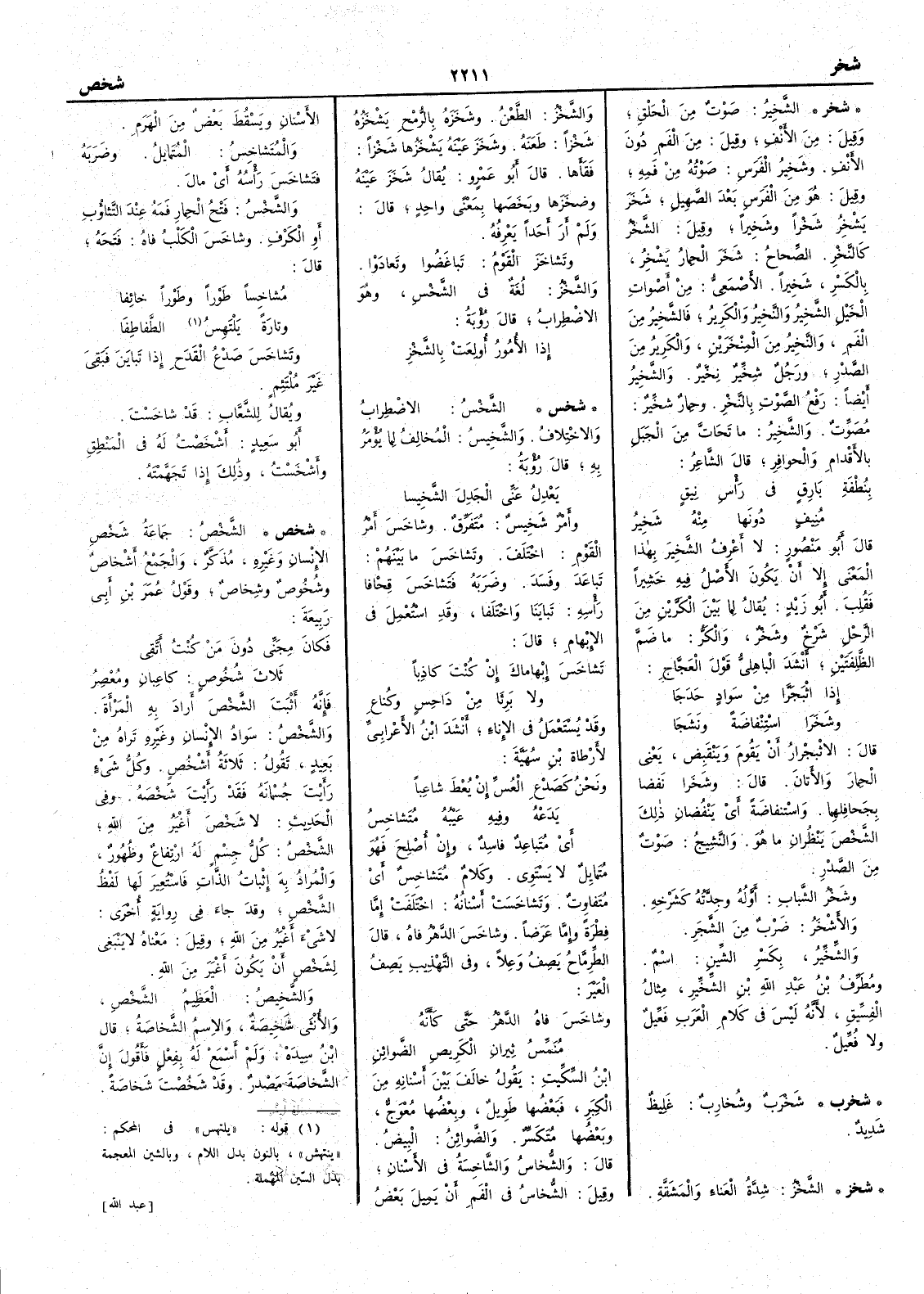 ( شخرب ) شَخْرَبٌ وشُخارِبٌ غليظٌ شديد ( شخز ) الشَّخْزُ شدّة العَناء والمشقة والشَّخْزُ الطَّعن وشَخَزَه بالرمح يَشْخَزُه شَخْزاً طعنه وشَخَز عينه يَشْخَزُها شَخْزاً فقأَها قال أَبو عمرو يقال شَخَزَ عينه وضَخَزَها وبَخَصَها بمعنى واحد قال ولم أَر أَحداً يعرفه وتَشاخَزَ القوم تباغضوا وتَعادَوْا والشَّخْز لغة في الشَّخْسِ وهو الاضطراب قال رؤبة إِذا الأُمورُ أُولِعَتْ بالشَّخْزِ ( شخس ) الشَخْسُ الاضطراب والاختلاف والشَّخيس المخالف لما يؤْمر به قال رؤْبة يَعْدِلُ عني الجَدِلَ الشَّخِيسا وأَمر شَخيسٌ متفرّق وشاخَسَ أَمْرُ القوم اختلف وتَشاخَسَ ما بينهم تباعد وفسد وضربه فتَشاخَسَ قِحْفا رأْسه تباينا واختلفا وقد استعمل في الإِبهام قال تَشاخَسَ إِبهاماكَ إِن كنت كاذِباً ولا بَرِثا من دَاحِسٍ وكُناعِ وقد يستعمل في الإِناء أَنشد ابن الأَعرابي لأَرْطاةَ ابن سُهَيَّة ونحن كَصَدْعِ العُسِّ إِن يُعْطَ شاعِباً يَدَعْهُ وفيه عَيْبُه مُتَشاخِسُ أَي متباعد فاسد وإِن أُصلح فهو متمايل لا يستوي وكلام مُتَشاخِسٌ أَي متفاوت وتَشاخَسَتْ أَسنانه اختلفت إِما فِكْرَةً وإِما عَرَضاً وشاخَسَ الدهرُ فاه قال الطِّرِمَّاح يصف وَعِلاً وفي التهذيب يصف العَيْرَ وشاخَسَ فاء الدَّهْرُ حتى كأَنه مُنَمِّسُ ثيرانِ الكَريصِ الضَّوائن ابن السكيت يقول خالف بين أَسنانه من الكِبَر فبعضها طويل وبعضها مُعْوَج وبعضها متكسر والضوائن البيض قال والشُّخاسُ والشاخِسَة في الأسنان وقيل الشُّخاسُ في الفم أَن يميل بعض الأَسنان ويسقط بعض من الهَرَم والمُتَشاخِسُ المتمايل وضربه فتَشاخَسَ رأَسُه أَي مال والشَّخْسُ فتح الحمار فمه عند التشاؤب أَو الكَرْفِ وشاخَسَ الكلبُ فاه فتحه قال مَشاخِساً طَوْراً وطَوراً خائفا وتارَةً يَلْتَهِسُ الطَّفاطِفا وتَشاخَسَ صَدْعُ القَدَح إِذا تَبايَنَ فبقي غير ملتئم ويقال للشَّعَّاب قد شاخَسْتَ أَبو سعيد أَشْخَصْتُ له في المنطق وأَشْخَسْتُ وذلك إِذا تَجَهَّمْتَه
