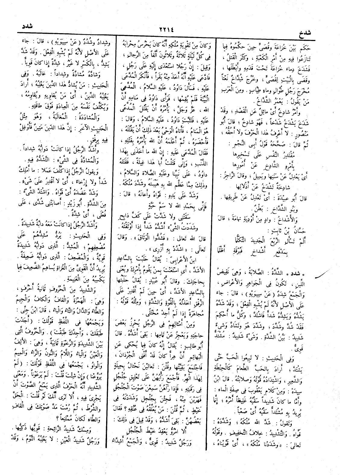 ( شدد ) الشِّدَّةُ الصَّلابةُ وهي نَقِيضُ اللِّينِ تكون في الجواهر والأَعراض والجمع شِدَدٌ عن سيبويه قال جاء على الأَصل لأَنه لم يُشْبِهِ الفعل وقد شَدَّه يَشُدُّه ويَشِدُّه شَدّاً فاشْتَدَّ وكلُّ ما أُحْكِمَ فقد شُدَّ وشُدِّدَ وشَدَّدَ هو وتشَادّ وشيء شَدِيدٌ بَيِّنُ الشِّدَّةِ وشيء شَديدٌ مُشتَدٌّ قَوِيٌّ وفي الحديث لا تَبيعُوا الحَبَّ حتى يَشْتَدَّ أَراد بالحب الطعام كالحنطة والشعير واشتدَادُه قُوَّتُه وصلابَتُه قال ابن سيده ومن كلام يعقوب في صفة الماء وأَما ما كان شديداً سَقْيُهُ غليظاً أَمرُهُ إِنما يرِيدُ به مُشْتَدّاً سَقْيُه أَي صعباً وتقول شَدَّ اللَّهُ مُلْكَه وشَدَّدَه قَوَّاه والتشديد خلاف التخفيف وقوله تعالى وشدَدْنا ملكَه أَي قوَّيناه وكان من تقوية ملكِه أَنه كان يَحْرسُ محرابه في كل ليلة ثلاثة وثلاثون أَلفاً من الرجال وقيل إِن رجلاً اسْتَعْدَى إِليه على رجل فادّعى عليه أَنه أَخذ منه بقراً فأَنكر المدّعَى عليه فسأَل داودُ عليه السلام المدّعيَ البينة فلم يُقِمْها فرأَى داودُ في منامه أَن الله عز وجل يأْمره أَن يقتل المَدّعَى عليه فتثبت داود عليه السلام وقال هو المنام فأَتاه الوحي بعد ذلك أَن يقتله فأَحضره ثم أَعلمه أَن الله يأْمرُه بقتله فقال المدّعَى عليه إِن الله ما أَخَذَني بهذا الذنب وإِني قتلت أَبا هذا غِيلَة فقتله داود على نبينا وعليه الصلاة والسلام وذلك مما عظَّمَ الله به هَيْبَتَه وشدَّدَ ملْكه وشدَّ على يده قوَّاه وأَعانه قال فإِني بحَمْدِ اللَّهِ لا سَمَّ حَيَّةٍ سَقَتْني ولا شَدَّتْ على كفِّ ذابح وشَدَدْتُ الشيءَ أَشُدُّه شَدّاً إِذا أَوثَقْتَه قال الله تعالى فشُدُّوا الوَثاق وقال تعالى اشْدُدْ به أَزري ابن الأَعرابي يقال حَلَبْتَ بالساعِدِ الأَشَدِّ أَي استعَنْتَ بمن يقومُ بأَمرك ويُعْنى بحاجتك وقال أَبو عبيد يقال حَلَبْتُها بالساعِدِ الأَشَدِّ أَي حين لم أَقْدِر على الرِّفْق أَخَذْتُه بالقُوَّةِ والشِّدَّةِ ومثلُه قوله مُجاهرَةً إِذا لم أَجِدْ مُخْتَلى ومن أَمثالهم في الرجل يحرز بعض حاجته ويَعْجِز عن تمامها بَقِيَ أَشَدُّه قال أَبو طالب يقال إِنه كان فيما يحكى عن البهائم أَن هرّاً كان قد أَفنى الجُرْذان فاجتمع بقيتها وقلن تعالَيْن نحتال بحيلة لهذا الهرّ فأَجمع رأْيُهن على تعليق جُلْجُل في رقبته فإِذا رآهن سمعن صوت الجلجل فهربن منه فجئن بجلجل وشددنه في خيط ثم قلن من يعلقه في عنقه ؟ فقال بعضهن بقي أَشَدُّه وقد قيل في ذلك أَلا آمْرُؤٌ يَعْقِدُ خَيْطَ الجُلْجُلِ ورجل شديدٌ قويٌّ والجمع أَشِدّاءُ وشِدادٌ وشُددٌ عن سيبويه قال جاء على الأَصل لأَنه لم يشبه الفعل وقد شَدَّ يشِدّ بالكسر لا غير شِدَّةً إِذا كان قويّاً وشادَّه مُشادَّة وشِداداً غالبه وفي الحديث مَن يُشادّ هذا الدِّينَ يَغْلِبُه أَراد يَغْلِبُه الدينُ أَي من يُقاويه ويعاوِمُه ويُكَلِّف نفسه من العبادة فوق طاقته والمُشادَدَة المُغالَبَة وهو مثل الحديث الآخر إِن هذا الدينَ مَتِينٌ فأَوْغِلْ فيه برفق وأَشَدَّ الرجلُ إِذا كانت دوابُّه شِداداً والمُشادَّة في الشيء التَّشَدُّد فيه ويقال للرجل