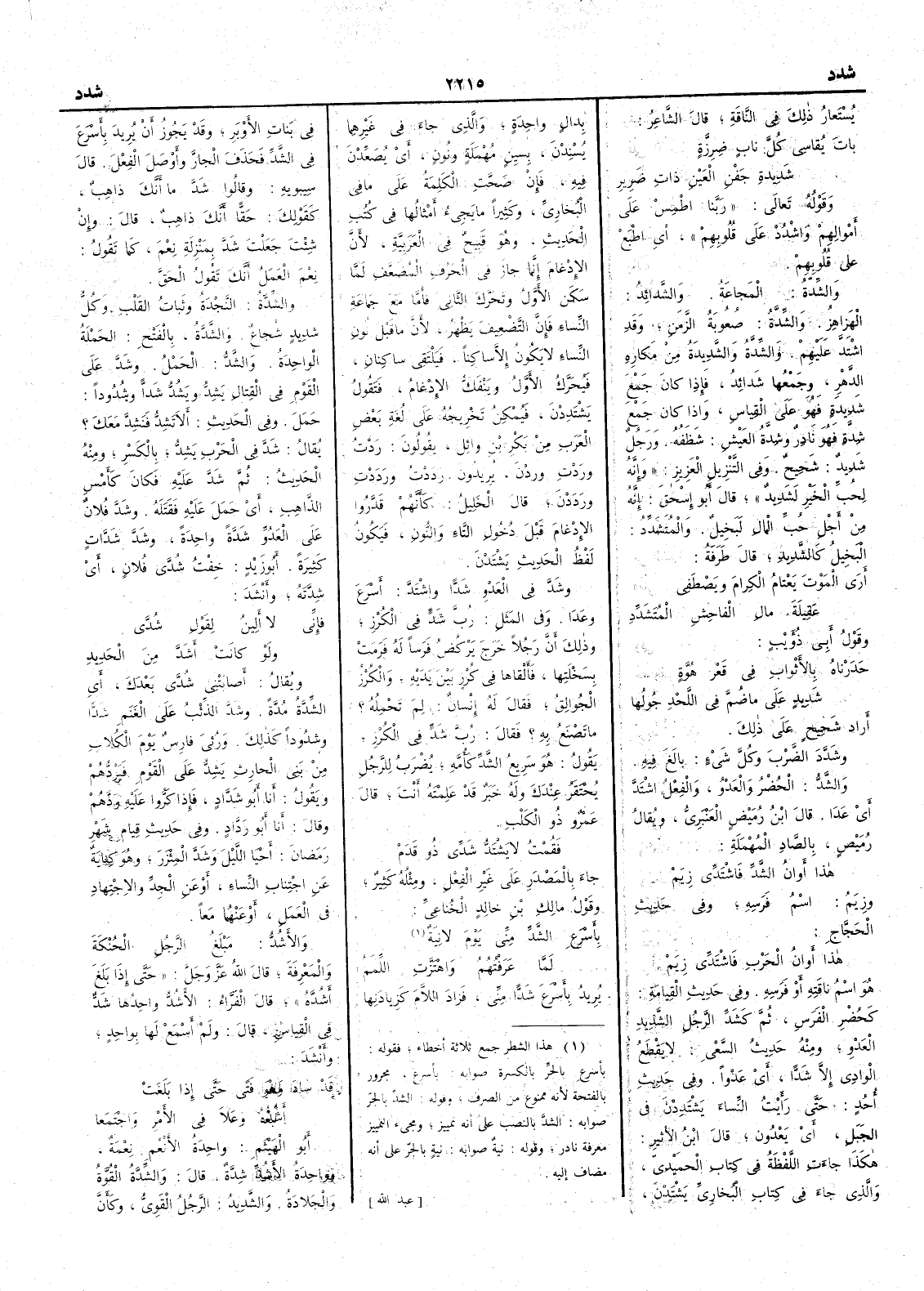 يستعار ذلك في الناقة قال الشاعر باتَ يقاسى كلَّ نابٍ ضِرِزَّةٍ شَديدةِ حَفْنِ العَينِ ذاتِ ضَرِيرِ وقوله تعالى ربنا اطمس على أَموالهم واشدد على قلوبهم أَي اطبع على قلوبهم والشِّدَّة المَجاعة والشَّدائِدُ الهَزاهِزُ والشِّدَّة صعوبة الزمن وقد اشتدَّ عليهم والشِّدَّة والشَّدِيدَةُ من مكاره الدهر وجمعها شَدائد فإِذا كان جمع شديدة فهو على القياس وإِذا كان جمع شدّة فهو نادر وشِدَّة العيْش شَظَفُه ورجل شَدِيد شحيح وفي التنزيل العزيز وإِنه لحبِّ الخيرِ لشديد قال أَبو إِسحق إِنه من أَجل حُبِّ المال لبخيل والمُتَشَدِّدُ البخيل كالشديد قال طرفة أَرى المَوْتَ يَعْتامُ الكِرامَ ويَصْطَفي عَقِيلَةَ مالِ الفاحِشِ المُتَشَدِّدِ وقول أَبي ذؤَيب حَدَرْناهُ بالأَثوابِ في قَعْرِ هُوَّةٍ شديدٍ على ما ضُمَّ في اللَّحْدِ جُولُها أَراد شَحِيحٍ على ذلك وشَدَّدَ الضَّرْبَ وكلَّ شيء بالَغَ فيه والشَّدُّ الحُضْرُ والعَدْوُ والفعل اشْتَدَّ أَي عدا قال ابن رُمَيْضٍ العنبري ويقال رُمَيْصٍ بالصاد المهملة هذا أَوانُ الشَّدِّ فاشْتَدِّي زِيَمْ وزِيَم اسم فرسه وفي حديث الحجاج هذا أَوانُ الحرب فاشْتَدِّي زِيَمْ هو اسم ناقته أَو فرسه وفي حديث القيامة كحُضْرِ الفَرَس ثم كشَدِّ الرجل الشَّديدِ العَدْوِ ومنه حديث السَّعْي لا يَقْطَع الوادي إِلاَّ شَدّاً أَي عَدْواً وفي حديث أُحد حتى رأَيت النساء يَشْتَدِدْنَ في الجبل أَي يَعْدُون قال ابن الأَثير هكذا جاءت اللفظة في كتاب الحميدي والذي جاء في كتاب البخاري يشْتَدْنَ بدال واحدة والذي جاء في غيرهما يُسْنِدْنَ بسين مهملة ونون أَي يُصَعِّدْنَ فيه فإِن صحت الكلمة على ما في البخاري وكثيراً ما يجيءُ أَمثالها في كتب الحديث وهو قبيح في العربية لأَن الإِدغام إِنما جاز في الحرف المُضَعَّفِ لما سكن الأَول وتحرك الثاني فأَما مع جماعة النساء فإِن التضعيف يظهر لأَن ما قبل نون النساء لا يكون إِلا ساكناً فيلتقي ساكنان فيحرك الأَوّل وينفك الإِدغام فتقول يشتددن فيمكن تخريجه على لغة بعض العرب من بكر بن وائل يقولون رَدْتُ ورَدْتِ وَرَدْنَ يريدون رَدَدْتُ ورَدَدْتِ ورَدَدْنَ قال الخليل كأَنهم قدروا الإِدغام قبل دخول التاء والنون فيكون لفظ الحديث يَشْتَدْنَ وشدّ في العَدْوِ شدّاً واشْتَدَّ أَسْرَعَ وعَدَا وفي المثل رُبَّ شَدٍّ في الكُرْزِ وذلك أَنّ رجلاً خرج يركض فرساً له فرمت بِسَخْلَتِها فأَلقاها في كُرْزٍ بين يديه والكرز الجُوالِقُ فقال له إِنسان لِمَ تحمله ما تصنع به ؟ فقال رُبَّ شَدٍّ في الكُرْزِ يقول هو سريع الشدِّ كأُمه يُضْرَبُ للرجل يُحْتَقَرُ عندك وله خَبَرٌ قد علمته أَنت قال عمرو ذو الكلب فَقُمْتُ لا يَشْتَدُّ شَدِّي ذو قَدَم جاء بالمصدر على غير الفعل ومثله كثير وقول مالك بن خالد الخُناعي بأَسَرعِ الشَّدِّ مني يومَ لا نِيَةٌ لَمَّا عَرَفْتُهم واهْتَزَّتِ اللِّمَمُ يريد بأَسَرعَ شدّاً مني فزاد اللام كَزيادتها في بنات الأَوبر وقد يجوز أَن يريد بأَسرعَ في الشد فحذف الجار وأَوصَلَ الفِعْلَ قال سيبويه وقالوا شَدَّ ما أَنَّكَ ذاهب كقولك حَقّاً أَنك ذاهب قال وإِن شئت جعلت شَدَّ بمنزلة نِعْمَ كما تقول نِعْمَ العملُ أَنك تقولُ الحَقَّ والشِّدَّة النَّجْدَة وثَباتُ القلب وكلُّ شَديدٍ شُجاعٌ والشَّدة بالفتح الحملة الواحدة والشَّدُّ الحَمْل وشَدَّ على القوم في القتال يَشِدُّ ويَشُدُّ شَدّاً وشُدوداً حَمَلَ وفي الحديث أَلا تَشِدُّ فَنَشِدَّ معك ؟ يقال شَدَّ في الحرب يَشِد بالكسر ومنه الحديث ثم شَدَّ عليه فكان كأَمْسِ الذاهب أَي حَمَلَ عليه فقتله وشَدَّ فلان على العدوِّ شَدَّة واحدة وشدَّ شَدَّاتٍ كثيرة أَبو زيد خِفْتُ شُدَّى فلانٍ أَي شِدَّته وأَنشد فإِني لا أَلِينُ لِقَوْلِ شُدَّى ولو كانتْ أَشَدَّ من الحَديدِ ويقال أَصابَتْني شُدَّى بعدك أَي الشِّدَّةُ مُدَّةً وشَدَّ الذئب على الغنم شَدّاً وشُدُوداً كذلك ورُؤِيَ فارس 