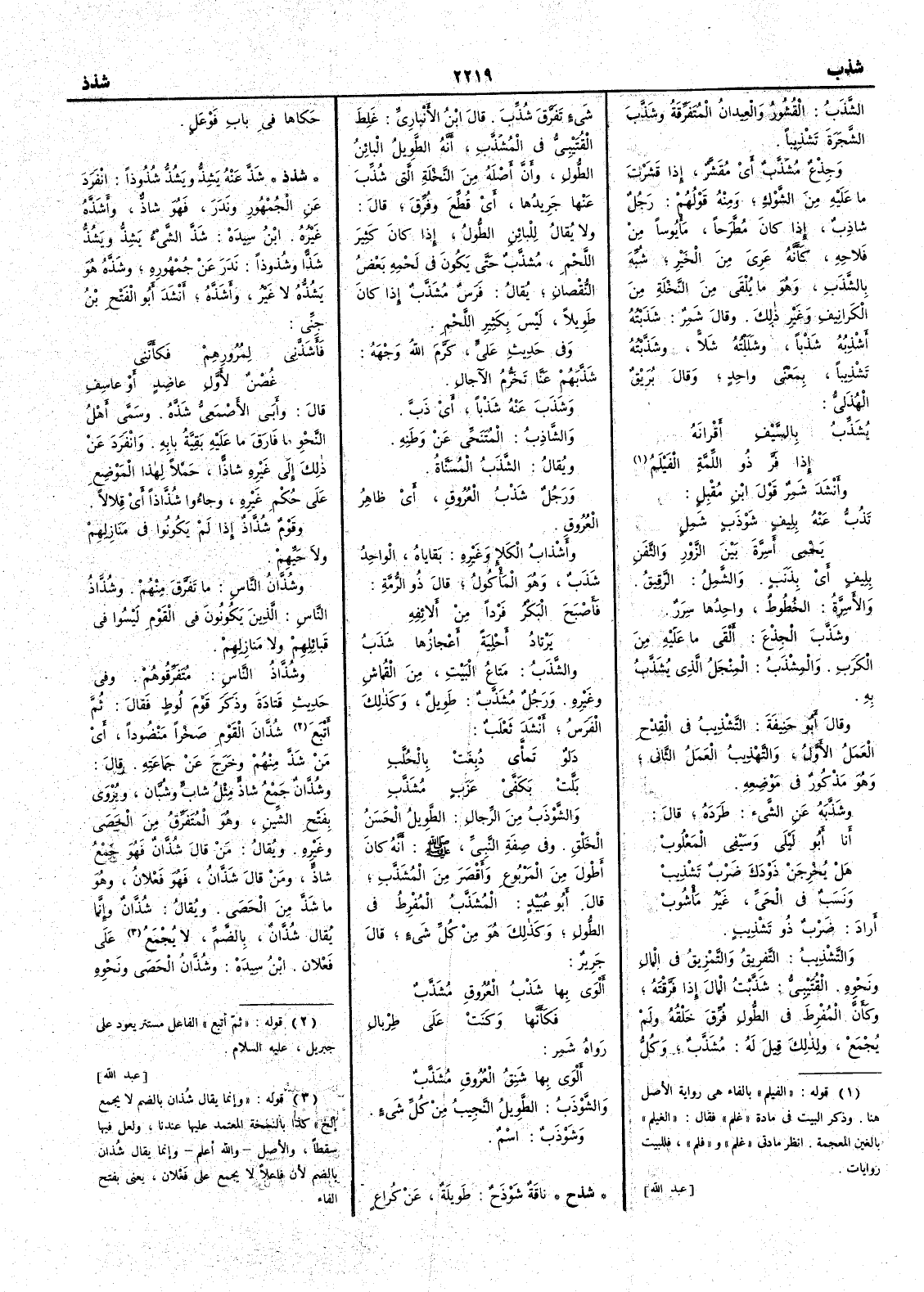 بِلِيفٍ أَي بذَنَبٍ والشَّمِلُ الرَّقِيقُ والأَسِرَّةُ الخُطوطُ واحدها سِرَرٌ وشَذَّبَ الجِذْعَ أَلقَى ما عليه من الكَرَبِ والمِشْذَبُ المِنْجَلُ الذي يُشَذَّبُ به وقال أَبو حنيفة التَّشْذيبُ في القِدْحِ العَملُ الأَوَّلُ والتهذيبُ العملُ الثاني وهو مذكور في موضعه وشَذَّبَه عن الشيء طَرَده قال أَنا أَبو ليْلى وسَيْفِي المَعْلُوبْ هل يُخْرِجَنْ ذَوْدَكَ ضَرْبٌ تَشْذيبْ ونَسَبٌ في الحَيِّ غَيرُ مَأْشُوبْ أَراد ضَرْبٌ ذو تَشْذيبٍ والتَّشْذِيبُ التَّفريقُ والتَّمزيقُ في المال ونحوه القتيبي شذَّبْتُ المالَ إِذا فرَّقْته وكأَنَّ المُفْرِطَ في الطُّول فُرِّقَ خَلْقُه ولم يُجْمَع ولذلك قيل [ ص 487 ] له مُشَذَّبٌ وكلُّ شيء تَفَرَّقَ شُذِّبَ قال ابن الأَنباري غلط القتيبي في المُشَذّب أَنه الطويلُ البائنُ الطُّول وأَن أَصله من النخلة التي شُذِّبَ عنها جَريدها أَي قُطِّعَ وفُرِّقَ قال ولا يقال للبائنِ الطُّول إِذا كان كثير اللحم مُشذَّبٌ حتى يكون في لحمه بعضُ النُّقْصان يقال فرسٌ مُشَذَّبٌ إِذا كان طويلاً ليس بكثير اللحم وفي حديث علي كرّم اللّه وجهه شَذَّبهم عَنا تَخَرُّم الآجال وشَذَبَ عنه شَذْباً أَي ذَبَّ والشَّاذِبُ المُتَنَحِّي عن وطنه ويقال الشَّذَبُ المُسَنَّاة ورجل شَذْبُ العُروقِ أَي ظاهِرُ العُرُوقِ وأَشْذابُ الكلإِ وغيرِه بَقاياه الواحد شَذَبٌ وهو المأْكول قال ذوالرمة