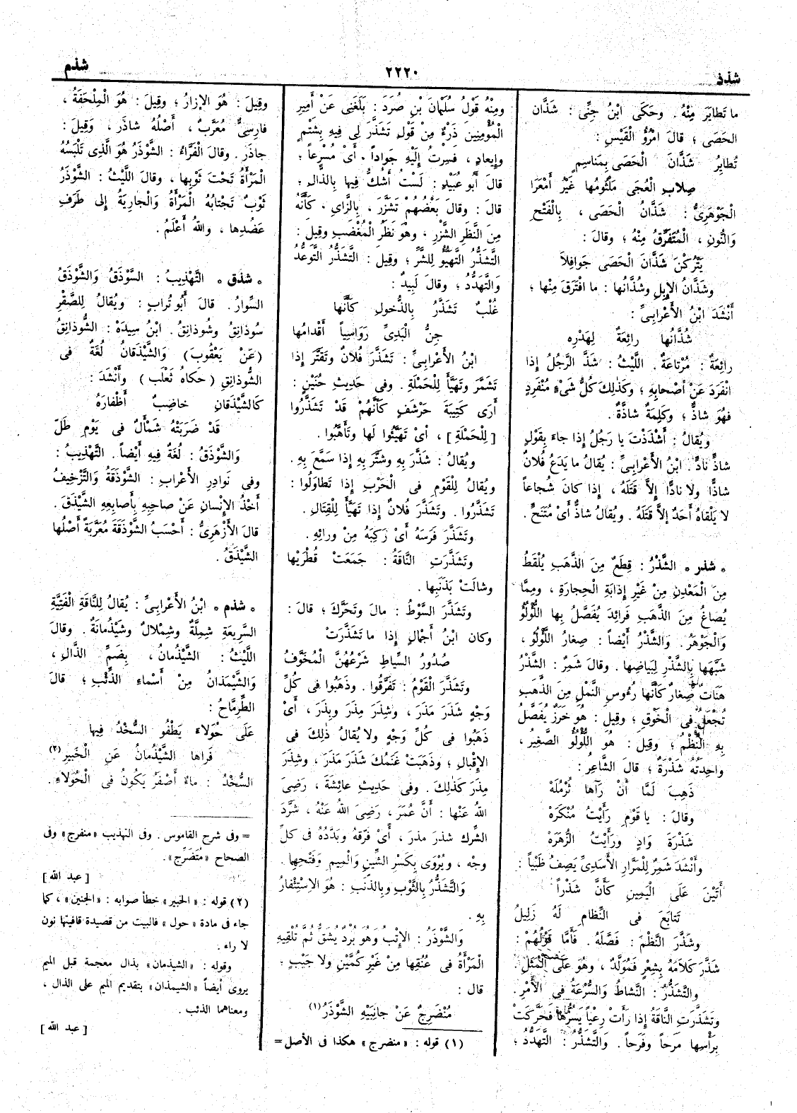 ما تطاير منه وحكى ابن جني شَذَّان الحصى قال امروء القيس تُطاير شَذَّانَ الحَصى بِمَناسِم صِلاب العُجى مَلْثومها غَيرُ أَمعرا الجوهري شَذان الحصى بالفتح والنون المتفرق منه وقال يتركن شَذَّانَ الحَصى جَوافِلا وشَذَّانُ الإِبل وشُذَّانُها ما افترق منها أَنشد ابن الأَعرابي شُذَّانُها رائعة لِهَدْرِه رائعة مرتاعة الليث شذ الرجل إِذا انفرد عن أَصحابه وكذلك كل شيء منفرد فهو شاذ وكلمة شاذة ويقال أَشْذَذْتَ يا رجل إِذا جاء بقول شاذٍّ نادٍّ ابن الأَعرابي يقال ما يدع فلان شاذّاً ولا نادّاً إِلا قتله إِذا كان شجاعاً لا يلقاه أَحد إِلا قتله ويقال شاذّ أَي متنحٍّ