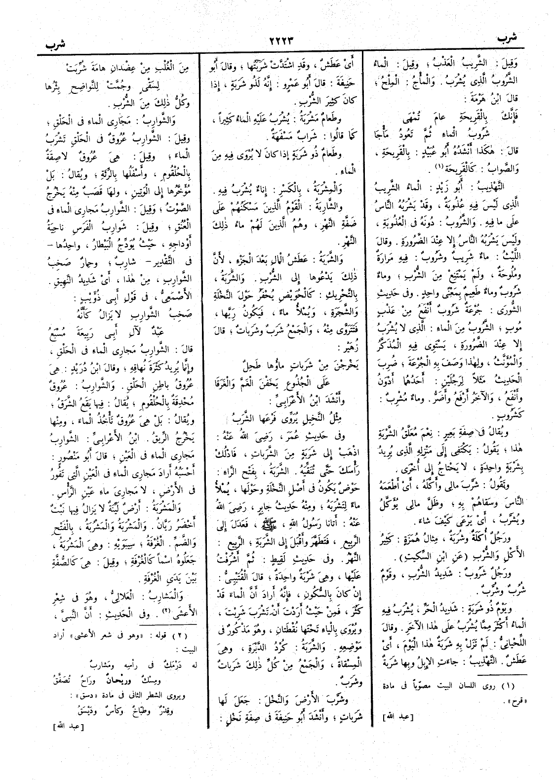 قال هكذا أَنشده أَبو عبيد بالقَرِيحة والصواب كالقَرِيحةِ التهذيب أَبو زيد الماء الشَّريبُ الذي ليس فيه عُذوبةٌ وقد يَشْرَبُه الناسُ على ما فيه والشَّرُوبُ دُونهُ في العُذوبةِ وليس يَشْرَبُه الناس إِلاّ عند الضَّرُورة وقال الليث ماء شَرِيبٌ وشَرُوب فيه مَرارةٌ ومُلُوحة ولم يمتنع من الشُّرْب وماء شَرُوبٌ وماء طَعِيمٌ بمعنى واحد وفي حديث الشورى جُرْعةٌ شَرُوبٌ أَنْفَع من عَذْبٍ مُوبٍ الشَّرُوبُ من الماءِ الذي لا يُشْرَب إِلاّ عند الضرورة يستوي فيه المذكر والمؤَنث ولهذا وصف به الجُرْعةَ ضرب الحديث [ ص 490 ] مثلاً لرجلين أَحدهما أَدْوَنُ وأَنفعُ والآخر أَرفعُ وأَضرُّ وماءٌ مُشْرِبٌ كَشَروبٍ ويقال في صِفَةِ بَعِيرٍ نِعْمَ مُعَلَّقُ الشَّرْبةِ هذا يقول يكتفي إِلى منزله الذي يريدُ بشَرْبةٍ واحدة لا يَحْتاجُ إِلى أُخرى وتقول شَرَّبَ مالي وأَكَّلَه أَي أَطْعَمه الناسَ وسَقاهُم به وظَلَّ مالي يُؤَكَّل ويُشَرَّب أَي يَرْعَى كيف شاءَ ورجل أُكَلةٌ وشُرَبةٌ مثال هُمَزةٍ كثير الأَكل والشُّرب عن ابن السكيت ورجلٌ شَرُوبٌ شديدُ الشُّرْبِ وقومٌ شُرُبٌ وشُرَّبٌ ويومٌ ذو شَرَبةٍ شديدُ الحَرِّ يُشْرَبُ فيه الماءُ أَكثر مما يُشْرَب على هذا الآخر وقال اللحياني لم تَزَلْ به شَرَبَةٌ هذا اليومَ أَي عَطَشٌ التهذيب جاءَت الإِبل وبها شَرَبةٌ أَي عطَش وقد اشْتَدَّتْ شَرَبَتُها وقال أَبو حنيفة قال أَبو عمرو إِنه لذو شَرَبةٍ إِذا كان كثير الشُّرب وطَعامٌ مَشْرَبةٌ يُشْرَبُ عليه الماء كثيراً كما قالوا شَرابٌ مَسْفَهةٌ وطَعامٌ ذو شَرَبة إِذا كان لا يُرْوَى فيه من الماءِ والمِشْرَبةُ بالكسر إِناءٌ يُشْرَبُ فيه والشَّارِبةُ القوم الذين مسكنهم على ضَفَّة النهر وهم الذين لهم ماء ذلك النهر والشَّرَبةُ عَطَشُ المالِ بعدَ الجَزءِ لأَنَّ ذلك يَدْعُوها إِلى الشُّرْب والشَّرَبةُ بالتحريك كالحُوَيْضِ يُحْفَرُ حولَ النخلةِ والشجرة ويُمْلأُ ماء فيكون رَيَّها فَتَتَرَوَّى منه والجمع شَرَبٌ وشَرَباتٌ قال زهير