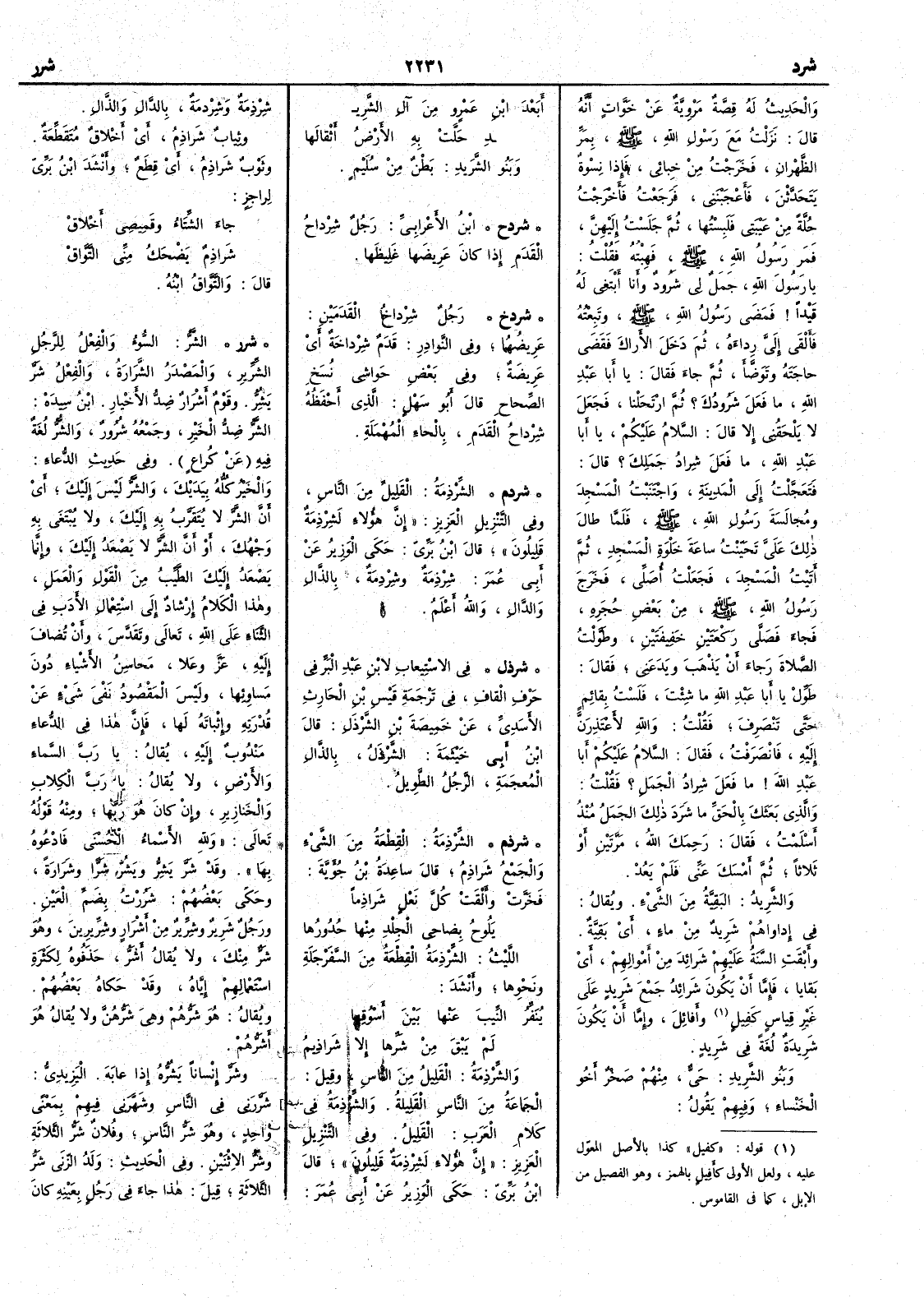 ( * قوله « كفيل » كذا بالأَصل المعوّل عليه ولعل الأَولى كأفيل بالهمز وهو الفصيل من الإبل كما في القاموس ) وأَفائِلَ وإِما أَن يكون شَريدَةٌ لغة في شَريد وينو الشَّريدِ حَيٌّ منهم صخر أَخو الخنساء وفيهم يقول أَبَعْدَ ابنِ عَمْرٍو من آلِ الشَّر ي دِ حَلَّتْ به الأَرضُ أَثْقالَها وبنو الشَّريدِ بَطْنٌ مِنْ سُلَيْم ( شردح ) ابن الأَعرابي رجل شِرْداحُ القَدَمِ إِذا كان عريضها غليظها ( شردخ ) رجل شِرْداخُ القدمين عريضهما وفي النوادر قَدَمٌ شِرْداخة أَي عريضة وفي بعض حواشي نسخ الصحاح قال أَبو سهل الذي أَحفظه شِرْداح القدم بالحاءِ المهملة ( شردم ) الشِّرْذِمَةُ القليل من الناس وفي التنزيل العزيز إِنَّ هؤلاء لَشِرْذِمةٌ قليلون قال ابن بري حكى الوزير عن أَبي عمر شِرْذِمَة وشِرْدِمَة بالذال والدال والله أعلم ( شرذل ) في الاستيعاب لابن عبد البر في حرف القاف في ترجمة قيس بن الحرث الأَسدي عن خَمِيصة بن الشَّرْذَل قال ابن أَبي خَيْثَمة الشَّرْذَل بالذال المعجمة الرجلُ الطويل ( شرذم ) الشِّرْذِمةُ القِطْعة من الشيء والجمع شَراذِمُ قال ساعدة بن جؤية فَخَرَّتْ وأَلْقَتْ كلَّ نَعْلٍ شَراذِماً يَلُوحُ بضاحي الجِلْدِ منها حُدُورُها الليث الشِّرْذِمةُ القطعة من السَّفَرْجَلة ونحوها وأَنشد يُنَفِّرُ النِّيبَ عنها بَيْنَ أَسْوُقِها لم يَبْقَ من شَرِّها إِلاَّ شَراذِيمُ والشِّرْذِمةُ القليل من الناس وقيل الجماعةُ من الناس القليلة والشِّرْذمة في كلام العرب القليلُ وفي التنزيل العزيز إِن هؤلاء لشِرْذمة قليلون قال ابن بري حكى الوزير عن أَبي عُمَر شِرْذِمة وشِرْدِمة بالدال والذال وثياب شراذِمُ أَي أَخْلاق متقطعة وثوب شَراذمُ أَي قِطَعٌ وأَنشد ابن بري لراجز جاء الشِّتاءُ وقَمِيصي أَخْلاقْ شَراذِمٌ يَضْحَكُ مني التَّوَّاقْ قال والتَّوَّاق ابنه