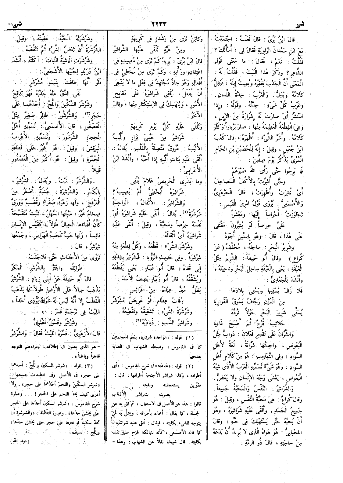 ( * قوله « الواحدة شرشرة » بضم المعجمتين كما في القاموس وضبطه الشهاب في العناية بفتحهما ) يقال أَلقى عليه شراشره أَي نفسه حرصاً ومحبة وقيل أَلقى عليه شَراشره أَي أَثقاله وشَرْشَرَ الشيءَ قَطَّعَهُ وكل قطعة منه شِرْشِرَةٌ وفي حديث الرؤيا فَيُشَرْشِرُ بِشِدْقِهِ إِلى قَفاه قال أَبو عبيد يعني يُقَطِّعُهُ ويُشَقِّقُهُ قال أَبو زبيد يصف الأَسد يَظَلُّ مُغِبّاً عِنْدَهُ مِنْ فَرَائِسٍ رُفَاتُ عِظَامٍ أَو عَرِيضٌ مُشَرشَرُ وشَرْشَرَةُ الشيء تَشْقِيقُهُ وتقطيعه وشَرَاشِرُ الذنَب ذَباذِبُهُ وشَرْشَرَتْهُ الحية عَضَّتْهُ وقيل الشَّرْشَرَةُ أَن تَعَضَّ الشيء ثم تنفضه وشَرْشَرَتِ الماشِيَةُ النباتَ أَكلته أَنشد ابن دريد لجُبَيْها الأَشْجَعِيِّ فَلَوْ أَنَّهَا طافَتْ بِنَبْتٍ مُشَرْشَرٍ نَفَى الدِّقَّ عنه جَدْبُه فَهْوَ كَالحُ وشَرْشَرَ السِّكِّين واللحم أَحَدَّهما على حجر والشُّرْشُور طائر صغير مثل العصفور قال الأَصمعي تسميه أَهل الحجاز الشُّرْشُورَ وتسميه الأَعراب البِرْقِشَ وقيل هو أَغبر على لطافة الحُمَّرَةِ وقيل هو أَكبر من العصفور قليلاً والشَّرْشَرُ نبت ويقال الشَّرْشِرُ بالكسر والشَّرْشِرَةُ عُشْبَة أَصغر من العَرْفَج ولها زهرة صفراء وقُضُبٌ وورق ضخام غُبْرٌ مَنْبِتُها السَّهْلُ تنبت متفسحة كأَن أَقناءها الحِبالُ طولاً كَقَيْسِ الإِنسان قائماً ولها حب كحب الهَرَاسِ وجمعها شِرْشِرٌ قال تَرَوَّى مِنَ الأَحْدَابِ حَتَّى تَلاحَقَتْ طَرَائِقُه واهْتَزَّ بالشِّرْشِرِ المَكْرُ قال أَبو حنيفة عن أَبي زياد الشِّرْشِرُ يذهب حِبالاً على الأَرض طولاً كما يذهب القُطَبُ إِلا أَنه ليس له شوك يؤذي أَحداً الليث في ترجمة قسر وشَِرْشَرٌ وقَسْوَرٌ نَصْرِيُّ قال الأَزهري فسره الليث فقال والشرشر