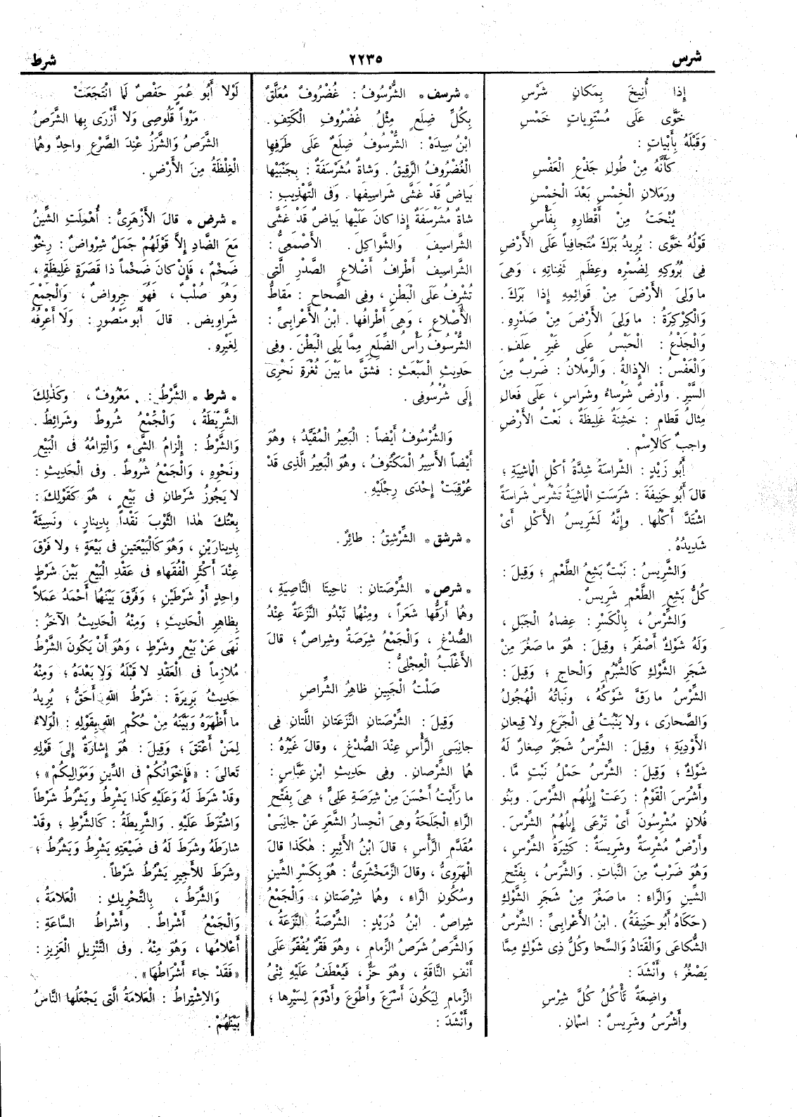 ( شرسف ) الشُّرْسُوفُ غُضْرُوفٌ مُعَلَّق بكل ضِلَعٍ مثل غُضْروفِ الكَتِف ابن سيده الشرسوف ضلع على طرفها الغُضْروفُ الرَّقِيقُ وشاةٌ مُشَرْسَفَةٌ بجنبيها بياض قد غَشَّى شَراسِيفَها وفي التهذيب شاةٌ مُشَرْسَفَةٌ إذا كان عليها بياض قد غَشَّى الشراسيفَ والشَّواكِلَ الأَصمعي الشَّراسيفُ أَطْرافُ أَضْلاعِ الصدْرِ التي تُشْرِفُ على البطن وفي الصحاح مَقاطُّ الأَضْلاعِ وهي أَطْرافُها ابن الأعرابي الشُّرْسُوفُ رأْسُ الضِّلَع مما يلي البطن وفي حديث المَبْعَث فَشَقَّ ما بين ثُغْرَةِ نَحْري إلى شُرْسُوفي والشُّرْسُوفُ أَيضاً البعير المُقَيَّدُ وهو أَيضاً الأَسير المكتوف وهو البعير الذي قد عُرْقِبَتْ إحدى رجليه ( شرشق ) الشِّرْشِق طائر( شرص ) الشِّرْصَتانِ ناحِيتا الناصِية وهما أَرَقُّها شَعَراً ومنهما تَبْدُو النَّزَعةُ عند الصُّدْغِ والجمع شِرَصةٌ وشِراصٌ قال الأَغلب العجلي صَلْت الجَبِينِ ظاهر الشِّراصِ وقيل الشِّرْصَتانِ النَّنزَعَتانِ اللتان في جانبِيَ الرأْس عند الصُّدْغ وقال غيره هما الشِّرْصان وفي حديث ابن عباس ما رأَيت أَحْسَنَ من شِرَصةِ عَليٍّ هي بفتح الراء الجَلَحةُ وهي انْحِسارُ الشعَرِ عن جانبي مُقَدَّم الرأْس قال ابن الأَثير هكذا قال الهروي وقال الزمخشري هو بكسر الشين وسكون الراء وهما شِرْصتانِ والجمع شِراصٌ ابن دريد الشِّرْصةُ النزَعةُ والشَّرَصُ شَرَصُ الزِّمامِ وهو فَقْرٌ يُفْقَرُ على أَنف الناقة وهو حَزٌّ فيُعْطَفُ عليه ثِنْيُ الزِّمام ليكون أَسْرَعَ وأَطْوَعَ وأَدْوَمَ لِسَيْرِها وأَنشد لولا أَبو عُمَرٍ حَفْصٌ لما انْتَجَعَتْ مَرْواً قلوصي ولا أَزْرى بها الشَّرَصُ الشَّرَصُ والشَّرَزُ عند الصَّرْع واحد وهما الغِلْظةُ من الأَرض