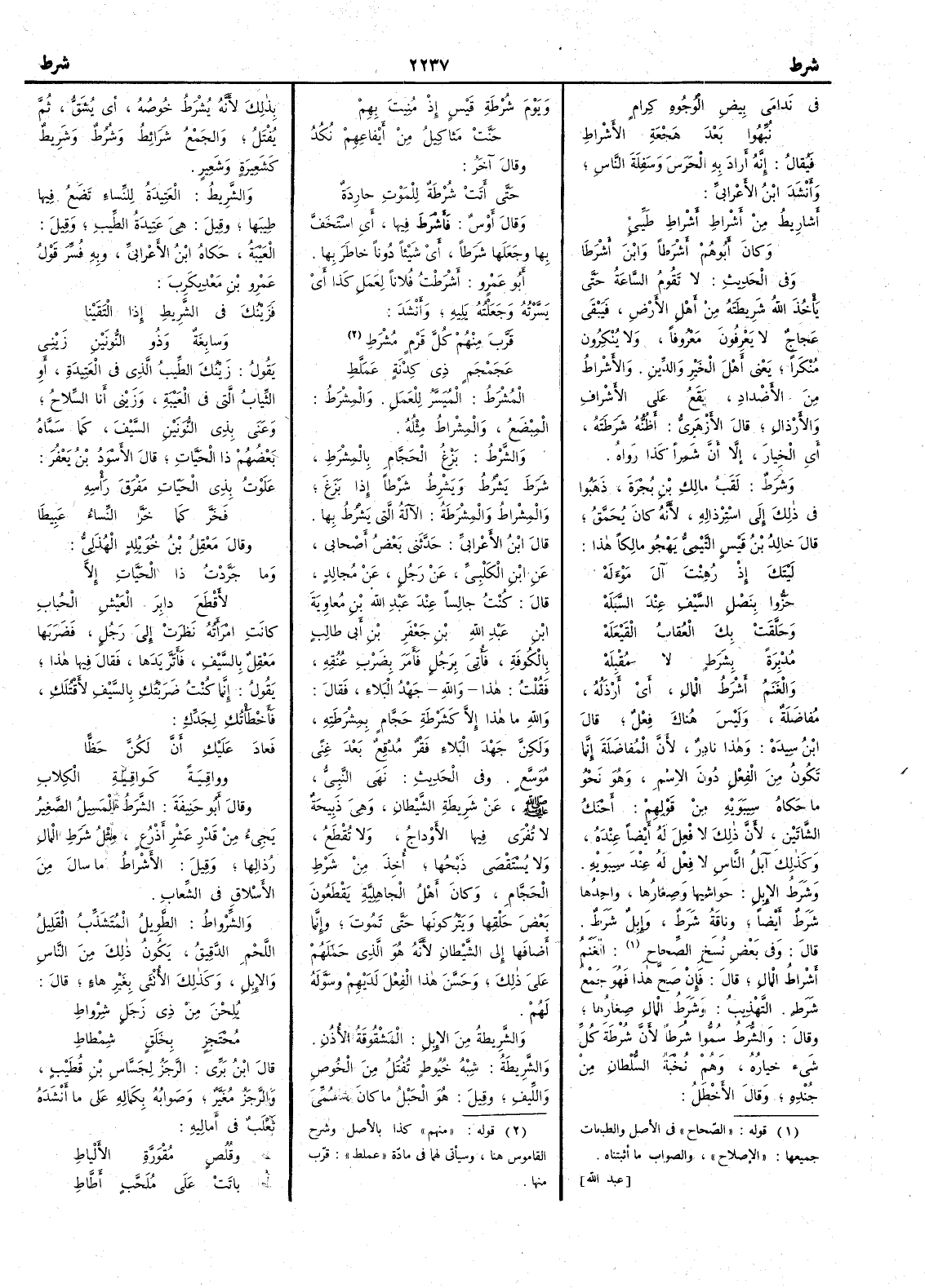 في نَدامى بِيضِ الوُجوهِ كِرامٍ نُبِّهُوا بَعْدَ هَجْعةِ الأَشْراطِ فيقال إِنه أَراد به الحرَسَ وسَفِلةَ الناس وأَنشد ابن الأَعرابي أَشارِيطُ من أَشْراطِ أَشْراطِ طَيِّءٍ وكان أَبوهمْ أَشْرَطاً وابْن أَشْرَطا وفي الحديث لا تقومُ الساعةُ حتى يأْخُذَ اللّهُ شريطتَه من أَهلِ الأَرض فيَبْقَى عَجاجٌ لا يَعْرِفون مَعْروفاً ولا يُنْكِرُون مُنْكَراً يعني أَهلَ الخيرِ والدِّينِ والأَشْراطُ من الأَضْداد يقع على الأَشراف والأَرذال قال الأَزهري أَظُنُّه شَرَطَتَه أَي الخِيارَ إِلا أَنَّ شمراً كذا رواه وشرَطٌ لقَب مالِكِ بن بُجْرَة ذهَبوا في ذلك إِلى اسْتِرْذالِه لأَنه كان يُحَمَّقُ قال خالد بن قيس التيْمي يهجُو مالكاً هذا لَيْتَكَ إِذ رَهِبْتَ آلَ مَوْأَلَهْ حَزُّوا بنَصْلِ السيْفِ عند السَّبَلهْ وحَلَّقَتْ بك العُقابُ القَيْعَلَهْ مُدْبِرةً بشَرَطٍ لا مُقْبِلَهْ والغنمُ أَشْرطُ المالِ أَي أَرْذَلُه مُفاضَلةٌ وليس هناك فِعْل قال ابن سيده وهذا نادِرٌ لأَن المُفاضلةَ إِنما تكون من الفعل دون الاسم وهو نحو ما حكاه سيبويه من قولهم أَحْنَكُ الشاتين لأَن ذلك لا فعل له أَيضاً عنده وكذلك آبَلُ الناسِ لا فِعْلَ له عند سيبويه وشَرَطُ الإِبلِ حَواشِيها وصِغارُها واحدها شَرَطٌ أَيضاً وناقة شَرَطٌ وإِبل شَرَطٌ قال وفي بعض نسخ الإِصلاح الغنمُ أَشْراطُ المال قال فإِن صح هذا فهو جمع شَرَط التهذيب وشَرَطُ المالِ صغارها وقال والشُّرَطُ سُمُّوا شُرَطاً لأَن شُرْطةَ كل شيء خِيارُه وهم نُخْبةُ السلطانِ من جُنده وقال الأَخطل ويَوْم شرْطةِ قَيْسٍ إِذْ مُنِيت بِهِمْ حَنَّتْ مَثاكِيلُ من أَيْفاعِهمْ نُكُدُ وقال آخر حتى أَتَتْ شُرْطةٌ للموْتِ حارِدةٌ وقال أَوْسٌ فأَشْرَط فيها أَي استخَفَّ بها وجعلها شَرَطاً أَي شيئاً دُوناً خاطَرَ بها أَبو عمرو أَشْرَطْتُ فلاناً لعمل كذا أَي يَسَّرْتُه وجعلته يليه وأَنشد قَرَّبَ منهم كلِّ قَرْمٍ مُشْرَطِ عَجَمْجَمٍ ذِي كِدْنةٍ عَمَلَّطِ المُشْرَطُ المُيَسَّرُ للعمل والمِشْرَطُ المِبْضَعُ والمِشْراطُ مثله والشَّرْطُ بَزْغُ الحَجّام بالمِشْرَطِ شَرَطَ يَشْرُطُ ويَشْرِطُ شَرْطاً إِذا بزَغ والمِشْراطُ والمِشْرَطةُ الآلةُ التي يَشْرُط بها قال ابن الأَعرابي حدثني بعض أَصحابي عن ابن الكَلْبي عن رجل عن مُجالِد قال كنت جالساً عند عبد اللّه بن معاوية بن عبد اللّه بن جعفر بن أَبي طالب بالكوفة فأُتِيَ برجل فأَمَر بضَرْبِ عُنقه فقلت هذا واللّهِ جَهْدُ البَلاء فقال واللّه ما هذا إِلا كشَرْطةِ حَجّامٍ بمشْرَطَتِه ولكن جهد البلاء فَقْر مُدْقِعٌ بعد غِنىً مُوسع وفي الحديث نَهى النبي صلّى اللّه عليه وسلّم عن شَرِيطةِ الشيطانِ وهي ذبيحة لا تُفْرَى فيها الأَوْداجُ ولا تُقْطَعُ ولا يُسْتَقْصَى ذبحُها أُخذ من شَرْط الحجام وكان أَهل الجاهلية يقطعون بعضَ حَلْقِها ويتركونها حتى تموتَ وإِنما أَضافها إِلى الشيطان لأَنه هو الذي حملهم على ذلك وحسّن هذا الفعلَ لدَيْهِم وسوّلَه لهم والشَّرِيطةُ من الإِبل المشقُوقةُ الأُذن والشَّرِيطةُ شِبْه خُيوطٍ تُفْتل من الخُوص واللِّيفِ وقيل هو الحبلُ ما كان سمي بذلك لأَنه يُشْرَطُ خُوصه أَي يُشَقُّ ثم يفتل والجمع شَرائطُ وشُرُطٌ وشَرِيطٌ كشَعيرة وشَعير والشَّرِطُ العَتِيدةُ للنساء تَضَعُ فيها طِيبَها وقيل هي عَتيدةُ الطِّيبِ وقيل العَيْبةُ حكاه ابن الأَعرابي وبه فُسِّر قولُ عَمْرو بن مَعْدِ يكَرِب فَزَيْنُكَ في الشَّرِيطِ إِذا التَقَيْنا وسابِغةٌ وذُو النُّونَيْنِ زَيْني يقول زَيْنُكَ الطِّيبُ الذي في العَتِيدةِ أَو الثيابُ التي في العَيْبة وزَيْني أَنا السِّلاحُ وعَنَى بذي النُّونين السيفَ كما سماه بعضهم ذا الحَيّاتِ قال الأَسود بن يَعْفُرَ عَلَوْتُ بِذي الحَيّاتِ مَفْرَقَ رأْسِه فَخَرَّ كما خَرَّ النِّساءُ عَبِيطَا وقال مَعْقِلُ بن خُوَيْلِد الهُذليّ وما جَرَّدْتُ ذا الحَيّاتِ إِلاّ 