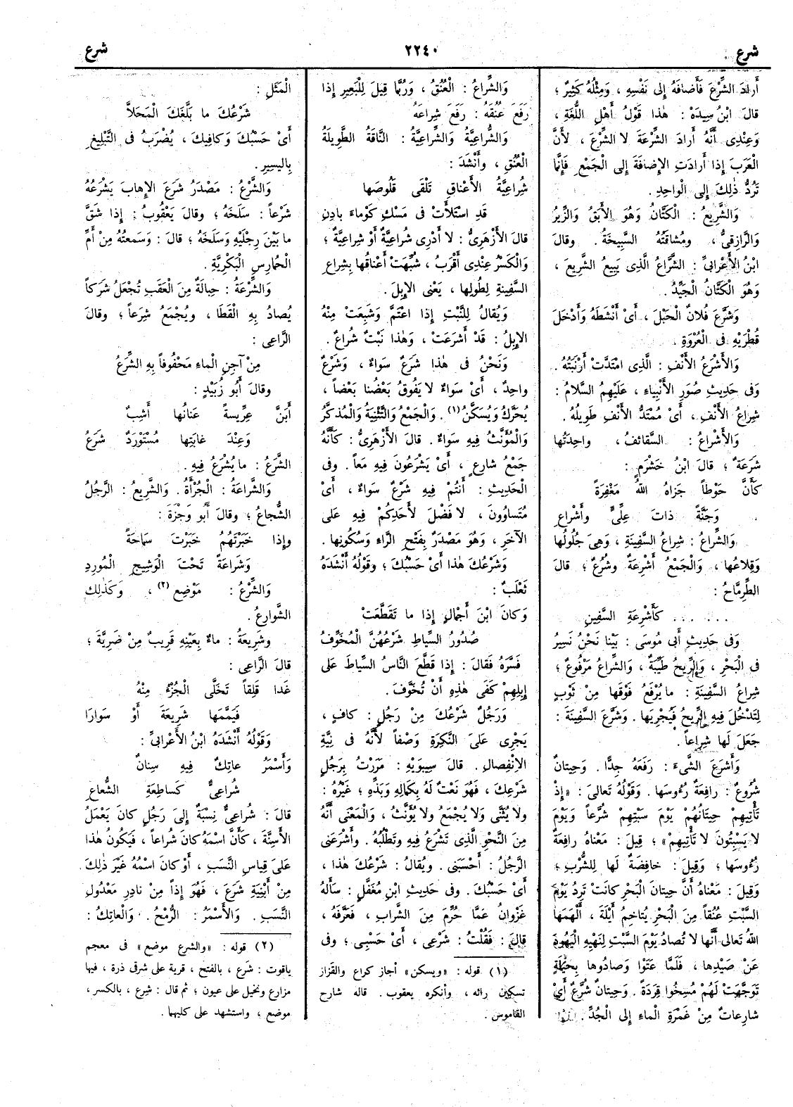 أَراد الشِّرْعَ فأَضافه إَلى نفسه ومثله كثير قال ابن سيده هذا قول أَهل اللغة وعندي أَنه أَراد الشِّرْعةَ لا الشِّرْعَ لأَنَّ العَرَبَ إِذا أَرادت الإِضافة إِلى الجمع فإِنما تردُّ ذلك إِلى الواحد والشَّريعُ الكَتَّانُ وهو الأَبَقُ والزِّيرُ والرازِقيُّ ومُشاقَتُه السَّبِيخةُ وقال ابن الأَعرابي الشَّرَّاعُ الذي يبيع الشَّريعَ وهو الكتَّانُ الجَيِّدُ وشَرَّعَ فلان الحَبْلَ أَي أَنْشَطه وأَدْخَلَ قُطْرَيْه في العُرْوة والأَشْرَعُ الأَنْفِ الذي امْتَدَّت أَرْنَبَتُه وفي حديث صُوَرِ الأَنبياء عليهم السلام شِراعُ الأَنفِ أَي مُمْتَدُّ الأَنْفِ طويله والأَشْرعُ السَّقائفُ واحدتها شَرَعة قال ابن خشرم كأَنَّ حَوْطاً جَزاه اللهُ مَغْفِرةً وجَنَّةً ذاتَ عِلِّيٍّ وأَشْراعِ والشِّراعُ شِراعُ السفينةِ وهي جُلُولُها وقِلاعُها والجمع أَشْرِعةٌ وشُرُعٌ قال الطِّرِمّاح كأَشْرِعةِ السَّفِينِ وفي حديث أَبي موسى بينا نحن نَسِيرُ في البحر والريحُ طَيِّبةٌ والشِّراعُ مرفوعٌ شِراعُ السفينة ما يرفع فوقها من ثوب لِتَدْخُلَ فيه الريح فيُجْريها وشَرّعَ السفينةَ جعل لها شِراعاً وأَشرَعَ الشيءَ رَفَعَه جدّاً وحِيتانٌ شُرُوعٌ رافعةٌ رُؤُوسَها وقوله تعالى إِذ تأْتِيهم حِيتانُهم يوم سَبْتِهم شُرَّعاً ويوم لا يَسْبِتُون لا تأْتيهم قيل معناه راعفةٌ رُؤُوسَها وقيل خافضة لها للشرب وقيل معناه أَن حِيتانَ البحر كانت تَرِدُ يوم السبت عَنَقاً من البحر يُتاخِمُ أَيْلةَ أَلهَمَها الله تعالى أَنها لا تصاد يوم السبت لنَهْيِه اليهودَ عن صَيْدِها فلما عَتَوْا وصادُوها بحيلة توَجَّهَتْ لهم مُسِخُوا قِرَدةً وحِيتانٌ شُرَّعٌ أَي شارِعاتٌ من غَمْرةِ الماءِ إِلى الجُدِّ والشِّراعُ العُنُق وربما قيل للبعير إِذا رَفَع عُنُقه رَفَع شِراعَه والشُّراعيّة والشِّراعيّةُ الناقةُ الطويلةُ العُنُقِ وأَنشد شُِراعِيّة الأَعْناقِ تَلْقَى قَلُوصَها قد اسْتَلأَتْ في مَسْك كَوْماءَ بادِنِ قال الأَزهري لا أَدري شُراعِيّةٌ أَو شِراعِيّةٌ والكَسْر عندي أَقرب شُبِّهت أَعناقُها بشِراع السفينة لطولها يعني الإِبل ويقال للنبْتِ إِذا اعْتَمَّ وشَبِعَتْ منه الإِبلُ قد أَشرَعَتْ وهذا نَبْتٌ شُراعٌ ونحن في هذا شَرَعٌ سواءٌ وشَرْعٌ واحدٌ أَي سواءٌ لا يفوقُ بعضُنا بعضاً يُحَرَّكُ ويُسَكَّنُ والجمع والتثنية والمذكر والمؤنث فيه سواء قال الأَزهري كأَنه جمع شارِعٍ أَي يَشْرَعُون فيه معاً وفي الحديث أَنتم فيه شَرعٌ سواءٌ أَي متساوون لا فَضْل لأَحدِكم فيه على الآخر وهو مصدر بفتح الراء وسكونها وشَرْعُك هذا أَي حَسْبُك وقوله أَنشده ثعلب وكانَ ابنَ أَجمالٍ إِذا ما تَقَطَّعَتْ صُدُورُ السِّياطِ شَرْعُهُنَّ المُخَوِّفُ فسّره فقال إِذا قطَّع الناسُ السِّياط على إِبلهم كفى هذه أَن تُخَوَّفَ ورجل شَرْعُك من رجل كاف يجري على النكرة وصفاً لأَنه في نية الانفصال قال سيبويه مررت برجل شِرْعِكَ فهو نعت له بِكمالِه وبَذِّه غيره ولا يثنَّى ولا يجمع ولا يؤنَّث والمعنى أَنه من النحو الذي تَشْرَعُ فيه وتَطْلُبُه وأَشرَعَني الرجلُ أَحْسَبَني ويقال شَرْعُكَ هذا أَي حَسْبُك وفي حديث ابن مغفل سأَله غَزْوانُ عما حُرِّمَ من الشَّرابِ فَعَرَّفَه قال فقلت شَرْعي أَي حَسْبي وفي المثل شَرْعُكَ مل بَلَّغَكَ المَحَلاَّ أَي حَسْبُكَ وكافِيكَ يُضْرَبُ في التبليغ باليسير والشَّرْعُ مصدر شَرَعَ الإهابَ يَشْرَعُه شَرْعاً سَلَخَه وقال يعقوب إِذا شَقَّ ما بين رِجْلَيْه وسَلَخَه قال وسمعته من أُمِّ الحُمارِسِ البَكْرِيّةِ والشِّرْعةُ حِبالةٌ من العَقَبِ تُجْعَلُ شَرَكاً يصاد به القَطا ويجمع شِرَعاً وقال الراعي من آجِنِ الماءِ مَحْفُوفاً به الشِّرَعُ وقال أَبو زبيد أَبَنَّ عِرِّيسةً عَنانُها أَشِبٌ وعِنْدَ غابَتِها مُسْتَوْرَدٌ شَرَعُ الشِّرَعُ ما يُشْرَعُ فيه والشَّراعةُ الجُرْأَةُ والشَّرِيعُ الرجل الشُ