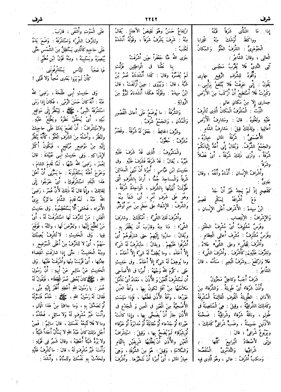 إذا ما اشْتَأَى شَرَفاً قَبْلَه وواكَظَ أَوْشَكَ منه اقْتِرابا الجوهري الشَّرَفُ العُلُوُّ والمكان العالي وقال الشاعر آتي النَّدِيَّ فلا يُقَرَّبُ مَجْلِسي وأَقُود للشَّرَفِ الرَّفِيعِ حِماري يقول إني خَرِفْت فلا يُنتفع برَأْيي وكبِرْت فلا أَستطيع أَن أَركب من الأَرض حماري إلا من مكان عال الليث المُشْرَفُ المكان الذي تُشْرِفُ عليه وتعلوه قال ومَشارِفُ الأَرض أَعاليها ولذلك قيل مَشارِفُ الشَّامِ الأَصمعي شُرْفةُ المال خِيارُه والجمع الشُّرَفُ ويقال إني أَعُدُّ إتْيانَكم شُرْفةً وأَرى ذلك شُرْفةً أَي فَضْلاً وشَرَفاً وأَشْرافُ الإنسان أُذُناه وأَنْفُه وقال عديّ كَقَصِير إذ لم يَجِدْ غير أَنْ جَدْ دَعَ أَشْرافَه لمَكْر قَصِير ابن سيده الأَشْرافُ أَعلى الإنسانِ والإشرافُ الانتصابُ وفرس مُشْتَرِفٌ أَي مُشْرِفُ الخَلْق وفرس مُشْتَرِفٌ مُشْرِفُ أَعالي العظام وأَشْرَف الشيءَ وعلى الشيء عَلاه وتَشَرَّفَ عليه كأَشْرَفَ وأَشْرَفَ الشيءُ علا وارتفع وشَرَفُ البعير سَنامه قال الشاعر شَرَفٌ أَجَبُّ وكاهِلٌ مَجْزُولُ وأُذُن شَرْفاء أَي طويلة والشَّرْفاء من الآذان الطويلة القُوفِ القائمة المُشْرِفةُ وكذلك الشُّرافِيَّة وقيل هي المنتصبة في طول وناقة شَرْفاء وشُرافِيَّةٌ ضَخْمةُ الأُذنين جسيمة وضَبٌّ شُرافيٌّ كذلك ويَرْبُوعٌ شُرافيّ قال وإني لأَصْطادُ اليَرابيعَ كُلَّها شُرافِيَّها والتَّدْمُريَّ المُقَصِّعا ومنكب أَشْرَفُ عال وهو الذي فيه ارتفاع حَسَنٌ وهو نقِيض الأَهدإِ يقال منه شَرِفَ يَشْرَفُ شَرَفاً وقوله أَنشده ثعلب جَزى اللّهُ عَنَّا جَعْفَراً حين أَشْرَفَتْ بنا نَعْلُنا في الواطِئين فَزَلَّتِ لم يفسره وقال كذا أَنشدَناه عمر بن شَبَّة وقال ويروى حين أَزْلَفَتْ قال ابن سيده وقوله هكذا أَنشدناه تَبَرُّؤٌ من الرواية والشُّرْفةُ ما يوضع على أَعالي القُصور والمدُن والجمع شُرَفٌ وشَرَّفَ الحائطَ جعل له شُرْفةً وقصر مُشَرَّفٌ مطوَّل والمَشْرُوف الذي قد شَرَفَ عليه غيره يقال قد شَرَفَه فَشَرَفَ عليه وفي حديث ابن عباس أُمِرْنا أَن نَبْني المَدائِنَ شُرَفاً والمساجِدَ جُمّاً أَراد بالشُّرَفِ التي طُوّلت أَبْنِيَتُها بالشُّرَفِ الواحدة شُرْفةٌ وهو على شَرَفِ أَمر أَي شَفًى منه والشَّرَفُ الإشْفاء على خَطَر من خير أَو شر وأَشْرَفَ لك الشيءُ أَمْكَنَك وشارَفَ الشيءَ دنا منه وقارَبَ أَن يَظْفَرَ به ويقال ساروا إليهم حتى شارَفُوهم أَي أَشْرَفُوا عليهم ويقال ما يُشْرِفُ له شيء إلا أَخذه وما يُطِفُّ له شيء إلا أَخذه وما يُوهِفُ له شيء إلا أَخذه وفي حديث عليّ كرم اللّه وجهه أُمِرْنا في الأَضاحي أَن نَسْتَشْرفَ العين والأُذن معناه أَي نتأَمل سلامتهما من آفةٍ تكون بهما وآفةُ العين عَوَرُها وآفة الأُذن قَطْعها فإذا سَلِمَت الأُضْحِية من العَوَر في العين والجَدْعِ في الأَذن جاز أَن يُضَحَّى بها إذا كانت عَوْراء أَو جَدْعاء أَو مُقابَلَةً أَو مُدابَرَةً أَو خَرْقاء أَو شَرْقاء لم يُضَحَّ بها وقيل اسْتِشْرافُ العين والأُذن أَن يطلبهما شَريفَيْن بالتمام والسلامة وقيل هو من الشُّرْفةِ وهي خِيارُ المال أَي أُمِرْنا أَن نتخيرها وأَشْرَفَ على الموت وأَشْفى قارَبَ وتَشَرَّفَ الشيءَ واسْتَشْرَفه وضع يده على حاجِبِه كالذي يَسْتَظِلُّ من الشمس حتى يُبْصِرَه ويَسْتَبِينَه ومنه قول ابن مُطَيْر فَيا عَجَباً للناسِ يَسْتَشْرِفُونَني كأَنْ لم يَرَوا بَعْدي مُحِبّاً ولا قبْلي وفي حديث أَبي طلحة رضي اللّه عنه أَنه كان حسَنَ الرمْي فكان إذا رمى اسْتَشْرَفَه النبي صلى اللّه عليه وسلم لينظر إلى مَواقِعِ نَبْله أَي يُحَقِّقُ نظره ويَطَّلِعُ عليه والاسْتِشْرافُ أَن تَضَع يدك على حاجبك وتنظر وأَصله من الشرَف العُلُوّ كأَنه ينظر إليه من موضع مُرْتَفِع فيكون أَكثر لإدراكه وفي حديث أَبي عبيدة قال لعمر رضي اللّه عنهما لما قَدِمَ الشامَ وخرج أَهلُه 