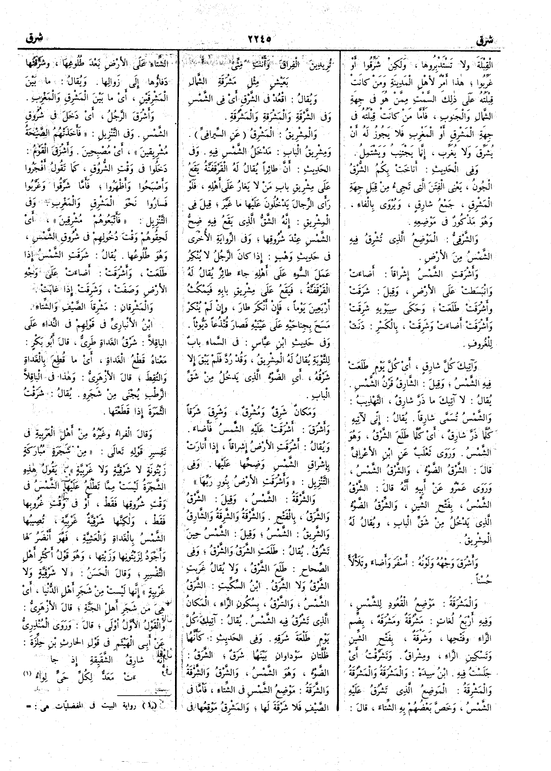 القِبْلة ولا تَسْتَدْبروها ولكن شَرِّقوا أَو غَرِّبوا هذا أَمر لأَهل المدينة ومن كانت قِبْلته على ذلك السَّمْتِ ممن هو في جهة الشمال والجنوب فأما من كانت قبلته في جهة المَشْرِق أو المغرب فلا يجوز له أَن يُشَرِّق ولا يُغَرِّب إنما يَجْتَنِب ويَشْتَمِل وفي الحديث أناخَتْ بكم الشُّرْق الجُونُ يعني الفِتَن التي تجيء من قِبَل جهة المشرق جمع شارِق ويروى بالفاء وهو مذكور في موضعه والشَّرْقيّ الموضع الذي تُشْرِق فيه الشمس من الأَرض وأَشْرَقَت الشمسُ إشْراقاً أضاءت وانبسطت على الأَرض وقيل شَرَقَت وأَشْرَقت طلعت وحكى سيبويه شَرَقت وأَشْرَقَت أَضاءت وشَرِقَت بالكسر دَنَتْ للغروب وآتِيك كلَّ شارقٍ أي كلَّ يوم طلعت فيه الشمس وقيل الشارِقُ قَرْن الشمس يقال لا آتِيك ما ذَرَّ شارِقٌ التهذيب والشمس تسمى شارقاً يقال إني لآتِيه كلَّما ذرَّ شارِقٌ أي كلما طلع الشَّرْقُ وهو الشمس وروى ثعلب عن ابن الأَعرابي قال الشَّرْق الضوء والشَّرْق الشمس وروى عمرو عن أَبيه أَنه قال الشَّرْق الشمس بفتح الشين والشِّرْق الضوء الذي يدخل من شقّ الباب ويقال له المِشْرِيق وأَشْرَقَ وجههُ ولونُه أَسفَر وأضاء وتلألأ حُسْناً والمَشْرقة موضع القعود للشمس وفيه أربع لغات مَشْرُقة ومَشْرَقة بضم الراء وفتحها وشَرْقة بفتح الشين وتسكين الراء ومِشْراق وتَشَرَّقْت أي جلست فيه ابن سيده والمَشْرَقة والمَشْرُقة والمَشْرِقة الموضع الذي تَشْرُق عليه الشمس وخصَّ بعضهم به الشتاء قال تُرِيدين الفِراقَ وأنْتِ منِّي بِعيشٍ مِثْل مَشْرَقة الشَّمالِ ويقال اقعُد في الشَّرْق أَي في الشَّمْسِ وفي الشَّرْقة والمَشْرَقة والمَشْرُقة والمِشْرِيقُ المَشْرِقُ عن السيرافي ومِشْرِيقُ الباب مدْخَلُ الشمس فيه وفي الحديث أَنَّ طائراً يقال له القَرْقَفَنَّة يقع على مِشْرِيق باب مَنْ لا يَغار على أهله فلو رأَى الرجال يدخلون عليها ما غَيَّر قيل في المِشْرِيق إنه الشق الذي يقع فيه ضِحُّ الشمس عند شروقها وفي الرواية الأُخرى في حديث وهب إذا كان الرجل لا ينكرُ عَمَل السوء على أهله جاءَ طائر يقال له الفَرْقَفَنَّة فيقع على مِشْرِيق بابه فيمكث أربعين يوماً فإن أنكر طار وإن لم يُنْكر مسح بجناحيه على عينيه فصار قُنْذُعاً دَيُّوثاً وفي حديث ابن عباس في السماء بابٌ للتوبة يقال له المِشْرِيق وقد رُدَّ فلم يبق إلاّ شَرْقُه أَي الضوءُ الذي يدخل من شقِّ الباب ومكان شَرِقٌ ومُشْرِق وشَرِقَ شَرَقاً وأَشْرَق أَشْرَقَت عليه الشمس فأضاء ويقال أَشْرَقَت الأَرض إشراقاً إذا أنارت بإشْراق الشمس وضِحِّها عليها وفي التنزيل وأَشْرَقَت الأَرضُ بنور رَبِّها والشَّرْقة الشمس وقيل الشَّرَق والشَّرْق بالفتح والشَّرِقة والشارِقُ والشَّرِيق الشمس وقيل الشمس حين تَشرُق يقال طلعت الشَّرَق والشَّرُق وفي الصحاح طلع الشَّرْق ولا يقال غرَبت الشَّرْق ولا الشَّرَق ابن السكيت الشَّرَق الشمس والشَّرْق بسكون الراء المكان الذي تَشْرُق فيه الشمس يقال آتيك كل يوم طَلْعَةَ شَرَقِه وفي الحديث كأَنَّهما ظُلَّتان سَوْداونِ بينهما شَرَقٌ الشَّرَقُ الضوءُ وهو الشمس والشَّرْق والشَّرْقة والشَّرَقة موضع الشمس في الشتاء فأما في الصيف فلا شَرقة لها والمَشْرِقُ موقعها في الشتاء على الأَرض بعد طلوعها وشَرْقَتُها دَفاؤُها إلى زوالها ويقال ما بين المَشْرِقَيْنِ أَي ما بين المَشْرِق والمغرب وأَشْرَق الرجلُ أَي دخل في شروقِ الشمس وفي التنزيل فأَخَذَتْهم الصَّيْحةُ مُشْرِقِينَ أَي مُصْبِحين وأَشْرَقَ القومُ دخلوا في وقت الشروق كما تقول أَفْجَرُوا وأَصْبَحُوا وأَظْهَرُوا فأما شَرَّقُوا وغَرَّبوا فسارُوا نحوَ المَشْرِق والمغرب وفي التنزيل فأَتْبَعُوهم مُشْرقينَ أي لَحِقوهم وقت دخولهم في شروق الشمس وهو طلوعها يقال شَرَقَت الشمسُ إذا طلعت وأَشْرَقَت أَضاءت على وجه الأَرض وصَفَتْ وشَرِقْت إذا غابت والمَشْرِقان مَشْرِقا الصيف والشتاء ابن الأَنبا