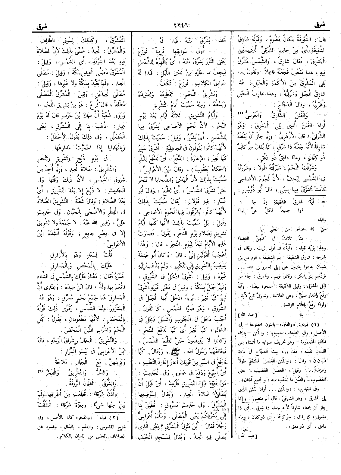 قال الشَّقِيقة مكان معلوم وقوله شارق الشَّقِيقة أَي من جانبها الشَّرْقي الذي يلي المَشْرِق فقال شارق والشمس تَشْرُق فيه هذا مفعول فجعله فاعلاً وتقول لِما يلي المَشْرِق من الأَكَمَةِ والجبل هذا شارِقُ الجبل وشَرْقِيُّه وهذا غاربُ الجبل وغَربِيُّه وقال العجاج والفُتُن الشارق والغَرْبيّ أَراد الفُتُنَ التي تلي المَشْرِق وهو الشَّرْقيُّ قال الأزهري وإنما جاز أَن يفعله شارقاً لأَنه جعله ذا شَرْقٍ كما يقال سِرُّ كاتمٌ ذو كِتْمان وماء دافِقٌ ذو دَفْقٍ وشَرَّقْتُ اللحم شَبْرَقْته طولاً وشَرَرْته في الشمس ليجِفَّ لأن لحوم الأَضاحي كانت تُشَرَّق فيها بمنى قال أَبو ذؤيب فغدا يُشَرِّقُ مَتْنَه فَبَدا له أُولى سَوابِقها قَرِيباً تُوزَعُ يعني الثور يُشَرِّقُ مَتْنَه أَي يُظْهِرُه للشمس ليجِف ما عليه من ندى الليل فبدا له سوابقُ الكِلابِ تُوزَع تُكَفّ وتَشْريق اللحم تَقْطِيعُه وتقدِيدُه وبَسْطُه ومنه سميت أيام التشريق وأيام التشريق ثلاثة أَيام بعد يوم النحر لأَن لحم الأَضاحي يُشَرَّق فيها للشمس أَي يُشَرَّر وقيل سميت بذلك لأَنهم كانوا يقولون في الجاهلية أَشْرِقْ ثَبِير كيما نُغِير الإِغارةُ الدفع أَي ندفع للنَّفْر حكاه يعقوب وقال ابن الأَعرابي سميت بذلك لأن الهَدْيَ والضحايا لا تُنْحَر حتى تَشْرُق الشمسُ أَي تطلع وقال أَبو عبيد فيه قولان يقال سميت بذلك لأَنهم كانوا يُشَرِّقون فيها لُحوم الأَضاحي وقيل بل سميت بذلك لأَنها كلَّها أَيام تشريق لصلاة يومِ النحر يقول فصارت هذه الأيام تبعاً ليوم النحر قال وهذا أَعجب القولين إليَّ قال وكان أَبو حنيفة يذهب بالتَّشْرِيقِ إلى التكبير ولم يذهب إليه غيره وقيل أَشْرِق ادْخُلْ في الشروق وثَبِيرٌ جبل بمكة وقيل في معنى قوله أَشْرِق ثبِير كَيْما نُغِير يريد ادْخل أيها الجبل في الشروق وهوضوء الشمس كما تقول أَجْنَب دخل في الجنوب وأَشْمَلَ دخل في الشِّمال كيما نُغِير أَي كيما ندفع للنحر وكانوا لا يُفِيضون حتى تطلع الشمس فخالفهم رسول الله صلى الله عليه وسلم ويقال كيما ندفع في السير من قولك أَغارَ إغارةَ الثَّعْلبِ أَي أَسْرع ودفع في عَدْوِه وفي الحديث مَنْ ذَبَح قبل التشريق فلْيُعِدْ أَي قبل أَن يصلِّيَ صلاة العيد ويقال لموضعها المُشَرَّق وفي حديث مَسْروق انْطَلِقْ بنا إلى مُشَرِّقِكم يعني المُصَلَّى وسأل أَعرابي رجلاً فقال أَين مَنْزِل المُشَرَّق ؟ يعني الذي يُصَلَّى فيه العيد ويقال لمسجد الخَيْف المُشَرَّق وكذلك لسوق الطائف والمُشَرَّق العيد سمي بذلك لأن الصلاة فيه بعد الشَّرْقةِ أَي الشمس وقيل المُشَرَّق مُصَلَّى العيد بمكة وقيل مُصَلَّى العيد ولم يقيد بمكة ولا غيرها وقيل مصلى العيدين وقيل المُشَرَّق المصلّى مطلقاً قال كراع هو من تشريق اللحم وروى شعبة أن سِماك بن حَرْب قال له يوم عيد اذهب بنا إلى المُشَرَّق يعني المصلى وفي ذلك يقول الأَخطل وبالهَدايا إذا احْمَرَّتْ مَدارِعُها في يوم ذَبْحٍ وتَشْرِيقٍ وتَنْخار والتَّشْرِيق صلاة العيد وإنما أُخذ من شروق الشمس لأَن ذلك وقتُها وفي الحديث لا ذَبْحَ إلا بَعْد التَّشْرِيق أَي بعد الصلاة وقال شعبة التَّشْرِيق الصلاة في الفطر والأَضحى بالجَبّانِ وفي حديث عليّ رضي الله عنه لا جُمْعة ولا تَشْرِيقَ إلا في مِصْرٍ جامع وقوله أَنشده ابن الأَعرابي قُلْتُ لِسَعْدٍ وهو بالأَزارِق عَلَيْكَ بالمَحْضِ وبالمَشارق فسره فقال معناه عليك بالشمس في الشتاء فانْعَمْ بها ولَذَّ قال ابن سيده وعندي أن المَشارِق هنا جمع لحمٍ مُشَرَّق وهو هذا المَشْرُور عند الشمس يُقَوِّي ذلك قولُه بالمحض لأَنهما مطعومان يقول كُلِ اللحم واشْرَب اللبن المحض والتَّشْريق الجمالُ وإشْراقُ الوجه قاله ابن الأَعرابي في بيت المرار ويَزِينُهنَّ مع الجمالِ مَلاحةٌ والدَّلُّ والتَّشْرِيقُ والفَخْرُ