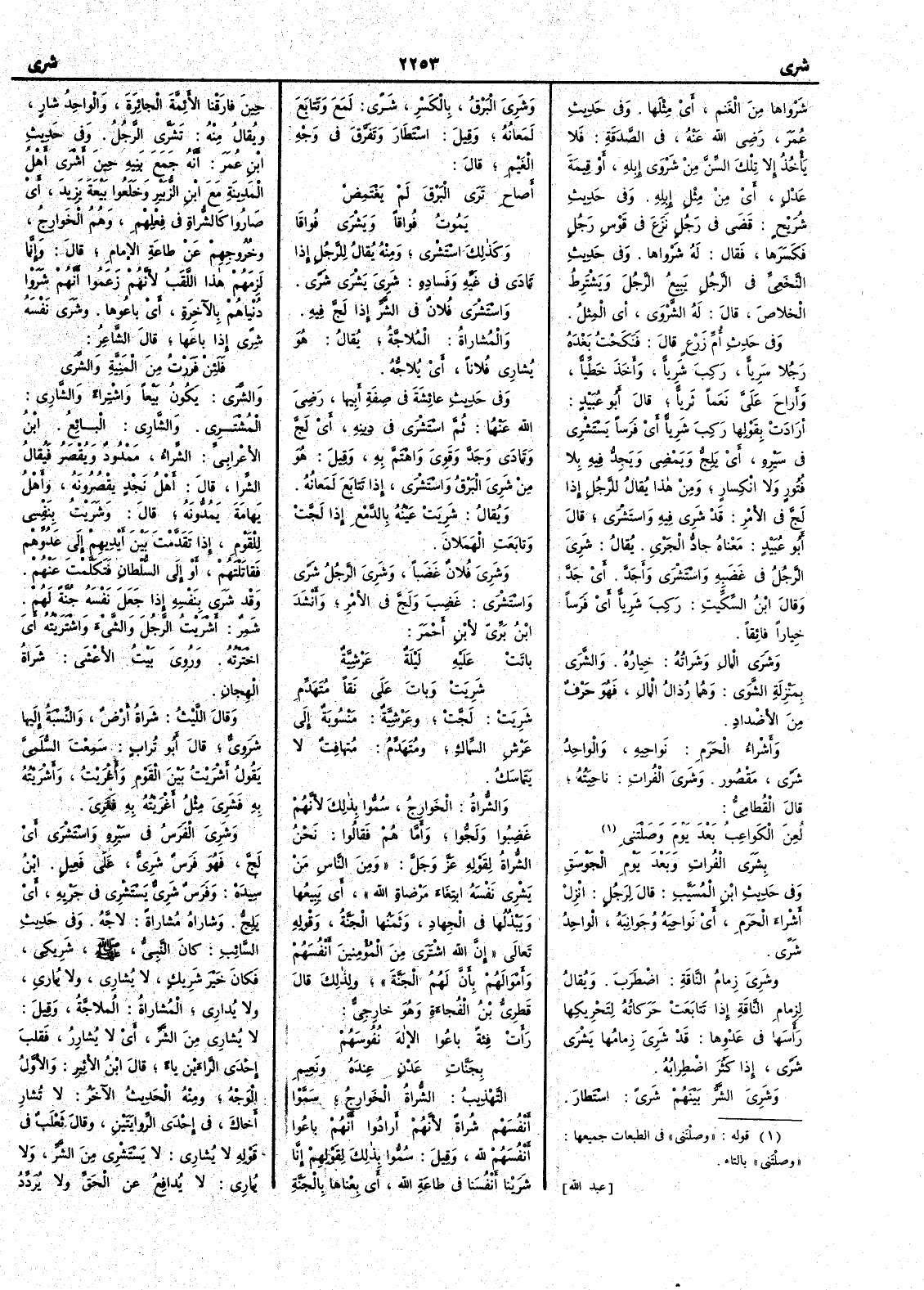 شَرْواها من الغنم أَي مِثْلَها وفي حديث عمر رضي الله عنه في الصدقة فلا يأْخذ إلاَّ تلك السِّنَّ مِن شَرْوَى إبلِه أَو قيمةَ عَدْلٍ أَي من مِثْلِ إبلهِ وفي حديث شريح قَضَى في رجلٍ نَزَع في قَوْسِ رجلٍ فكسَرها فقال له شَرْواها وفي حديث النخعي في الرجلِ يبيعُ الرجلَ ويشترط الخَلاصَ قال له الشَّرْوَى أَي المِثْلُ وفي حديث أُمِّ زرعٍ قال فَنَكَحْتُ بعده رجلاً سَرِيّاً رَكِبَ شَرِيّاً وأَخذَ خَطِّيّاً وأَراحَ عليَّ نَعَماً ثَريّاً قال أَبو عبيد أَرادت بقولِها رَكِبَ شَرِيّاً أَي فرساً يَسْتَشْرِي في سيرهِ أَي يَلِجُّ ويَمْضِي ويَجِدُّ فيه بلا فُتورٍ ولا انكسارٍ ومن هذا يقال للرجل إذا لَجَّ في الأَمر قد شَريَ فيه واسْتَشْرى قال أَبو عبيد معناه جادُّ الجَرْي يقال شَرِيَ الرجلُ في غَضَبِهِ واسْتَشْرَى وأَجَدَّ أَي جَدَّ وقال ابن السكيت رَكِبَ شَرِيّاً أي فرَساً خِياراً فائقاً وشَرَى المالِ وشَراتُه خيارهُ والشَّرَى بمنزلة الشَّوَى وهما رُذالُ المال فهو حرف من الأَضداد وأَشراءُ الحَرَمِ نواحِيه والواحِد شَرىً مقصور وشَرَى الفُراتِ ناحيتهُ قال القطامي لُعِنَ الكَواعِبُ بَعْدَ يومَ وصَلْتَني بِشَرَى الفُراتِ وبَعْدَ يَوْمِ الجَوْسَقِ وفي حديث ابن المسيب قال لرجلٍ انْزِلْ أَشْراءَ الحَرَمِ أَي نواحيَه وجَوانِبَه الواحدُ شَرىً وشَرِيَ زِمامُ الناقةِ اضطَربَ ويقال لزِمامِ الناقة إذا تتابَعَتْ حركاته لتحريكها رأْسَها في عَدْوِها قد شَرِيَ زمامُها يَشْرَى شَرىً إذا كثُر اضطرابهُ وشَرِيَ الشرُّ بينهم شَرىً اسْتَطارَ وشَرِيَ البرق بالكسر شَرىً لَمَع وتتابَع لمَعانُه وقيل اسْتَطارَ وتَفَرَّق في وجه الغَيْمِ قال أَصاحِ تَرَى البَرْقَ لَمْ يغْتَمِضْ يَمُوتُ فُواقاً ويَشْرَى فُواقَا وكذلك اسْتَشْرَى ومنه يقال للرجلِ إذا تمَادَى في غَيِّهِ وفسادِه شَرِيَ بَشْرَى شَرىً واسْتَشْرَى فُلانٌ في الشَّرِّ إذا لَجَّ فيه والمُشاراةُ المُلاجَّةُ يقال هو يُشارِي فلاناً أي يُلاجُّه وفي حديث عائشة في صفة أَبيها رضي الله عنهما ثمَّ اسْتَشْرَى في دِينه أي لَجَّ وتَمادَى وجَدَّ وقَوِيَ واهْتَمَّ به وقيل هو مِنْ شَريَ البرقُ واسْتَشْرَى إذا تتابَع لمَعانهُ ويقال شَرِيَتْ عينهُ بالدَّمْعِ إذا لَجَّت وتابَعَت الهَمَلان وشَرِيَ فلانٌ غَضَباً وشَرِيَ الرجل شَرىً واسْتَشرَى غَضِبَ ولَجَّ في الأَمْرِ وأَنشد ابن بري لابن أَحمر باتَتْ عَلَيه ليلةٌ عَرْشِيَّةٌ شَرِبَت وباتَ عَلى نَقاً مُتَهَدِّمِ شَرِيَتْ لَجَّتْ وعَرْشِيَّةٌ منسوبة إلى عَرْشِ السِّماكِ ومُتَهَدِّم مُتهافِت لا يَتماسك والشُّراة الخَوارِجُ سُمُّوا بذلك لأَنَّهم غَضِبُوا ولَجُّوا وأَمّا هُمْ فقالوا نحن الشُّراةُ لقوله عز وجل ومِنَ الناسِ مَنْ يَشْرِي نفسَه ابتِغاءَ مَرْضاةِ اللهِ أَي يَبِيعُها ويبذُلُها في الجهاد وثَمَنُها الجنة وقوله تعالى إنَّ اللهَ اشْتَرَى من المؤْمنين أَنفَسَهم وأَموالَهم بأَنَّ لهُم الجنةَ ولذلك قال قَطَرِيُّ بن الفُجاءَة وهو خارجيٌّ رأْْت فِئةً باعُوا الإلهَ نفوسَهُم بِجَنَّاتِ عَدْنٍ عِندَهُ ونَعِيمِ التهذيب الشُّراةُ الخَوارِجُ سَمَّوْا أَنفسهم شُراةً لأَنهم أرادوا أنهم باعُوا أَنفسهم لله وقيل سُموا بذلك لقولهم إنَّا شَرَيْنا أَنفسنا في طاعةِ الله أَي بعناها بالجنة حين فارَقْنا الأَئِمَّةَ الجائِرة والواحد شارٍ ويقال منه تَشَرَّى الرجلُ وفي حديث ابن عمر أنه جمع بَنِيهِ حين أَشْرَى أَهلُ المدينةِ مع ابنِ الزُّبَيْر وخَلَعُوا بَيْعَةَ يزيدَ أَي صاروا كالشُّراةِ في فِعْلِهم وهُم الخَوارجُ وخُروجِهم عن طاعةِ الإمامِ قال وإنما لزمَهم هذا اللقَبُ لأَنهم زعموا أَنهم شَرَوْا دُنْياهم بالآخرةَ أَي باعُوها وشَرَى نفسَه شِرىً إذا باعَها قال الشاعر فلَئِنْ فَرَرْتُ مِن المَنِيَّةِ والشِّرَى والشِّرَى يكون بيعاً واشْتِراءً والشارِي المُشْتَرِي والشاري ال
