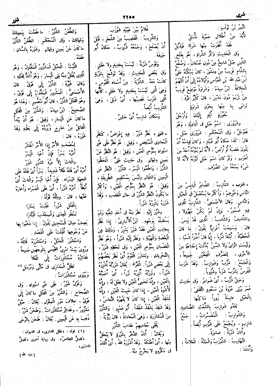 ( شزر ) نَظَرٌ شَزْرٌ فيه إِعراض كنظر المعادي المبغض وقيل هو نظر على غير استواء بِمؤْخِرِ العين وقيل هو النظر عن يمين وشمال وفي حديث عليّ الْحَظُوا الشَّزْرَ واطْعُنُوا اليَسْرَ الشَّزْرُ النظر عن اليمين والشمال وليس بمستقيم الطريقة وقيل هو النظر بمؤخر العين وأَكثر ما يكون النظرُ الشَّزْرُ في حال الغضب وقد شَزَرَهُ يَشْزِرُهُ شَزْراً وشَزَّرَ إِليه نظر منه في أَحد شِقَّيْهِ ولم يستقبله بوجهه ابن الأَنباري إِذا نظر بجانب العين فقد شَزَرَ يَشْزِرُ وذلك من البَغْضَةِ والهَيْبَةِ ونَظَرَ إِليه شَزْراً وهو نظر الغضبان بِمُؤَخَّرِ العين وفي لحظه شَزَرٌ بالتحريك وتَشازَرَ القومُ أَي نظر بعضهم إِلى بعض شَزْراً الفراء يقال شَزَرْته أَشْزِرُه شَزْراً ونَزَرْته أَنْزِرُه نَزْراً أَي أَصبته بالعين وإِنه لحَمِئُ العَيْنِ ولا فعل له وإِنه لأَشْوَهُ العَيْنِ إِذا كان خبيث العين وإِنه لشَقِذُ العَيْنِ إِذا كان لا يَقْهَرهُ النُّعاسُ وقد شَقِذَ يَشْقَذُ شَقَذاً أَبو عمرو والشَّزْرُ من المُشازَرَةِ وهي المعاداة قال رؤبة يَلْقَى مُعَادِيهِمْ عذابَ الشَّزْرِ ويقال أَتاه الدهرُ بشَزْرَةٍ لا ينحلُّ منها أَي أَهلكه وقد أَشْزَرَهُ الله أَي أَلقاه في مكروه لا يخرج منه والطَّعْنُ الشَّزْرُ ما طعنت بيمينك وشمالك وفي المحكم الطِّعْنُ الشَّزْرُ ما كان عن يمين وشمال وشَزَرَهُ بالسِّنان طعنه الليث الحبل المَشْزُورُ المفتول وهو الذي يفتل مما يلي اليسار وهو أَشد لقتله وقال غيره الشَّزْرُ إِلى فوق قال الأَصمعي المشزور المفتول إِلى فوق وهو الفتل الشَّزْرُ قال أَبو منصور وهذا هو الصحيح ابن سيده والشَّزْرُ من الفَتْلِ ما كان عن اليسار وقيل هو أَن يبدأَ الفاتل من خارج ويَرُدَّه إِلى بطنه وقد شَزَرَهُ قال لِمُصْعَبِ الأَمْر إِذا الأَمْرُ انْقَشَرْ أَمَرَّهُ يَسْراً فإِنْ أَعْيا اليَسَرْ والْتاثَ إِلا مِرَّةَ الشَّزْرِ شَزَرْ أَمرَّه أَي فتله فتلاً شديداً يسراً أَي فتله على الجهة اليَسْراءِ فإِن أَعْيا اليَسَرُ والتاث أَي أَبطأَ أَمَرَّهُ شَزْراً أَي على العَسْراءِ وأَغارَهُ عليها قال ومثله قوله بالفَتْلِ شَزْراً غَلَبَتْ يَسَارا تَمْطُو العِدَى والمِجْذَبَ البَتَّارَا يصف حبال المَنْجَنِيقِ يقول إِذا ذهبوا بها عن وجوهها أَقبلت على القَصْدِ واسْتَشْزَرَ الحَبْلُ واسْتَشْزَرَه فَاتِلُه وروي بيت امرئ القيس بالوجهين جميعاً غَدَائِرُه مُسْتَشْزِرَاتٌ إِلى العُلى تَظَلُّ المَدَارِي في مُثَنَّى ومُرْسَلِ