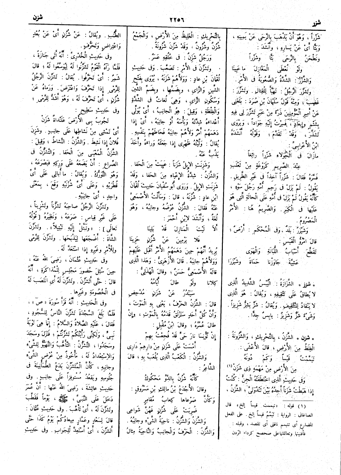 ثَنْدُوَتَيَّ الشَّزَن بالتحريك الغليظ من الأَرض والجمع شُزُنٌ وشُزونٌ وقد شَزُنَ شُزُونة ورجل شَزَِن في خُلُقه عَسَرٌ وتَشَزَّنَ في الأَمر تَصَعَّبَ وفي حديث لُقْمانَ ابن عادٍ ووَلاَّهم شَزَنَه يروى بفتح الشين والزاي وبضمهما وبضم الشين وسكون الزاي وهي لغات في الشِّدَّة والغِلْظة وقيل هو الجانب أَي يُوَلِّي أَعداءَه شِدَّته وبأْسه أَو جانبه أَي إذا دَهَمَهم أَمر وَلاَّهم جانبه فحَاطَهم بنفسه يقال وَلَّيته ظهري إذا جعله وراءه وأَخذَ يَذُبُّ عنه وشَزِنَت الإِبل شَزَناً عَيِيَتْ من الحفا والشَّزَنُ شدة الإِعياء من الحفا وقد شَزِنت الإِبل وروى أَبو سفيان حديث لقمان بن عاد شُزُنَه قال وسأَلت الأَصمعي عنه فقال الشُّزُنُ عُرْضُه وجانبه وهو لغة وأَنشد لابن أَحمر أَلا لَيْتَ المَنازِلَ قد بَلِينا فلا يَرْمِينَ عن شُزُنٍ حَزِيناً يريد أَنهم حين دَهَمَهم الأَمر أَقبل عليهم وولاَّهم جانبه قال الأَزهري وهذا الذي قاله الأَصمعي حسن وقال الهُذَليّ كلانا ولو طالَ أَيَّامُه سَيَنْدُرُ عن شَزَنٍ مُدْحِضِ قال الشَّزَنُ الحَرْف يعني به الموت وأَن كل أَحد سَتَزْلَقُ قدمه بالموت وإن طال عمره وقال ابن مُقْبِل إن تُؤْنِسَا نارَ حَيّ قد فُجِعْتُ بهم أَمْسَتْ على شَزَنٍ من دارِهم دَارِي والشُّزُنُ الكَعْبُ الذي يلعب به قال الشاعر كأَنه شُزُنٌ بالدَّوِّ مَحْكوكُ وقال الأَجْدَعُ بن مالك بن مَسْروق وكأَنَّ صِرْعَيْها كِعابُ مُقامِرٍ ضُرِبَتْ على شُزُنٍ فهنّ شَواعِي والشَّزَنُ والشُّزُنُ ناحية الشيء وجانبه والشُّزُن الحرف والجانب والناحية مثال الطُّنُب ويقال عن شُزُنٍ أَي عن بُعْدٍ واعتراض وتَحَرُّف وفي حديث الخُدْرِيّ أَنه أَتى جَنازة فلما رآه القوم تَشَزَّنُوا له ليُوَسِّعُوا له قال شمر أَي تَحَرَّفُوا يقال تَشَزَّنَ الرجلُ للرَّمْي إذا تَحَرَّفَ واعْتَرض ورماه عن شُزُنٍ أَي تَحَرَّف له وهو أَشد للرمي وفي حديث سَطيح تَجُوبُ بي الأَرضَ عَلَنْداةٌ شَزَنْ أَي تمشي من نشاطها على جانب وشَزِنَ فلانٌ إذا نَشِطَ والشَّزَنُ النَّشاط وقيل الشَّزَن المُعْيَى من الحَفا والتَّشَزُّن في الصِّراع أَن يَضَعه على وَركه فيَصْرَعه وهو التَّوَرُّك ويقال ما أُبالي على أَيّ قُطْرَيْهِ وعلى أَيّ شُزْنَيْه وقع بمعنى واحد أَي جانِبيه وتَشَزَّنَ الرجلُ صاحبَه تَشَزُّناً وتَشْزِيناً على غير قياس صرعه ونظيره وتَبَتَّل إليه تَبْتِيلاً وتَشَزَّنَ الشاةَ أَضجعها ليذبحها وتَشَزَّن للرَّمْي وللأَمر وغيره إذا اسْتَعَدَّ له وفي حديث عثمان رضي الله عنه حين سُئلَ حُضُورَ مجلس للمذاكرة أَنه قال حتى أَتَشَزَّنَ وتَشَزَّن له أَي انتصب له في الخصومة وغيرها وفي الحديث أَنه قرأَ سورة ص فلما بلغ السجدة تَشَزَّنَ الناسُ للسجود فقال عليه الصلاة والسلام إنما هي توبة نبيّ ولكني رأَيتكم تَشَزَّنْتُم فنزل وسجد وسجدوا التَّشَزُّنُ التأَهُّب والتَّهَيُّؤ للشيء والاستعداد له مأْخوذ من عُرْض الشيء وجانبه كأَنَّ المُتَشَزِّنَ يَدَعُ الطمأْنينة في جلوسه ويقعُدُ مستوفزاً على جانب وفي حديث عائشة رضي الله عنها أَن عمر دخل على النبي صلى الله عليه وسلم يوماً فقَطَّبَ وتَشَزَّنَ له أَي تأَهب وفي حديث عثمان قال لسَعْد وعَمّار ميعادُكم يومُ كذا حتى أَتَشَزَّنَ أَي أَسْتَعِدَّ للجواب وفي حديث