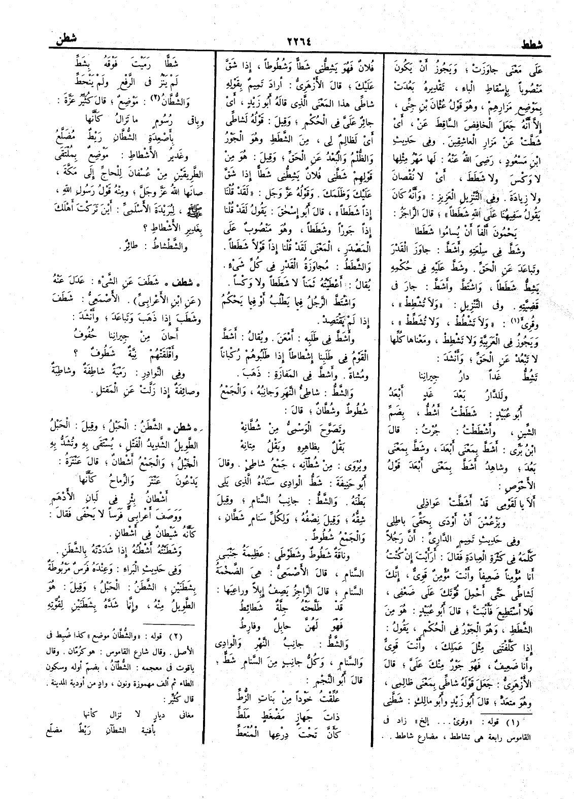 على معنى جاوزت ويجوز أَن يكون منصوباً بإِسقاط الباء تقديره بَعُدت بموضع مَزارِهم وهو قول عثمان بن جني إِلاَّ أَنه جعل الخافض الساقط عن أَي شَطَّت عن مزارِ العاشقين وفي حديث ابن مسعود رضي اللّه عنه لها مَهْرُ مِثلها لا وكْسَ ولا شَطَطَ أَي لا نُقْصان ولا زِيادةَ وفي التنزيل العزيز وانه كان يقول سَفِيهُنا على اللّهِ شَطَطاً قال الراجز يَحْمُونَ أَلفاً أَن يُسامُوا شَطَطا وشَطّ في سِلْعَتِه وأَشطَّ جاوَزَ القَدْرَ وتباعدَ عن الحق وشَطَّ عليه في حُكْمِه يَشِطُّ شَطَطاً واشْتَطَّ وأَشَطَّ جارَ في قضيَّتِه وفي التنزيل ولا تُشْطِطْ وقرئَ ولا تَشْطُطْ ولا تُشَطِّطْ ويجوز في العربية ولا تَشْطِطْ ومعناها كلّها لا تَبْعُدْ عن الحقّ وأَنشد تَشُِطُّ غَداً دارُ جِيرانِنا ولَلدَّارُ بَعْدَ غَدٍ أَبْعَدُ أَبو عبيد شَطَطْتُ أَشُطُّ بضم الشين وأَشْطَطْتُ جُرْت قال ابن بري أَشَطَّ بمعنى أَبْعَدَ وشَطَّ بمعنى بعُدَ وشاهد أََشَطَّ بمعنى أَبعدَ قول الأَحوص أَلا يا لَقَوْمِي قد أَشَطَّتْ عَواذِلي ويَزْعُمْنَ أَن أَوْدَى بحَقِّيَ باطِلي وفي حديث تَميم الدَّارِيّ أَنَّ رجلاً كلمه في كثرة العبادة فقال أَرأَيتَ إِن كنتُ أَنا مُؤْمِناً ضَعِيفاً وأَنت مُؤْمن قوي ؟ إِنك لشاطِّي حتى أَحْمِلَ قوَّتَك على ضَعْفِي فلا أَسْتَطِيعَ فأَنْبَتَّ قال أَبو عبيد هو من الشَّطَطِ وهو الجَوْرُ في الحُكْم يقول إِذا كَلَّفْتَني مثل عملك وأَنتَ قويّ وأَنا ضعِيفٌ فهو جَوْرٌ منك عليَّ قال الأَزهري جعل قوله شاطِّي بمعنى ظالِمِي وهو معتدٍّ قال أَبو زيد وأَبو مالك شَطَّني فلان فهو يَشِطُّني شَطّاً وشُطوطاً إِذا شَقَّ عليك قال الأَزهري أَراد تميم بقوله شاطِّي هذا المعنى الذي قاله أَبو زيد أَي جائر عليَّ في الحكم وقيل قولُه لشاطِّي أَي لظالِمٌ لي من الشَّطَط وهو الجورُ والظلم والبُعْدُ عن الحق وقيل هو من قولهم شَطَّني فلان يَشِطُّني شَطّاً إِذا شَقَّ عليك وظلمك وقوله عزّ وجلّ لقد قلنا إِذاً شططاً قال أَبو إِسحق يقول لقد قلنا إِذاً جَوْراً وشَطَطاً وهو منصوب على المصدر المعنى لقد قلنا إِذاً قَولاً شطَطاً والشطَطُ مجاوزةُ القدْرِ في كل شيء يقال أَعطيته ثمناً لا شَطَطاً ولا وَكْساً واشتطَّ الرجل فيما يَطْلُبُ أَو فيما يحكم إِذا لم يَقْتَصِد وأَشَطَّ في طلبه أَمْعَنَ ويقال أَشَطَّ القومُ في طَلبِنا إِشْطاطاً إِذا طلبوهم رُكْباناً ومُشاةً وأَشَطَّ في المَفازةِ ذهب والشَّطُّ شاطِئُ النهر وجانبه والجمع شُطوطٌ وشُطَّانٌ قال وتَصَوَّحَ الوَسْمِيُّ من شُطَّانِه بَقْلٌ بظاهِرِهِ وبَقْلُ مِتانِه ويروى من شُطْآنِه جمع شاطِئٍ وقال أَبو حنيفة شَطُّ الوادِي سَنَدُه الذي يَلي بطنَه والشَّطُّ جانبُ السَّنامِ وقيل شِقُّه وقيل نِصْفُه ولكل سَنام شَطَّانِ والجمع شُطوط وناقة شَطُوطٌ وشَطَوْطَى عظيمة جنبي السَّنامِ قال الأَصمعي هي الضخْمةُ السنامِ قال الراجز يصف إِبلاً وراعِيَها قد طَلَّحَتْه جِلَّةٌ شَطائطُ فهْو لهُنَّ حابِلٌ وفارِطُ والشَّطُّ جانبُ النهرِ والوادي والسَّنامِ وكلُّ جانبٍ من السنام شَطٌّ قال أَبو النجم عُلِّقْتُ خَوْداً من بَناتِ الزُّطِّ ذاتَ جَهازٍ مَضْغَطٍ ملَطِّ كأَنَّ تحتَ دِرْعِها المُنْعَطِّ شَطّاً رَمَيْت فَوْقَه بشَطِّ لم يَنْزُ في الرَّفعِ ولم يَنْحَطِّ والشُّطَّانُ موضع قال كثيِّر عزَّة وباقي رُسُومٍ ما تزالُ كأَنَّها بأَصْعِدةِ الشُّطَّانِ رَيْطٌ مُضَلَّعُ وغَدِيرُ الأَشْطاطِ موضعٌ بمُلْتَقَى الطريقين من عُسْفانَ للحاجّ إِلى مكة صانها اللّه عزّ وجلّ ومنه قول رسول اللّه ثلّى اللّه عليه وسلّم لبُرَيْدةَ الأَسلمي أَين تركت أَهلَك بغَدِير الأَشْطاطِ ؟ والشَّطْشاطُ طائر