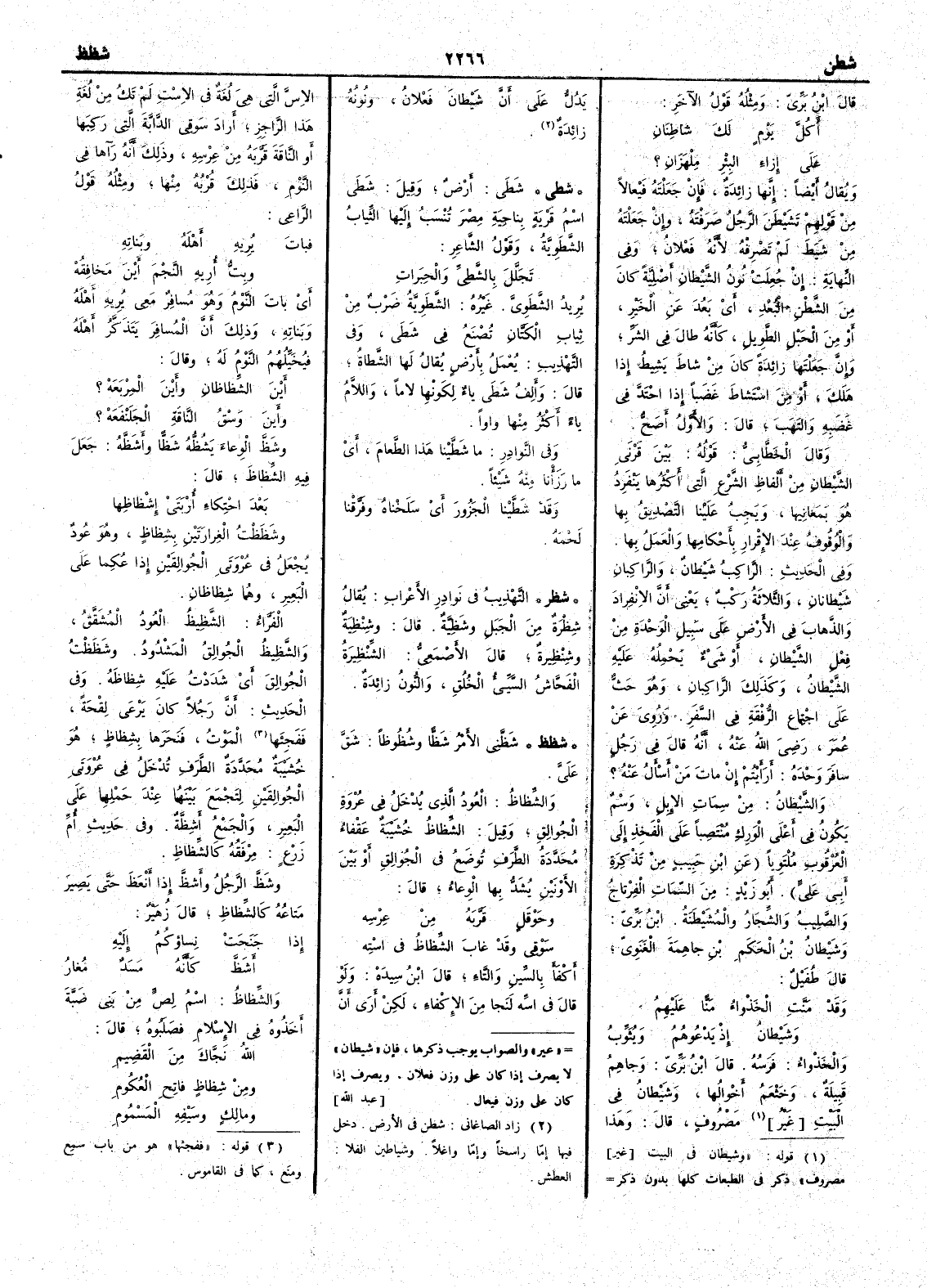( شطي ) شطى أَرضٌ وقيل شَطَى اسمُ قَرْيةٍ بناحيةِ مِصْرَ تُنسَبُ إليها الثيابُ الشَّطَوِيَّة وقول الشاعر تَجَلَّل بالشَّطِيَّ والحِبَراتِ يريد الشَّطَويَّ غيره الشَّطَوِيَّة ضرْبٌ من ثياب الكَتان تُصْنعُ في شَطَى وفي التهذيب يُعْمَلُ بأَرض يقال لها الشَّطاةُ قال وأَلف شطى ياءٌ لكونها لاماً واللامُ ياءً أَكثرُ منها واواً وفي النوادر ما شَطَّيْنا هذا الطعام أَي ما رَزَأْنا منه شيئاً وقد شَطَّيْنا الجَزُورَ أَي سَلَخْناه وفَرَّقْنا لَحْمَه( شظر ) التهذيب في نوادر الأَعراب يقال شِظْرَةٌ من الجبل وشَظِيَّةٌ قال وشِنْظِيَةٌ وشِنْظِيرةٌ قال الأَصمعي الشِّنْظِيرةُ الفَحَّاشُ السَّيِّئ الخُلُق والنون زائدة ( شظظ ) شظَّني الأَمر شَظّاً وشُظوظاً شقَّ عليَّ والشِّظاظُ العُود الذي يُدخل في عُرْوة الجُوالِق وقيل الشِّظاظُ خُشَيْبة عَقْفاء محدَّدةُ الطرَفِ توضع في الجوالق أَو بين الأَوْنَينِ يُشَدّ بها الوِعاء قال وحَوْقَلٍ قَرَّبه مِن عِرْسِه سَوْقِي وقد غابَ الشِّظاظُ في اسْتِه اَكْفأَ بالسين والتاء قال ابن سيده ولو قال في اسِّه لنجا من الإِكْفاء لكن أَرى أَن الاسّ التي هي لغة في الاسْتِ لم تك من لغة هذا الراجز أَراد سَوقي الدّابةَ التي ركبها أَو الناقة قرَّبه من عرسه وذلك أَنه رآها في النوم فذلك قُرْبُه منها ومثله قول الراعي فباتَ يُرِيه أَهلَه وبَناتِه وبِتُّ أُرِيهِ النَّجْمَ أَيْنَ مَخافِقُهْ أَي بات النوم وهو مسافر معي يُرِيه أَهلَه وبناتِه وذلك أَن المسافر يتذكر أَهله فيُخَيِّلُهم النوم له وقال أَيْنَ الشِّظاظانِ وأَيْنَ المِرْبَعَهْ ؟ وأَينَ وَسْقُ الناقةِ الجَلَنْفَعَهْ ؟ وشَظَّ الوِعاءَ يَشُظُّه شَظّاً وأَشَظَّه جعَل فيه الشِّظاظَ قال بعدَ احْتِكاء أُرْبَتَيْ إِشْظاظِها وشَظَظْت الغِرارَتَين بشِظاظٍ وهو عود يجعل في عُرْوتي الجوالقين إِذا عُكِما على البعير وهما شِظاظانِ الفراء الشَّظِيظُ العود المُشَقَّق والشَّظِيظُ الجُوالق المَشْدود وشَظَظْت الجوالق أَي شدَدْت عليه شظاظه وفي الحديث أَنّ رجلاً كان يَرْعى لِقْحة فَفجِئَها الموتُ فنحرَها بِشِظاظٍ هو خُشيْبة مُحدّدة الطرَف تُدخل في عروتي الجُوالقين لتجمع بينهما عند حملهما على البعير والجمع أَشِظَّة وفي حديث أُم زرع مِرْفقُه كالشِّظاظ وشَظَّ الرجلُ وأَشظَّ إِذا أَنْعَظ حتى يصير مَتاعه كالشِّظاظ قال زهير إِذا جَنَحَتْ نِساؤكُمُ إِليه أَشَظَّ كأَنَّه مَسَدٌ مُغارُ والشِّظاظُ اسم لِصٍّ من بني ضَبّةَ أَخذوه في الإِسلام فصَلَبُوه قال اللّهُ نَجّاكَ من القَضِيمِ ومِنِ شِظاظٍ فاتِح العُكومِ ومالِكٍ وسَيْفِه المَسْمُومِ