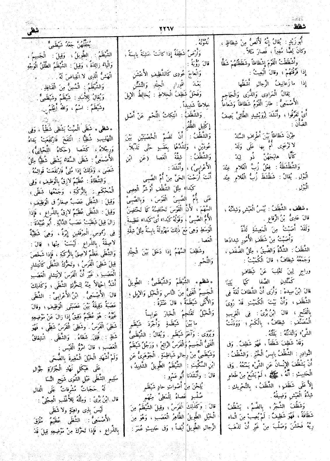 ( شظف ) الشَّظَفُ يُبْس العيش وشِدَّتُه قال عديّ ابن الرِّقاعِ ولقد أَصَبْتُ من المَعِيشَةِ لَذَّةً وأَصَبتُ من شَظَفِ الأُمور شِدادَها الشَّظَفُ الشّدة والضِّيقُ مثل الضَّفَفِ وجمعه شِظافٌ قال الكميت وراجٍ لِينَ تَغْلِبَ عن شَِظافٍ كمُتَّدنِ الصَّفا كَيْما يَلِينَا قال ابن سيده وأَرى أَن الشَّظافَ لغة في الشَّظَفِ وأَن بيت الكُمَيْتِ قد روي بالفتح قال ابن بري في الغريب المصنّف شِظاف بالكسر ووَدَنْتُ الشيءَ واتَّدَنْتُه بَلَلْتُه وقد شَظِفَ شَظَفاً فهو شَظِفٌ وفي النوادر الشِّظْفُ يابسُ الخُبز والشَّظْفُ أَن يَشْظُفَ الإنسان عن الشيء يَمْنعُه وفي الحديث أَنه صلى اللّه عليه وسلم لم يشبع من طعام إلا على شَظَفٍ الشَّظَفُ بالتحريك شدّة العيش وضِيقُه وشَظُفَ الشجر بالضم يَشْظُفُ شَظافةً فهو شَظِيفٌ لم يُصِبْ من الماء ريَّه فَخَشُنَ وصَلُبَ من غير أَن تذهب نُدُوّتُه وأَرض شَظِفةٌ إذا كانت خَشِنةً يابسةً قال رؤبة وانْعاجَ عُودي كالشَّظِيف الأَخْشَنِ بعَدَ اقْوِرارِ الجِلْدِ والتَّشَنُّنِ وفحل شَظِفُ الخِلاطِ يخالِط الإبل خِلاطاً شديداً والشَّظَفُ انْتِكاثُ اللحم عن أَصل إكلِيل الظُّفُرِ والشَّظْف أَن تَضُمّ الخُصْيَتَينِ بين عُودَين وتشدهما بعَقَبٍ حتى تَذْبُلا والشَّظْفُ شِقَّةُ العصا عن ابن الأَعرابي وأَنشد أَنتَ أَرَحْت الحَيَّ من أُمّ الصَّبي كَبْداء مِثْلَ الشَّظْفِ أَو شَرّ العِصي عنى بأُمّ الصبي القَوْسَ وبالصبيّ السهمَ لأَن القوس تَحْتَضِنُه كما تحتضن الأُم الصبيّ وقوله كَبداء أَي كبداء عظيمة الوسط وهي مع ذلك مهزولة يابسة مثل شِقّة العصا وشَظِفَ السهمُ إذا دخل بين الجلد واللحم
