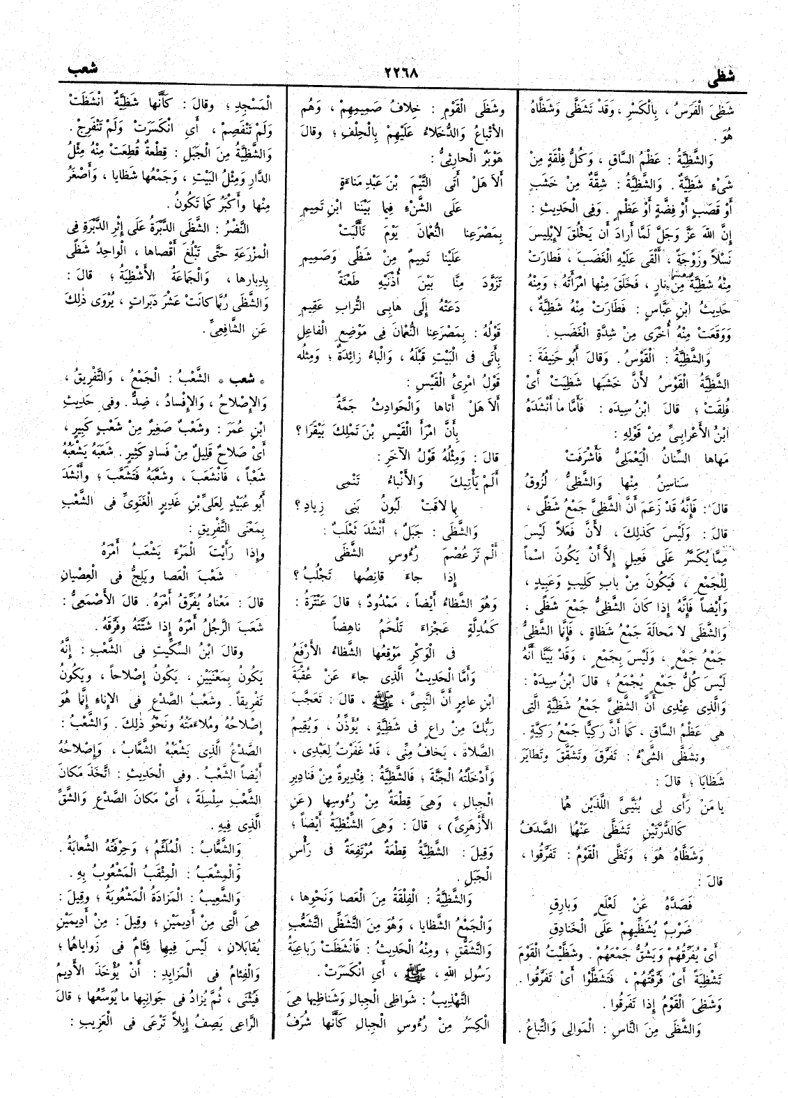 قال معناه يُفَرِّقُ أَمْرَه قال الأَصْمَعِيُّ شَعَبَ الرَّجُلُ أَمْرَهُ إِذا شَتَّتَه [ ص 498 ] وفَرَّقَه وقال ابن السِّكِّيت في الشَّعْبِ إِنه يكونُ بمَعْنَيَيْنِ يكونُ إِصْلاحاً ويكونُ تَفْريقاً وشَعْبُ الصَّدْعِ في الإِناءِ إِنما هو إِصلاحُه ومُلاءَمَتُه ونحوُ ذلك والشَّعْبُ الصَّدْعُ الذي يَشْعَبُهُ الشَّعّابُ وإِصْلاحُه أَيضاً الشَّعْبُ وفي الحديث اتَّخَذَ مكانَ الشَّعْبِ سِلْسلةً أَي مكانَ الصَّدْعِ والشَّقِّ الذي فيه والشَّعّابُ المُلَئِّمُ وحِرْفَتُه الشِّعابةُ والمِشْعَبُ المِثْقَبُ المَشْعُوبُ به والشَّعِيبُ المَزادةُ المَشْعُوبةُ وقيل هي التي من أَديمَين وقيل من أَدِمَينِ يُقابَلان ليس فيهما فِئامٌ في زَواياهُما والفِئامُ في المَزايدِ أَن يُؤْخَذَ الأَدِيمُ فيُثْنى ثم يُزادُ في جَوانِبِها ما يُوَسِّعُها قال الراعي يَصِفُ إِبِلاً تَرعَى في العَزيبِ