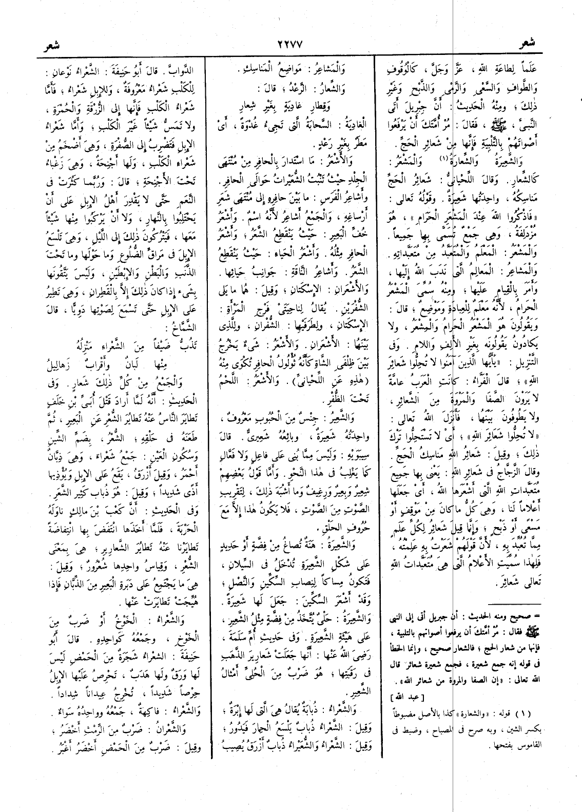 ( * قوله « والشعارة » كذا بالأصل مضبوطاً بكسر الشين وبه صرح في المصباح وضبط في القاموس بفتحها ) والمَشْعَرُ كالشِّعارِ وقال اللحياني شعائر الحج مناسكه واحدتها شعيرة وقوله تعالى فاذكروا الله عند المَشْعَرِ الحرام هو مُزْدَلِفَةُ وهي جمعٌ تسمى بهما جميعاً والمَشْعَرُ المَعْلَمُ والمُتَعَبَّدُ من مُتَعَبَّداتِهِ والمَشاعِرُ المعالم التي ندب الله إِليها وأَمر بالقيام عليها ومنه سمي المَشْعَرُ الحرام لأَنه مَعْلَمٌ للعبادة وموضع قال ويقولون هو المَشْعَرُ الحرام والمِشْعَرُ ولا يكادون يقولونه بغير الأَلف واللام وفي التنزيل يا أَيها الذين آمنوا لا تُحِلُّوا شَعائرَ الله قال الفرّاء كانت العرب عامة لا يرون الصفا والمروة من الشعائر ولا يطوفون بينهما فأَنزل الله تعالى لا تحلوا شعائر الله أَي لا تستحلوا ترك ذلك وقيل شعائر الله مناسك الحج وقال الزجاج في شعائر الله يعني بها جميع متعبدات الله التي أَشْعرها الله أَي جعلها أَعلاماً لنا وهي كل ما كان من موقف أَو مسعى أَو ذبح وإِنما قيل شعائر لكل علم مما تعبد به لأَن قولهم شَعَرْتُ به علمته فلهذا سميت الأَعلام التي هي متعبدات الله تعالى شعائر والمشاعر مواضع المناسك والشِّعارُ الرَّعْدُ قال وقِطار غادِيَةٍ بِغَيْرِ شِعارِ الغادية السحابة التي تجيء غُدْوَةً أَي مطر بغير رعد والأَشْعَرُ ما استدار بالحافر من منتهى الجلد حيث تنبت الشُّعَيْرات حَوالَي الحافر وأَشاعرُ الفرس ما بين حافره إِلى منتهى شعر أَرساغه والجمع أَشاعِرُ لأَنه اسم وأَشْعَرُ خُفِّ البعير حيث ينقطع الشَّعَرُ وأَشْعَرُ الحافرِ مِثْلُه وأَشْعَرُ الحَياءِ حيث ينقطع الشعر وأَشاعِرُ الناقة جوانب حيائها والأَشْعَرانِ الإِسْكَتانِ وقيل هما ما يلي الشُّفْرَيْنِ يقال لِناحِيَتَيْ فرج المرأَة الإِسْكَتانِ ولطرفيهما الشُّفْرانِ وللذي بينهما الأَشْعَرانِ والأَشْعَرُ شيء يخرج بين ظِلْفَي الشاةِ كأَنه ثُؤْلُولُ الحافر تكوى منه هذه عن اللحياني والأَشْعَرُ اللحم تحت الظفر والشَّعِيرُ جنس من الحبوب معروف واحدته شَعِيرَةٌ وبائعه شَعِيرِيٌّ قال سيبويه وليس مما بني على فاعِل ولا فَعَّال كما يغلب في هذا النحو وأَما قول بعضهم شِعِير وبِعِير ورِغيف وما أَشبه ذلك لتقريب الصوت من الصوت فلا يكون هذا إِلا مع حروف الحلق والشَّعِيرَةُ هَنَةٌ تصاغ من فضة أَو حديد على شكل الشَّعيرة تُدْخَلُ في السِّيلانِ فتكون مِساكاً لِنِصابِ السكين والنصل وقد أَشْعَرَ السكين جعل لها شَعِيرة والشَّعِيرَةُ حَلْيٌ يتخذ من فضة مثل الشعير على هيئة الشعيرة وفي حديث أُم سلمة رضي الله عنها أَنها جعلت شَارِيرَ الذهب في رقبتها هو ضرب من الحُلِيِّ أَمثال الشعير والشَّعْراء ذُبابَةٌ يقال هي التي لها إِبرة وقيل الشَّعْراء ذباب يلسع الحمار فيدور وقيل الشَّعْراءُ والشُّعَيْرَاءُ ذباب أَزرق يصيب الدوابَّ قال أَبو حنيفة الشَّعْراءُ نوعان للكلب شعراء معروفة وللإِبل شعراء فأَما شعراء الكلب فإِنها إِلى الزُّرْقَةِ والحُمْرَةِ ولا تمس شيئاً غير الكلب وأَما شَعْراءُ الإِبل فتضرب إِلى الصُّفْرة وهي أَضخم من شعراء الكلب ولها أَجنحة وهي زَغْباءُ تحت الأَجنحة قال وربما كثرت في النعم حتى لا يقدر أَهل الإِبل على أَن يجتلبوا بالنهار ولا أَن يركبوا منها شيئاً معها فيتركون ذلك إِلى الليل وهي تلسع الإِبل في مَراقِّ الضلوع وما حولها وما تحت الذنب والبطن والإِبطين وليس يتقونها بشيء إِذا كان ذلك إِلا بالقَطِرانِ وهي تطير على الإِبل حتى تسمع لصوتها دَوِيّاً قال الشماخ تَذُبُّ صِنْفاً مِنَ الشَّعْراءِ مَنْزِلُهُ مِنْها لَبانٌ وأَقْرَابٌ زَهالِيلُ والجمع من كل ذلك شَعارٍ وفي الحديث أَنه لما أَراد قتل أُبَيّ بن خَلَفٍ تطاير الناسُ عنه تَطايُرَ الشُّعْرِ عن البعير ثم طعنه في حلقه الشُّعْر بضم الشين وسكن العين جمع شَعْراءَ وهي ذِبَّانٌ أَحمر وقيل أَزرق يقع على الإِبل ويؤذيها أَذى شديداً وقيل هو ذب