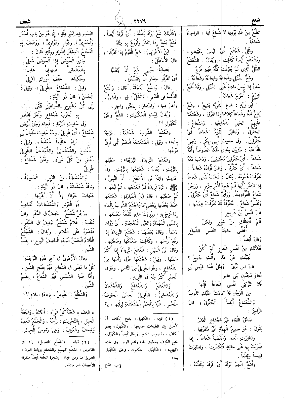 تَطلُعُ من غَدِ يومها لا شُعاعَ لها الواحدة شُعاعةٌ وظِلٌ شَعْشَعٌ أَي ليس بكثيف ومُشَعْشَعٌ أَيضاً كذلك ويقال الشَّعْشَعُ الظِّلُّ الذي لم يُظِلّك كلُّه ففيه فُرَجٌ وشَعُّ السُّنبل وشَعاعُه وشِعاعُه وشُعاعُه سَفاه إِذا يَبِسَ ما دام على السُّنْبُلِ وقد أَشَعَّ الزرْعُ أَخرج شَعاعَه أَبو زيد شاعَ الشيءُ يَشِيعُ وشَعَّ يَشِعُّ شَعّاً وشَعاعاً كلاهما إِذا تَفَرَّقَ وشَعْشَعْنا عليهم الخيلَ نُشَعْشِعُها والشَّعاعُ المتفرِّق وتَطايَرَ القوم شَعاعاً أَي متفرِّقين وفي حديث أَبي بكر رضي الله عنه سَتَرَوْن بعدي مُلْكاً عَضُوضاً وأُمَّةً شَعاعاً أَي متفرِّقين مختلفين وذهبَ دمُه شَعاعاً أَي متفرِّقاً وطارَ فؤَادُه شَعاعاً تَفَرَقتْ هُمَومُه يقال ذهبت نفسي شَعاعاً إِذا انتشر رأْيها فلم تتجه لأَمْر جَزْم ورجل شَعاعُ الفُؤَاد منه ورأْي شَعاعٌ أَي مُتَفَرِّقٌ ونفْس شَعاع متفرِّقة قد تفرَّقَتْ هِمَمُها قال قيس بن ذَريح فلم أَلْفِظْكِ مِنْ شِبَعٍ ولَكِنْ أُقَضِّي حاجةَ النَّفْسِ الشَّعاعِ وقال أَيضاً فقَدْتُكِ مِن نَفْسٍ شَعاعٍ أَلَمْ أَكُنْ نَهَيْتُكِ عن هذا وأَنْتِ جَميعُ ؟ قال ابن برِّيّ ومثل هذا لقيس بن معاذ مجنون بني عامر فَلا تَتْرُكي نَفْسِي شَعاعاً فإِنَّها من الوَجْدِ قَدْ كادَتْ عَلَيْكِ تَذُوبُ والشَّعْشاعُ أَيضاً المُتَفَرِّقُ قال الراجز صَدْقُ اللِّقاءِ غَيْرُ شَعْشاعِ الغَدَرْ يقول هو جميع الهِمة غير متفرقها وتَطايَرَتِ العَصا والقَصَبةُ شَعاعاً إِذا ضربت بها على حائط فَتَكَسَّرتْ وتطايرت قِصَداً وقِطَعاً وأَشَعَّ البعيرُ بَوْله أَي فَرَّقَه وقَطَّعه وكذلك شَعَّ بولَه يَشُعُّه أَي فرَّقه أَيضاً فَشَعَّ يَشِعُّ إِذا انتَشر وأَوْزَعَ به مثله ابن الأَعرابي شَعَّ القومُ إِذا تَفَرَّقُوا قال الأَخطل عِصابةُ سَبْيٍ شَعَّ أَنْ يُتَقَسَّما أَي تَفَرَّقُوا حِذارَ أَن يُتَقَسَّموا قال والشَّعُّ العَجَلةُ قال وانْشَعَّ الذئب في الغنم وانْشلَّ فيها وانْشَنَّ وأَغار فيها واستغار بمعنى واحد ويقال لبيت العَنْكَبُوت الشُّعُّ وحُقُّ الكُهول وشَعْشَعَ الشَّرابَ شَعْشَعَةً مزَجَه بالماء وقيل المُشَعْشَعة الخَمْرُ التي أُرِقَّ مَزْجُها وشَعْشَعَ الثَّريدةَ الزُّرَيْقاءَ سَغْبَلَها بالزَّيْت يقال شَعْشِعْها بالزَّيْت وفي حديث وائِلةَ بن الأَسْقَع أَنَّ النبي صلى الله عليه وسلم ثَرَدَ ثَرِيدةً ثم شَعْشَعَها ثم لبَّقها ثم صَعْنَبَها قال ابن المبارك شَعْشَعَها خلَط بعضَها ببعض كما يُشَعْشَعُ الشرابُ بالماء إِذا مُزِجَ به ورُوِيتْ هذه اللفظةُ سَغْسَغَها بالسين المهملة والغين المعجمة أَي روَّاها دَسَماً وقال بعضهم شَعْشَعَ الثريدة إِذا رفع رأْسها وكذلك صَعْلَكَها وصعْنَبَها وقال ابن شميل شَعْشَعَ الثَّريدة إِذا أَكْثَرَ سَمْنَها وقيل شَعْشَعَها طَوَّلَ رأْسها من الشَّعْشاعِ وهو الطويل من الناس وهو في الخمر أَكثر منه في الثريد والشَّعْشَّعُ والشَّعْشاعُ والشَّعْشَعانُ والشَّعْشَعانيُّ الطَّوِيلُ الحَسنُ الخفيفُ اللحْمِ شُبِّه بالخمر المُشَعْشَعةِ لِرِقَّتِها ياءُ النسب فيه لغير علة إِنما هو من باب أَحمرَ وأَحْمَرِيٍّ ودوَّارٍ ودَوَّارِيٍّ ووصف به العجاج المِشْفَرَ لطوله ورِقَّتِه فقال تُبادِرُ الحَوْضَ إِذا الحَوْضُ شُغِلْ بِشَعْشَعانيٍّ صُهابيٍّ هَدِلْ ومَنْكِباها خَلْفَ أَوْراكِ الإِبِلْ وقيل الشَّعْشاعُ الطويل وقيل الحسَن قال ذو الرمة إِلى كُلِّ مَشْبُوحِ الذِّراعينِ تُتَّقَى بهِ الحَرْبُ شَعْشاعٍ وآخَرَ فَدْغَمِ وفي حديث البَّيْعةِ فجاء أَبْيَضُ شَعْشاعٌ أَي طويل ومنه حديث سفيان بن نُبَيْح تراهُ عَظِيماً شَعْشَعاً وقيل الشَّعْشاعُ والشَّعْشَعانيُّ والشَّعْشَعانُ الطويلُ العُنقِ من كل شيء وعُنُقٌ شَعْشاعٌ طويل والشَّعْشَعانةُ مِن الإِبل الجَسِيمةُ وناقة شَعْشَعانة قال ذو الرمة هَيْهاتَ خَرقاءُ 