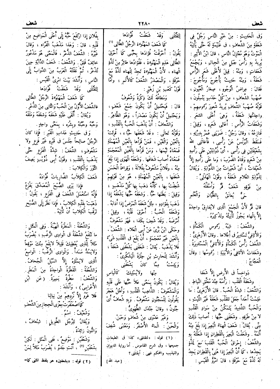 وفي الحديث من خَيرِ الناس رجلٌ في شَعَفةٍ من الشِّعافِ في غَنَيْمَةٍ له حتى يأْتيَه الموتُ وهو معتزل الناس قال ابن الأَثير يريدُ به رأْسَ جبل من الجبال ويجمع شَعَفات ومنه قيل لأَعْلى شعر الراْس شَعَفَة ومنه حديث يأْجوج ومأْجوجَ فقال عِراضُ الوُجوهِ صِغارُ العُيون شُهْبُ الشِّعافِ من كل حدَب يَنْسِلُون قوله صهب الشِّعاف يريد شعور رؤوسهم واحدتها شَعَفة وهي أَعْلى الشعر وشَعَفاتُ الرأْس أَعالي شعره وقيل قَنازِعُه وقال رجل ضربني عمر بدِرَّتِه فسقط البُرْنُسُ عن رأْسي فأَغاثني اللّه بشُعَيْفَتَيْنِ في رأْسي أَي ذُؤابَتين على رأْسه من شعره وقتاه الضرب وما على رأْسه إلا شُعَيْفاتٌ أَي شُعَيرات من الذؤابة ويقال لذؤابة الغلام شَعَفةٌ وقول الهذلي من فَوْقِه شَعَفٌ قَرٌّ وأَسْفلُه حيٌّ يُعانَقُ بالظَّيّانِ والعُتُمِ قال قرّ لأَن الجمع الذي لا يفارق واحده إلا بالهاء يجوز تأْنيثه وتذكيره والشَّعَفُ شِبْه رؤوس الكَمْأَةِ والأَثافي تَسْتَدير في أَعلاها وقال الأَزهري الشَّعَفُ رأْسُ الكمأَة والأَثافي المستديرةُ وشَعَفاتُ الأَثافي والأَبنية رؤوسُها وقال العجاج دواخِساً في الأَرض إلاَّ شَعَفا وشَعَفةُ القلبِ رأْسُه عند مُعَلَّقِ النِّياطِ والشَّعَفُ شِدّة الحُبِّ قال الأَزهريّ ما علمت أَحداً جعل للقلب شَعَفة غير الليث والحُبُّ الشديد يتمكن من سَوادِ القلب لا من طَرفه وشَعَفَني حُبُّها أَصابَ ذلك مني يقال شَعَفَ الهِناءُ البعيرَ إذا بلَغ منه أَلَمُه وشَعَفْتُ البعِيرَ بالقَطِرانِ إذا شَعَلْتَه به والشَّعْفُ إحْراقُ الحُبِّ القلبَ مع لذة يجدها كما أَن البعير إذا هُنِئَ بالقطران يجد له لذة مع حُرْقة قال امْرُؤ القيس لِتَقتُلَني وقد شَعَفْتُ فُؤادَها كما شَعَفَ المَهْنُوءةَ الرجلُ الطَّالي يقول أَحْرَقْتُ فؤادَها بِحبي كما أَحرق الطالي هذه المَهْنوءة ففؤادها طائر من لذة الهِناء لأَن المهنوءة تجد للهِناء لذة مع حُرْقة والمصدر الشَّعَفُ كالأَلم وأَما قول كعب بن زهير ومَطافُه لك ذِكْرةٌ وشُعوف قال فيحتمل أَن يكون جمع شَعْف ويحتمل أَن يكون مصدراً وهو الظاهر والشَّعافُ أَن يذهَب الحُبُّ بالقلب وقوله تعالى قد شَعَفَها حُبّاً قُرِئتْ بالعين والغين فمن قرأَها بالعين المهملة فمعناه تَيَّمها ومن قرأَها بالغين المعجمة أَي أَصاب شَغافَها وشَعَفَه الهَوى إذا بلغ منه وفلان مَشْعُوفٌ بفلانة وقراءةُ الحسن شَعَفَها بالعين المهملة هو من قولهم شُعِفْتُ بها كأَنه ذَهَبَ بها كل مَذهب وقيل بطَنَها حُبّاً وشعَفَه حُبُّها يَشْعَفُه إذا ذهب بفؤاده مثل شعفه المرض إذا أَذابَه وشعَفَه الحُبُّ أَحرق قلبَه وقيل أَمرضه وقد شُعِفَ بكذا فهو مَشْعوفٌ وحكى ابن بري عن أَبي العلاء الشَّعَفُ بالعين غير معجمة أَن يقع في القلب شيء فلا يذهب يقال شَعَفَني يشعَفُني شَعَفاً وأَنشد للحرث بن حِلِّزَة اليَشْكُري ويَئِسْتُ مما كان يَشْعَفُني منها ولا يُسْلِيك كالياس ويقال يكون بمعنى عَلا حُبها على قلبه والمَشْعُوفُ الذاهِبُ القلب وأَهل هجرَ يقولون للمجنون مَشْعُوف وبه شُعافٌ أَي جُنون وقال جَنْدَلٌ الطُّهَويُّ وغَيْر عَدْوى من شُعافٍ وحَبَنْ والحبنُ الماء الأَصفر ومعنى شُعِفَ بفلان إذا ارتفع حُبُّه إلى أَعلى المواضع من قلبه قال وهذا مذهب الفرَّاء وقال غيره الشَّعَفُ الذُّعْر فالمعنى هو مَذْعُورٌ خائف قَلِقٌ والشَّعَفُ شعَف الدابة حين تُذْعَر ثم نقلته العرب من الدوابّ إلى الناس وأَنشد بيت امرئ القيس لِتَقْتُلَني وقد شَعَفْتُ فُؤادَها كما شَعَفَ المَهْنوءةَ الرجلُ الطَّالي فالشعَفُ الأَوَّلُ من الحبّ والثاني من الذُّعْر ويقال أَلقى عليه شَعَفَه وشَغَفَه ومَلَقَه وحُبَّه وحُبَّته بمعنى واحد وفي حديث عذاب القبر فإذا كان الرجل صالحاً جَلَسَ في قبره غير فَزِعٍ ولا مَشْعُوفٍ الشَّعَفُ شِدَّةُ الفَزَع حتى يذهب بالقلب وقول أَبي ذؤيب يصف الثور والكلاب شَعَفَ الكِلابُ الضاري