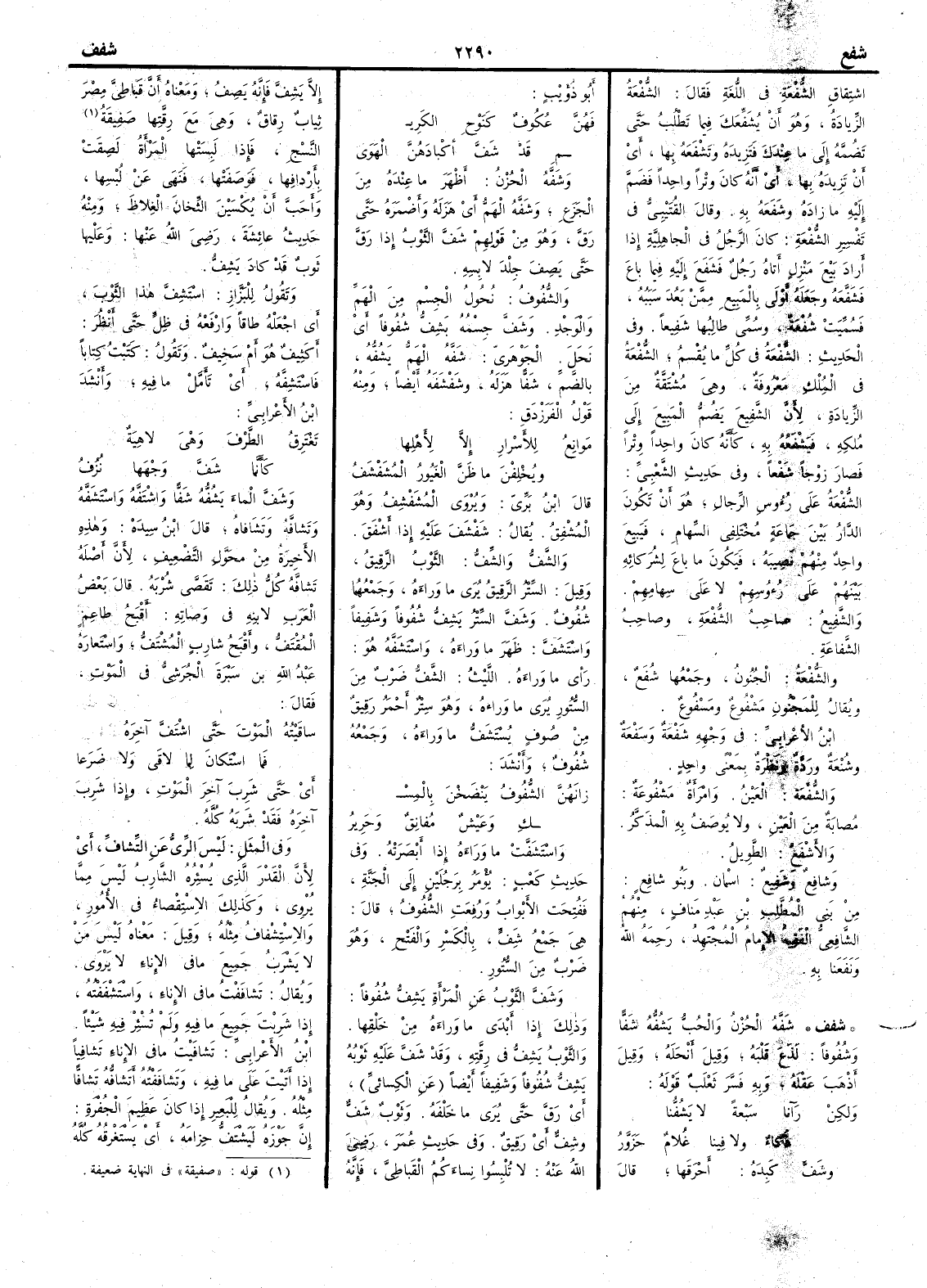 عن اشتِقاقِ الشُّفْعةِ في اللغة فقال الشُّفْعَةُ الزِّيادةُ وهو أَنْ يُشَفِّعَك فيما تَطْلُب حتى تَضُمَّه إِلى ما عندك فَتَزِيدَه وتَشْفَعَه بها أَي أَن تزيده بها أَي أَنه كان وتراً واحداً فَضَمَّ إِليه ما زاده وشَفَعَه به وقال القتيبي في تفسير الشُّفْعة كان الرجل في الجاهلية إِذا أَراد بَيْعَ منزل أَتاه رجل فشَفَع إِليه فيما باعَ فَشَفَّعَهُ وجَعَله أَولى بالمَبِيعِ ممن بَعُدَ سَبَبُه فسميت شُفْعَةً وسُمِّي طالبها شَفِيعاً وفي الحديث الشُّفْعَةُ في كُلّ ما يُقْسَمُ الشفعة في الملك معروفة وهي مشتقة من الزيادة لأَن الشفِيع يضم المبيع إِلى ملكه فَيَشْفَعُه به كأَنه كان واحداً وتراً فصار زوجاً شفعاً وفي حديث الشعبي الشُّفْعة على رؤوس الرجال هو أَن تكون الدَّار بين جماعة مختلفي السِّهام فيبيع واحد منهم نصيبه فيكون ما باع لشركائه بينهم على رؤوسهم لا على سِهامِهم والشفِيعُ صاحب الشُّفْعة وصاحبُ الشفاعةِ والشُّفْعةُ الجُنُونُ وجمعها شُفَعٌ ويقال للمجنون مَشْفُوعٌ ومَسْفُوعٌ ابن الأَعرابي في وجهه شَفْعةٌ وسَفْعةٌ وشُنْعةٌ ورَدَّةٌ ونَظْرةٌ بمعنى واحد والشُّفْعةُ العين وامرأَة مَشْفُوعةٌ مُصابةٌ من العين ولا يوصف به المذكر والأَشْفَعُ الطوِيلُ وشافِعٌ وشفِيعٌ اسمان وبنو شافِعٍ من بني المطلب بنِ عَبد مناف منهم الشافعيّ الفقيهُ الإِمام المجتهد رحمه الله ونفعنا به ( شفف ) شَفَّه الحُزْنُ والحُبُّ يَشُفُّه شَفّاً وشُفُوفاً لذَعَ قَلْبَه وقيل أَنحَلَه وقيل أَذْهَبَ عقله وبه فسر ثعلب قوله ولكن رآنا سَبعْة لا يَشُفّنا ذَكاء ولا فِينا غُلامٌ حَزَوّرُ وشَفَّ كَبِدَه أَحْرَقَها قال أَبو ذؤيب فَهُنَّ عُكُوفٌ كَنَوْحِ الكَري مِ قد شَفَّ أَكْبادَهُنَّ الهوى وشفَّه الحُزْنُ أَظهر ما عنده من الجَزَعِ وشفَّه الهمُّ أَي هَزَلَه وأَضْمَرَه حتى رَقَّ وهو من قولهم شَفَّ الثوبُ إذا رَقَّ حتى يَصِف جلد لابِسِه والشُّفوفُ نُحُولُ الجِسْم من الهَمِّ والوَجْدِ وشَفَّ جِسمُه يَشِفُّ شُفُوفاً أَي نَحَلَ الجوهري شَفَّهُ الهَمُّ يَشُفُّه بالضم شَفّاً هزَله وشَفْشَفَه أَيضاً ومنه قول الفرزدق مَوانِع للأَسْرارِ إلا لأَهلِها ويُخْلِفْنَ ما ظَنَّ الغَيُورُ المُشَفْشَفُ قال ابن بري ويروى المُشَفْشِفُ وهو المُشْفِقُ يقال شَفْشَفَ عليه إذا أَشْفَقَ والشَّفُّ والشِّفُّ الثوبُ الرقيقُ وقبل السِّتْر الرقيق يُرى ما وراءه وجمعهما شُفُوفٌ وشَفَّ السترُ يَشِفُّ شُفُوفاً وشَفِيفاً واسْتَشَفَّ ظهر ما وراءه واسْتَشَفَّه هو رأَى ما وراءه الليث الشَّفُ ضرب من السُّتور يُرى ما وراءه وهو ستر أَحمر رقيق من صُوف يُسْتَشَفُّ ما وراءه وجمعه شُفُوف وأَنشد زانَهُنَّ الشُّفُوفُ ينْضَخْنَ بالمِس كِ وعَيْشٌ مُفانِقٌ وحَريرُ واسْتَشَفَّتْ ما وراءه إذا أَبْصَرَتْه وفي حديث كعب يُؤْمَرُ برجلين إلى الجنة فَفُتِحَت الأَبوابُ ورفعت الشُّفُوفُ قال هي جمعِ شِف بالكسر والفتح وهو ضرب من السّتور وشَفَّ الثوبُ عن المرأَة يَشِفُّ شُفُوفاً وذلك إذا أَبدى ما وراءه من خَلْقِها والثوب يَشِفُّ في رِقَّتِه وقد شَفَّ عليه ثوبُه يَشِفُّ شُفوفاً وشَفِيفاً أَيضاً عن الكسائي أَي رَقَّ حتى يرى ما خلفه وثوب شَفّ وشِفّ أَي رقيق وفي حديث عمر رضي اللّه عنه لا تُلْبِسوا نساءكم القَباطِيَّ فإنه إن لا يَشِفَّ فإنه يَصِفُ ومعناه أَنَّ قَباطِيَّ مصر ثياب رِقاقٌ وهي مع رِقَّتِها صَفِيقَةُ