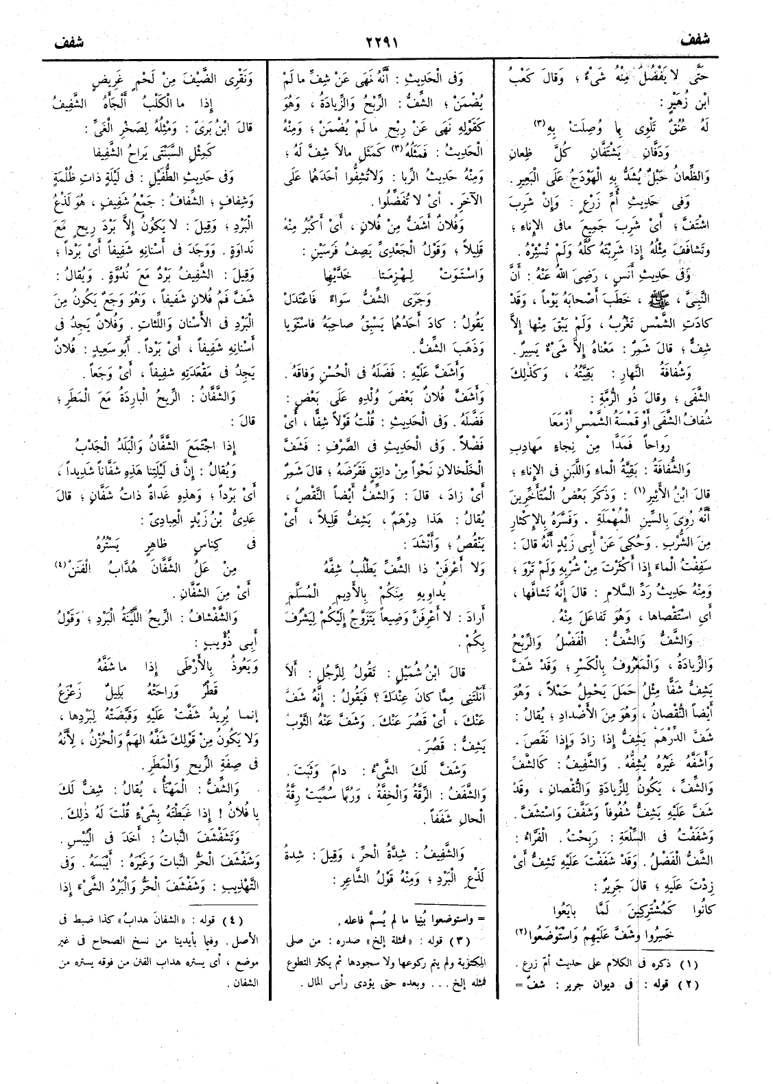كمثَل ما لا شِفَّ له ومنه حديث الرِّبا ولا تُشِفُّوا أَحدهما على الآخر أَي لا تُفَضِّلُوا وفلان أَشَفُّ من فلان أَي أَكبر منه قليلاً وقولُ الجَعْدِيّ يصف فرسين واسْتَوَتْ لِهْزِمَتا خَدَّيْهِما وجَرى الشِّفُّ سَواءً فاعْتَدَلْ يقول كاد أَحدُهما يسْبِقُ صاحِبَه فاسْتَويَا وذهب الشِّفُّ وأَشَفَّ عليه فضَلَه في الحُسْن وفاقَه وأَشَفَّ فلان بعضَ ولده على بعض فَضَّله وفي الحديث قلت قَوْلاً شِفّاً أَي فضلاً وفي الحديث في الصَّرْفِ فَشَفَّ الخَلْخالان نَحْواً من دانِقٍ فقَرَضَه قال شمر أَي زاد قال والشِّفُّ أَيضاً النَّقْصُ يقال هذا درهم يَشِفُّ قَليلاً أَي يَنْقُصُ وأَنشد ولا أَعْرِفَنْ ذا الشِّفِّ يَطْلُبُ شِفَّه يُداويه منْكم بالأَديمِ المُسَلَّمِ أَراد لا أَعرِفن وَضِيعاً يَتَزَوَّجُ إليكم لِيَشْرُفَ بكم قال ابن شميل تقول للرجل أَلا أَنَلْتَني مما كان عندك ؟ فيقول إنه شَفَّ عنك أَي قَصُرَ عنك وشَفَّ عنه الثوب يَشِفُّ قَصُرَ وشَفَّ لك الشيءُ دامَ وثبت والشَّفَفُ الرِّقّة والخِفّة وربما سميت رِقَّةُ الحال شَفَفاً والشَّفيفُ شِدَّةُ الحَرِّ وقيل شِدةُ لَذْعِ البرد ومنه قول الشاعر ونَقْري الضَّيْفَ من لَحْمٍ غَريضٍ إذا ما الكَلْبُ أَلْجأَه الشَّفِيفُ قال ابن بري ومثله لصخر الغَيّ كمِثْلِ السَّبَنْتى يَراحُ الشَّفِيفا وفي حديث الطفيل في ليلة ذات ظُلْمة وشِفافٍ الشِّفافُ جمع شَفيفٍ هو لَذْعُ البرد وقيل لا يكون إلا بَرْدَ رِيحٍ مع نَداوةٍ ووجَدَ في أَسنانه شَفيفاً أَي بَرْداً وقيل الشَّفيفُ بَرْدٌ مع نُدُوَّةٍ ويقال شَفَّ فَمُ فلان شفيفاً وهو وجَع يكون من البرد في الأَسنان واللِّثات وفلان يجد في أَسنانه شَفِيفاً أَي برداً أَبو سعيد فلان يَجِد في مَقْعَدَته شفيفاً أَي وجَعاً والشَّفَّانُ الريح الباردة مع المطر قال غذا اجتمعَ الشَّفَّانُ والبلَدُ الجَدْبُ ويقال إن في ليلتنا هذه شَفَّاناً شَديداً أَي برداً وهذه غَداةٌ ذاتُ شَفّانٍ قال عدي بن زيد العبادي في كِناسٍ ظاهِرٍ يَسْتُرُه من عَلُ الشَّفّان هُدَّابُ الفَنَنْ