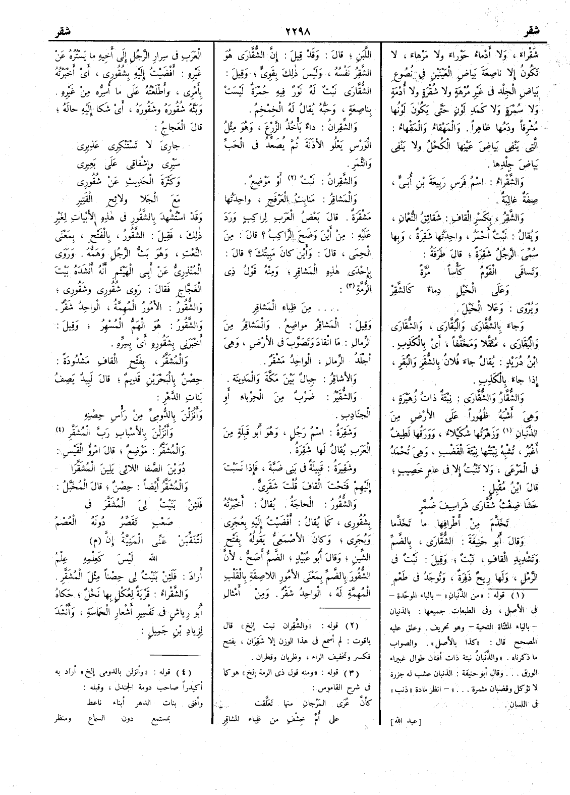من ظِباء المَشاقِر وقيل المشاقر مواضع والمَشاقِرُ من الرمال ما انقاد وتَصَوَّب في الأَرض وهو أَجلد الرمال الواحد مَشْقَرٌ والأَشاقرُ جبال بين مكة والمدينة والشُّقَيْرُ ضرب من الحِرْباءِ أَو الجنَادِب وشَقِرَةُ اسم رجل وهو أَبو قبيلة من العرب يقال لها شَقِرَة وشَقِيرَة قبيلة في بني ضَبَّةَ فإِذا نسبت إِليهم فتحت القاف قلت شَقَرِيٌّ والشُّقُور الحاجة يقال أَخبرته بشُقُورِي كما يقال أَفْضَيْتُ إِليه بِعُجَري وبُجَرِي وكان الأَصمعي يقوله بفتح الشين وقال أَبو عبيد الضم أَصح لأَن الشُّقُور بالضم بمعنى الأُمورِ اللاصقة بالقلب المُهِمَّةِ له الواحد شَقْرٌ ومن أَمثال العرب في سِرارِ الرجل إِلى أَخيه ما يَسْتُره عن غيره أَفْضَيْتُ إِليه بشُقُورُي أَي أَخبرته بأَمري وأَطلعته على ما أُسِرُّه من غيره وبَثَّهُ شُقُورَهُ وشَقُورَهُ أَي شكا إِليه حاله قال العجاج جارِيَ لا تَسْتَنْكِرِي عَذِيرِي سَيْرِي وإِشْفاقِي على بَعيرِي وكَثْرَةَ الحديثِ عن شَقُورِي مَعَ الجَلا ولائِحِ القَتِيرِ وقد استشهد بالشَّقورِ في هذه الأَبيات لغير ذلك فقيل الشَّقُور بالفتح بمعنى النعت وهو بَثُّ الرجل وهَمُّهُ وروى المنذري عن أَبي الهيثم أَنه أَنشده بيت العجاج فقال روي شُقُورِي وشَقُورِي والشُّقُور الأُمور المهمة الواحد شَقْرٌ والشَّقُورُ هو الهم المُسْهِرُ وقيل أَخبرني بشَقُوره أَي بِسِرِّه والمُشَقَّرُ بفتح القاف مشدودة حصن بالبحرين قديم قال لبيد يصف بنات الدهر وأَنْزَلْنَ بالدُّومِيّ من رأْسِ حِصْنِهِ وأَنْزَلْنَ بالأَسْبَابِ رَبَّ المُشَقَّرِ