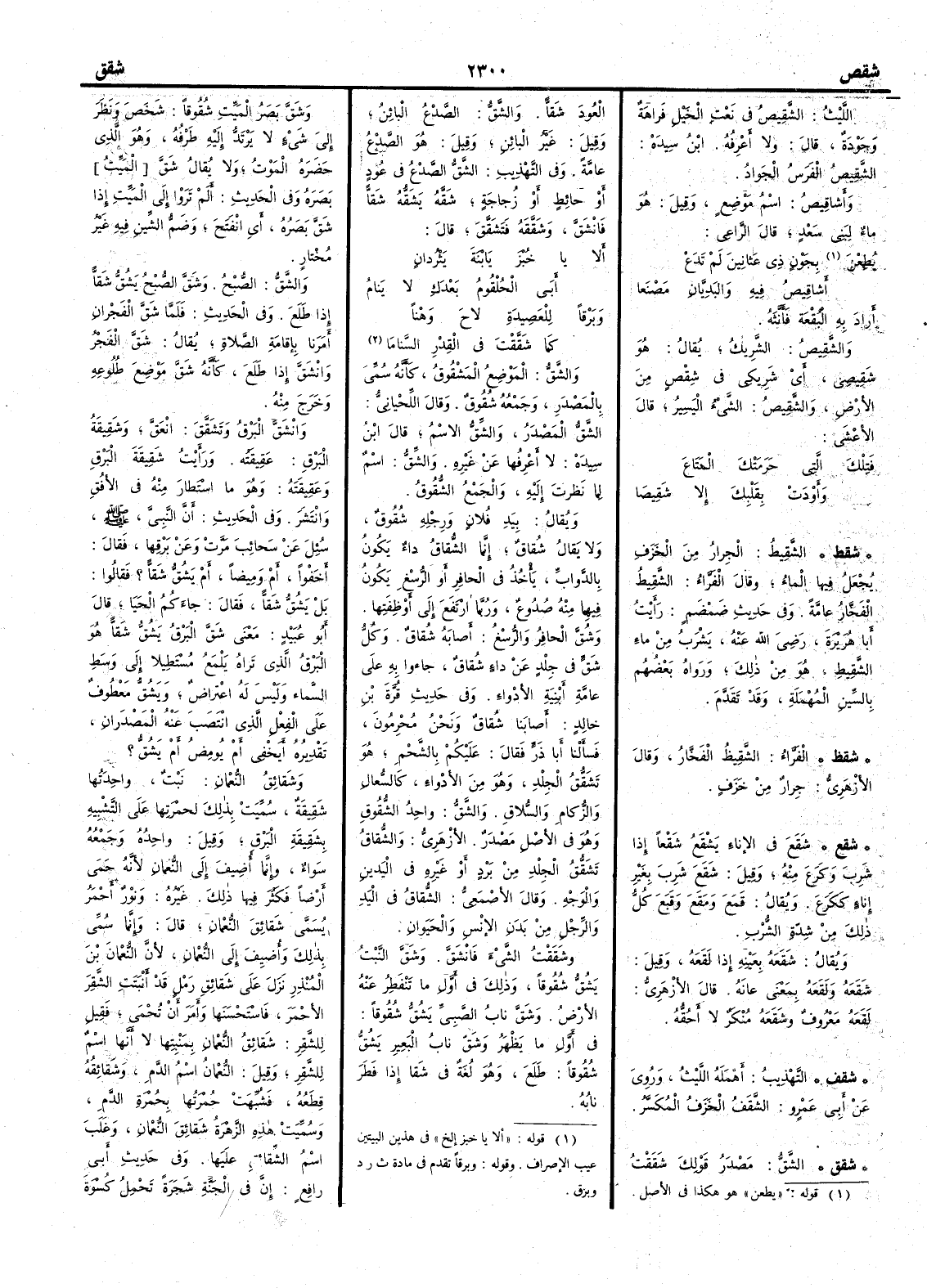 ( شقع ) شَقَعَ في الإِناءِ يَشْقَعُ شَقْعاً إِذا شَرِبَ وكَرَعَ منه وقيل شَقَعَ شَرِبَ بغير إِناءٍ كَكَرع ويقال قَمَعَ ومَقَعَ وقَبَعَ كل ذلك من شِدّة الشرب ويقال شَقَعَه بعينه إِذا لقَعَه وقيل شَقَعَه ولَقَعَه بمعنى عانَه قال الأَزهريّ لَقَعه معروف وشَقَعه مُنْكَر لا أَحُقّه ( شقف ) التهذيب أَهمله الليث وروي عن أَبي عمرو الشَّقَفُ الخَزَفُ المُكَسَّر ( شقق ) الشَّقُّ مصدر قولك شَقَقْت العُود شَقّاً والشَّقُّ الصَّدْع البائن وقيل غير البائن وقيل هو الصدع عامة وفي التهذيب الشَّقُّ الصدع في عود أَو حائط أو زُجاجة شَقَّه يَشُقُّه شَقّاً فانْشَقَّ وشقَّقَه فتَشَقَّقَ قال ألا يا خُبْزَ يا ابْنةَ يَثْرُدانٍ أَبَى الحُلْقومُ بَعْدَكِ لا يَنامُ وبَرْقاً للعَصِيدة لاحَ وَهْناً كما شَقَّقْت في القِدْرِ السَّناما
