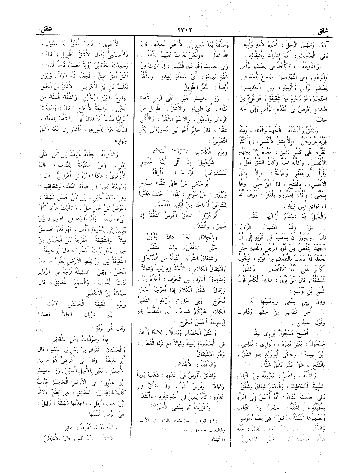 آدم وشَقِيقُ الرجل أَخوه لأُمّه وأَبيه وفي الحديث أَنتم إخوانُنا وأَشِقَّاؤنا والشَّقِيقةُ داء يأْخذ في نصف الرأْس والوجه وفي التهذيب صُداع يأْخذ في نصف الرأْس والوجه وفي الحديث احْتَجَم وهو مُحْرِمٌ من شَقِيقةٍ هو نوع من صُداعٍ يَعْرِض في مُقَدَّمِ الرأْس وإلى أَحد جانبيه والشِّقُّ والمَشَقَّةُ الجهد والعناء ومنه قوله عز وجل إلا بِشِقّ الأَنْفُس وأكثر القراء على كسر الشين معناه إلا بجهد الأَنفس وكأنه اسم وكأَن الشَّقَّ فعل وقرأ أَبو جعفر وجماعة إلا بشَقّ الأَنفُس بالفتح قال ابن جني وهما بمعنى وأَنشد لعمرو بن مِلْقَطٍ وزعم أَنه في نوادر أَبي زيد والخَيْل قد تَجْشَمُ أَرْبابُها الشقْ قَ وقد تَعْتَسِفُ الرَّاوِيهْ قال ويجوز أَن يذهب في قوله إلى أَن الجهد يَنْقُص من قوة الرجل ونفسه حتى يجعله قد ذهب بالنصف من قوته فيكون الكسر على أَنه كالنصف والشِّقُّ المَشَقَّة قال ابن بري شاهد الكسر قول النمر بن تولب وذي إبِلٍ يَسْعَى ويحْسِبُها له أَخي نَصَبٍ مِنْ شِقِّها ودُؤُوبِ وقول العجاج أَصْبَحَ مَسْحولٌ يُوازِي شِقّا مَسْحولٌ يعني بَعِيره ويُوازي يُقاسي ابن سيده وحكى أَبو زيد فيه الشَّقّ بالفتح شَقَّ عليه يَشُقُّ شَقّاً والشُّقَّةُ بالضم معروفة من الثياب السبِيبةُ المستطيلة والجمع شِقاقٌ وشُقَقٌ وفي حديث عثمان أَنه أَرسل إلى امرأَة بشُقَيْقةٍ الشُّقّة جنس من الثياب وتصغيرُها شُقَيْقةٌ وقيل هي نصب ثوب والشُّقَّة والشِّقّةُ السفر البعيد يقال شُقَّةٌ شاقَّةٌ وربما قالوه بالكسر الأَزهري والشُّقَّةُ بُعْدُ مَسيرٍ إلى الأَرض البعيدة قال الله تعالى ولكن بَعُدَت عليهم الشُّقَّةُ وفي حديث وفد عبد القيس إنَّا نَأْتِيكَ من شُقَّةٍ بعيدة أَي مسافة بعيدة والشُّقَّةُ أَيضاً السفرُ الطويل وفي حديث زُهَير على فَرسٍ شَقَّاءَ مَقَّاءَ أَي طويلة والأشْقُّ الطويلُ من الرجال والخيل والاسم الشَّققُ والأُنثى شَقَّاء قال جابر أَخو بني معاوية بن بكر التغلبي ويومَ الكُلابِ اسْتَنْزَلَتْ أَسَلاتُنا شُرَحْبِيلَ إذْ آلى أَلِيَّة مُقْسِمِ لَيَنْتَزِعَنْ أَرماحَنا فأَزالَة أَبو خَنَشٍ عن ظَهْرِ شَقّاءَ صِلْدِمِ ويروى عن سَرْج يقول حلف عدوّنا لينتزعَنْ أَرماحَنا من أَيدينا فقتلناه أَبو عبيد تَشَقَّقَ الفرسُ تَشَقُّقاً إذا ضمَرَ وأَنشد وبالجِلالِ بَعْدَ ذاكَ يُعْلَيْن حتى تَشَقَّقْنَ ولَمَّا يَشْقَيْن واشْتِقاقُ الشيء بُنْيانُه من المُرتَجَل واشِْتِقاقُ الكلام الأَخذُ فيه يميناً وشمالاً واشْتِقاقُ الحرف من الحرف أَخْذُه منه ويقال شَقَّقَ الكلامَ إذا أَخرجه أَحْسَنَ مَخْرَج وفي حديث البيعة تَشْقِيقُ الكلام عليكم شديدٌ أي التطلُّبُ فيه لِيُخْرِجَه أَحسنَ مخرج واشْتَقَّ الخصمان وتَشاقَّا تلاحّا وأَخذا في الخصومة يميناً وشمالاً مع ترك القصد وهو الاشتِقاق والشَّقَقةُ الأعْداءُ واشْتَقَّ الفرسُ في عَدْوِه ذهب يميناً وشمالاً وفرس أَشَقُّ وقد اشْتَقَّ في عَدْوِه كأَنه يميل في أَحد شِقَّيْه وأَنشد وتَبارَيْت كما يمْشِي الأَشَقّ الأَزهري فرس أَشَقُّ له معنيان فالأصمعي يقول الأَشَقُّ الطويل قال وسمعت عقبة بن رؤبة يصف فرساً فقال أَشَقُّ أَمَقُّ خِبَقٌّ فجعله كله طولاً وروى ثعلب عن ابن الأَعرابي الأَشَقُّ من الخيل الواسعُ ما بين الرجلين والشَّقَّاءُ المَقَّاءُ من الخيل الواسعة الأَرْفاغِ قال وسمعت أَعرابيّاً يسُبُّ أَمَةً فقال لها يا شَقَّاء مقَّاءُ فسأَلتْهُ عن تفسيرهما فأَشار إلى سَعة مَشَقِّ جَهازها والشّقِيقةُ قطعة غليظة بين كل حَبْلَي رَمْلٍ وهي مَكْرُمةٌ للنبات قال الأزهري هكذا فسره لي أَعْرابيٌّ قال وسمعته يقول في صفة الدَّهْناء وشقائِقها وهي سبعة أَحْبُلٍ بين كل حبلين شَقِيقةٌ وعَرْضُ كل حبلٍ مِيلٌ وكذلك عرضُ كلِّ شيء شَقِيقةٌ وأما قدرها في الطول فما بين يَبْرين إلى يَنْسوعةِ القُفّ فهو قدر خمسين ميلاً والشَّقِيقةُ الفرجة بين الحبلين من حبال