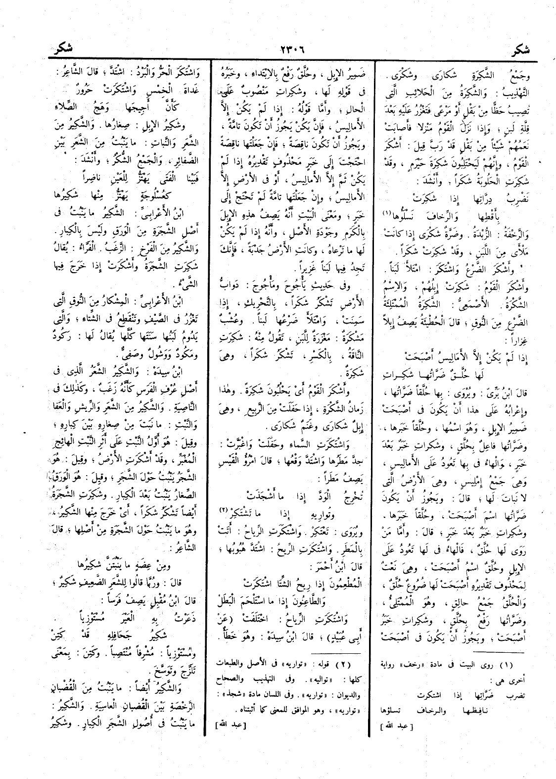 وجَمْعُ الشَّكِرَةِ شَكارَى وشَكْرَى التهذيب والشَّكِرَةُ من الحلائب التي تصيب حظّاً من بَقْل أَو مَرْعًى فَتَغْزُرُ عليه بعد قلة لبن وإِذا نزل القوم منزلاً فأَصابتْ نَعَمُهم شيئاً من بَقْلٍ قَدْ رَبَّ قيل أَشْكَرَ القومُ وإِنهم لَيَحْتَلِبُونَ شَكِرَةَ حَيْرَمٍ وقد شَكِرَتِ الحَلُوبَةُ شَكَراً وأَنشد نَضْرِبُ دِرَّاتِها إِذا شَكِرَتْ بِأَقْطِها والرِّخافَ نَسْلَؤُها والرَّخْفَةُ الزُّبْدَةُ وضَرَّةٌ شَكْرَى إِذا كانت مَلأَى من اللبن وقد شِكْرَتْ شَكَراً وأَشْكَرَ الضَّرْعُ واشْتَكَرَ امتلأَ لبناً وأَشْكَرَ القومُ شَكِرتْ إِبِلُهُمْ والاسم الشَّكْرَةُ الأَصمعي الشَّكِرَةُ الممتلئة الضرع من النوق قال الحطيئة يصف إِبلاً غزاراً إِذا لم يَكُنْ إِلاَّ الأَمَالِيسُ أَصْبَحَتْ لَها حُلَّقٌ ضَرَّاتُها شَكِرات قال ابن بري ويروى بها حُلَّقاً ضَرَّاتُها وإِعرابه على أَن يكون في أَصبحت ضمير الإِبل وهو اسمها وحُلَّقاً خبرها وضراتها فاعل بِحُلَّق وشكرات خبر بعد خبر والهاء في بها تعود على الأَمالِيسِ وهي جمع إمْلِيسٍ وهي الأَرض التي لا نبات لها قال ويجوز أَن يكون ضراتها اسم أَصبحت وحلقاً خبرها وشكرات خبر بعد بعد خبر قال وأَما من روى لها حلق فالهاء في لها تعود على الإِبل وحلق اسم أَصبحت وهي نعت لمحذوف تقديره أَصبحت لها ضروع حلق والحلق جمع حالق وهو الممتلئ وضراتها رفع بحلق وشكرات خبر أَصبحت ويجوز أَن يكون في أَصبحت ضمير الأَبل وحلق رفع بالإِبتداء وخبره في قوله لها وشكرات منصوب على الحال وأَما قوله إِذا لم يكن إِلاَّ الأَماليس فإِنَّ يكن يجوز أَن تكون تامة ويجوز أَن تكون ناقصة فإِن جعلتها ناقصة احتجت إِلى خبر محذوف تقديره إِذا لم يكن ثَمَّ إِلاَّ الأَماليس أَو في الأَرض إِلاَّ الأَماليس وإِن جعلتها تامة لم تحتج إِلى خبر ومعنى البيت أَنه يصف هذه الإِبل بالكرم وجودة الأَصل وأَنه إِذا لم يكن لها ما ترعاه وكانت الأَرضُ جَدْبَةً فإِنك تجد فيها لبناً غزيراً وفي حديث يأْجوج ومأْجوج دَوابُّ الأَرض تَشْكَرُ شَكَراً بالتحريك إِذا سَمِنَت وامتلأَ ضَرْعُها لبناً وعُشْبٌ مَشْكَرَة مَغْزَرَةٌ للبن تقول منه شَكِرَتِ الناقة بالكسر تَشْكَرُ شَكَراً وهي شَكِرَةٌ وأَشْكَرَ القومُ أَي يَحْلُبُون شَكِرَةً وهذا زمان الشَّكْرَةِ إِذا حَفَلتْ من الربيع وهي إِبل شَكَارَى وغَنَمٌ شَكَارَى واشْتَكَرَتِ السماءُ وحَفَلَتْ واغْبَرَّتْ جَدَّ مطرها واشتْدَّ وقْعُها قال امرؤ القيس يصف مطراً تُخْرِجُ الوَدَّ إِذا ما أَشْجَذَتْ وتُوالِيهِ إِذا ما تَشْتَكِرْ ويروى تَعْتَكِرْ واشْتَكَرَِت الرياحُ أَتت بالمطر واشْتَكَرَتِ الريحُ اشتدّ هُبوبُها قال ابن أَحمر المُطْعِمُونَ إِذا رِيحُ الشِّتَا اشْتَكَرَتْ والطَّاعِنُونَ إِذا ما اسْتَلْحَمَ البَطَلُ واشْتَكَرَتِ الرياحُ اختلفت عن أَبي عبيد قال ابن سيده وهو خطأُ واشْتَكَرَ الحرُّ والبرد اشتدّ قال الشاعر غَداةَ الخِمْسِ واشْتَكَرَتْ حَرُورٌ كأَنَّ أَجِيجَها وَهَجُ الصِّلاءِ وشَكِيرُ الإِبل صغارها والشَّكِيرُ من الشَّعَرِ والنبات ما ينبت من الشعر بين الضفائر والجمع الشُّكْرُ وأَنشد فَبَيْنا الفَتى لِلْعَيْنِ ناضِراً كعُسْلُوجَةٍ يَهْتَزُّ منها شَكِيرُها ابن الأَعرابي الشَّكِيرُ ما ينبت في أَصل الشجرة من الورق وليس بالكبار والشَّكيرُ من الفَرْخِ الزَّغَبُ الفراء يقال شَكِرَتِ الشَّجَرَةُ وأَشْكَرَتْ إِذا خرج فيها الشيء ابن الأَعرابي المِشْكارُ من النُّوقِ التي تَغْزرُ في الصيف وتنقطع في الشتاء والتي يدوم لبنها سنتها كلها يقال لها رَكُودٌ ومَكُودٌ وَوَشُولٌ وصَفِيٌّ ابن سيده والشَّكِيرُ الشَّعَرُ الذي في أَصل عُرْفِ الفَرَسِ كأَنه زَغَبٌ وكذلك في الناصية والشَّكِيرُ من الشعر والريش والعَفا والنَّبْتِ ما نَبَتَ من صغاره بين كباره وقيل هو أَول النبت على أَثر النبت الهائج المُغْبَرِّ وقد أَشْكَرَتِ الأَ