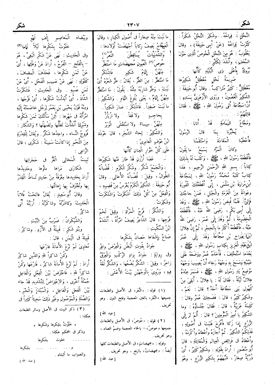 وفي الحديث نَهَى عن شَكْرِ البَغِيِّ هو بالفتح الفرج أَراد عن وطئها أَي عن ثمن شَكْرِها فحذف المضاف كقوله نهى عن عَسِيبِ الفَحْلِ أَي عن ثمن عَسْبِهِ وفي الحديث فَشَكَرْتُ الشاةَ أَي أَبدلت شَكْرَها أَي فرجها ومنه قول يحيى بن يَعْمُر لرجل خاصمته إِليه امرأَته في مَهْرِها أَإِنْ سأَلَتْكَ ثمن شَكْرِها وشَبْرِك أَنْشأْتَ تَطُلُّها وتَضْهَلُها ؟ والشِّكارُ فروج النساء واحدها شَكْرٌ ويقال للفِدرَة من اللحم إِذا كانت سمينة شَكْرَى قال الراعي تَبِيتُ المَخالي الغُرُّ في حَجَراتِها شَكارَى مَراها ماؤُها وحَدِيدُها أَراد بحديدها مِغْرَفَةٍ من حديد تُساطُ القِدْرُ بها وتغترف بها إِهالتها وقال أَبو سعيد يقال فاتحْتُ فلاناً الحديث وكاشَرْتُه وشاكَرْتُه أَرَيْتُه أَني شاكِرٌ والشَّيْكَرانُ ضرب من النبت وبَنُو شَكِرٍ قبيلة في الأَزْدِ وشاكر قبيلة في اليمن قال مُعاوِيَ لم تَرْعَ الأَمانَةَ فارْعَها وكُنْ شاكِراً للهِ والدِّينِ شاكِرُ أَراد لم تَرْعَ الأَمانةَ شاكرٌ فارعها وكن شاكراً لله فاعترض بين الفعل والفاعل جملةٌ أُخرى والاعتراض للتشديد قد جاء بين الفعل والفاعل والمبتدإِ والخبر والصلة والموصول وغير ذلك مجيئاً كثيراً في