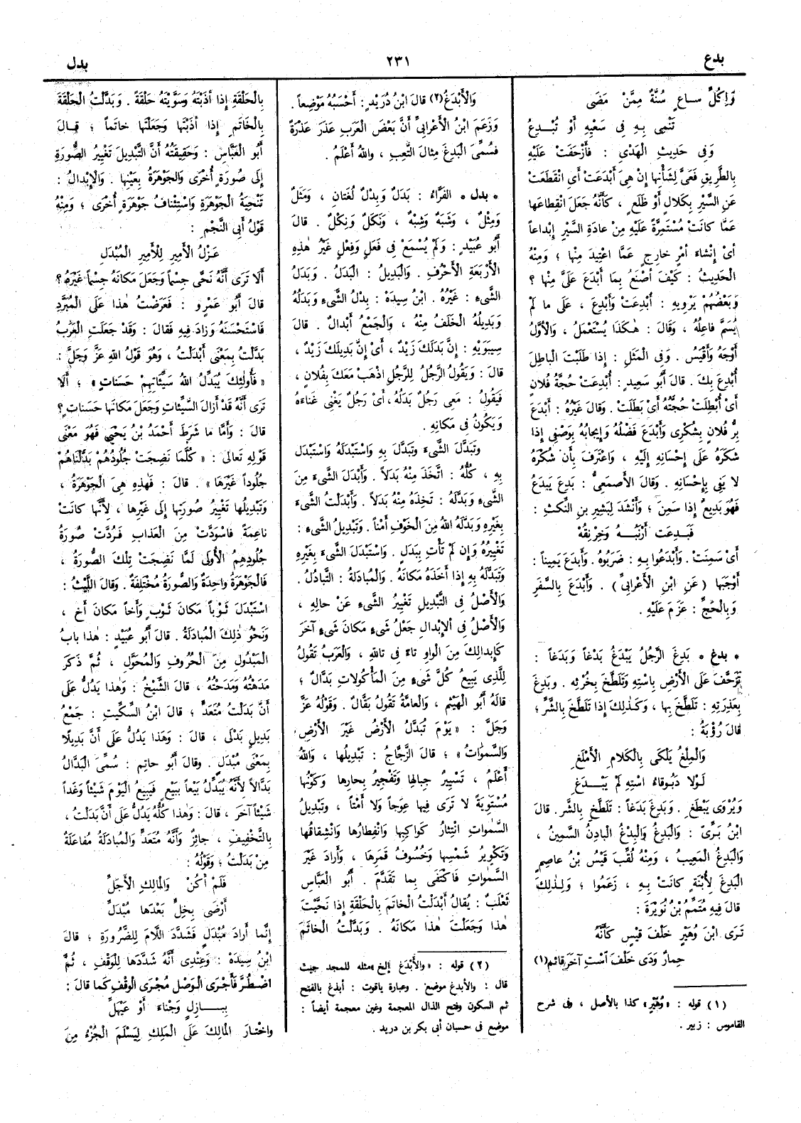 ( بدل ) الفراء بَدَلٌ وبِدْلٌ لغتان ومَثَل ومِثْل وشَبَه وشِبْه ونَكَل ونِكْل قال أَبو عبيد ولم يُسْمَع في فَعَل وفِعْل غير هذه الأَربعة الأَحرف والبَدِيل البَدَل وبَدَلُ الشيء غَيْرُه ابن سيده بِدْل الشيء وبَدَله وبَدِيله الخَلَف منه والجمع أَبدال قال سيبوبه إِنَّ بَدَلك زَيد أَي إِنَّ بَديلك زَيْد قال ويقول الرجل للرجل اذهب معك بفلان فيقول معي رجل بَدَلُه أَي رجل يُغْني غَناءه ويكون في مكانه وتَبَدَّل الشيءَ وتَبدل به واستبدله واستبدل به كُلُّه اتخذ منه بَدَلاً وأَبْدَل الشيءَ من الشيء وبَدّله تَخِذَه منه بدلاً وأَبدلت الشيء بغيره وبدّله الله من الخوف أَمْناً وتبديل الشيء تغييره وإِن لم تأْت ببدل واستبدل الشيء بغيره وتبدَّله به إِذا أَخذه مكانه والمبادلة التبادُل والأَصل في التبديل تغيير الشيء عن حاله والأَصل في الإِبدال جعل شيء مكان شيء آخر كإِبدالك من الواو تاء في تالله والعرب تقول للذي يبيع كل شيء من المأْكولات بَدَّال قاله أَبو الهيثم والعامة تقول بَقَّال وقوله عز وجل يوم تُبَدَّل الأَرْضُ غيرَ الأَرض والسمواتُ قال الزجاج تبديلها والله أَعلم تسييرُ جبالها وتفجير بِحارها وكونُها مستوية لا تَرى فيها عِوَجاً ولا أَمْتاً وتبديل السموات انتثار كواكِبها وانفطارُها وانشقاقُها وتكوير شمسها وخسوف قمرها وأَراد غيرَ السموات فاكتَفى بما تقدم أَبو العباس ثعلب يقال أَبْدلت الخاتم بالحَلْقة إِذا نَحَّيت هذا وجعلت هذا مكانه وبدَّلت الخاتم بالحَلْقة إِذا أَذَبْتَه وسوَّيته حَلْقة وبدلت الحَلْقة بالخاتم إِذا أَذبتها وجعلتها خاتماً قال أَبو العباس وحقيقته أَن التبديل تغيير الصورة إِلى صورة أُخرى والجَوْهرةُ بعينها والإِبدال تَنْحيةُ الجوهرة واستئناف جوهرة أُخرى ومنه قول أَبي النجم عَزْل الأَمير للأَمير المُبْدَل أَلا ترى أَنه نَحَّى جسماً وجعل مكانه جسماً غيره ؟ قال أَبو عمرو فعرضت هذا على المبرد فاستحسنه وزاد فيه فقال وقد جعلت العرب بدَّلت بمعنى أَبدلت وهو قول الله عز وجل أُولئك يبدّل الله سَيِّئاتهم حسنات أَلا ترى أَنه قد أَزال السيئات وجعل مكانها حسنات ؟ قال وأَمَّا ما شَرَط أَحمد بن يحيى فهو معنى قوله تعالى كلما نَضِجَت جُلودُهم بدَّلناهم جُلوداً غيرها قال فهذه هي الجوهرة وتبديلها تغيير صورتها إِلى غيرها لأَنها كانت ناعمة فاسودّت من العذاب فردّت صورةُ جُلودهم الأُولى لما نَضِجَت تلك الصورة فالجوهرة واحدة والصورة مختلفة وقال الليث استبدل ثوباً مكان ثوب وأَخاً مكان أَخ ونحو ذلك المبادلة قال أَبو عبيد هذا باب المبدول من الحروف والمحوّل ثم ذكر مَدَهْته ومَدَحْته قال الشيخ وهذا يدل على أَن بَدَلت متعدّ قال ابن السكيت جمع بَدِيل بَدْلى قال وهذا يدل على أَن بَديلاً بمعنى مُبْدَل وقال أَبو حاتم سمي البدّال بدّالاً لأَنه يبدّل بيعاً ببيع فيبيع اليوم شيئاً وغداً شيئاً آخر قال وهذا كله يدل على أَن بَدَلت بالتخفيف جائز وأَنه متعدّ والمبادلة مفاعلة من بَدَلت وقوله فلم أَكُنْ والمالِكِ الأَجَلِّ أَرْضى بِخَلٍّ بعدَها مُبْدَلِّ إِنما أَراد مُبْدَل فشدَّد اللام للضرورة قال ابن سيده وعندي أَنه شدَّدها للوقف ثم اضطُرَّ فأَجرى الوصل مُجْرى الوقف كما قال ببازِلٍ وَجْناءَ أَو عَيْهَلِّ واختار المالك على المَلك ليسلم الجزء من