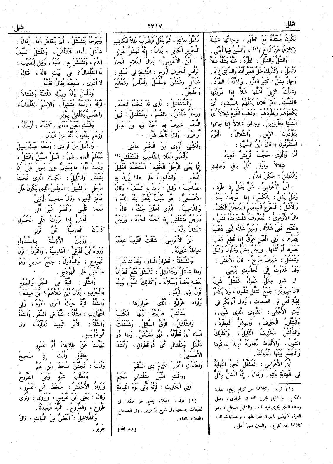 والسين فيها أَعلى والشَّلُّ والشَّلَلُ الطَّرْد شَلَّه يَشُلُّه شَلاًّ فانشَلَّ وكذلك شَلَّ العَيْرُ أُتُنَه والسائق إِبله وحمارٌ مِشَلٌّ كثير الطرْد والشَّلَّة الطَّرْدُ وشَلَلْت الإِبِلَ أَشُلُّها شَلاًّ إِذا طَرَدتها فانشَلَّت ومَرَّ فلان يَشُلُّهم بالسيف أَي يَكْسَؤُهم ويطرُدُهم وذهبَ القومُ شِلالاً أَي انشَلُّوا مطرودين وجاؤوا شِلالاً إِذا جاؤوا يَطرُدون الإِبل والشِّلالُ القومُ المتفرقون قال ابن الدُّمَيْنة أَما والذي حجَّتْ قُرَيْشٌ قَطِينَه شِلالاً ومَوْلى كُلِّ باقٍ وهالِكِ والقَطِين سَكْنُ الدار ابن الأَعرابي شَلَّ يَشُلُّ إِذا طَرَد وشَلَّ يَشِلُّ إِذا اعْوَجَّت يدُه بالكسر والأَشَلُّ المُعْوَجُّ المِعْصَم المتَعَطِّل الكَفِّ قال الأَزهري المعروف شَلَّتْ يدُه تَشَلُّ بالفتح فهي شَلاَّءِ وعَينٌ شَلاَّء للتي ذهب بَصرُها وفي العين عِرْقٌ إِذا قُطِع ذهب بصرُها أَو أَشَلَّها ورجل مِشَلٌّ وشَلولٌ وشُلُلٌ وشُلْشُل خفيف سريع قال الأَعشى وقد غَدَوْتُ إِلى الحانوتِ يَتْبَعُني شاوٍ مِشَلٌّ شَلُولٌ شُلْشُلٌ شَوِلُ قال سيبويه جمع الشُّلُلِ شُلُلونَ ولا يُكَسَّر لقِلة فُعُلٍ في الصفات وقال أَبو بكر في بيت الأَعشى الشّاوِي الذي شَوى والشَّلول الخفيف والمِشَلُّ المِطْرَد والشُّلْشُل الخفيف القليل وكذلك الشَّوِل والأَلفاظ متقاربةٌ أُريد بذكرها والجمع بينها المبالغة ابن الأَعرابي المُشَلِّل الحمار النِّهايةُ في العِناية بأُتُنِه ويقال إِنه لَمُشِلٌّ مِشَلٌّ مُشَلِّل لعانته ثم ينقل فيُضرب مَثَلاً للكاتب النِّحْرير الكافي يقال إِنه لمِشَلٌّ عُونٍ ابن الأَعرابي يقال للغلام الحارِّ الرأْس الخفيف الروح النشيط في عمله شُلْشُلٌ وشُنْشُن وسُلْسُل ولُسْلُس وشُعْشُعٌ وجُلْجُل والمُتَشَلْشِل الذي قد تخَدَّد لحمُه ورجل شُلشُلٌ بالضم ومُتَشَلْشِل قليل اللحم خفيف فما أَخَذَ فيه من عَمل أَو غيره وقال تأَبَّط شرًّا ولكِنَّني أُرْوِي من الخَمْرِ هامَتي وأَنْضُو المَلا بالشَّاحِب المُتَشَلشِل إِنما يعني الرجل الخفيف المتخدِّد القليل اللحم والشاحب على هذا يريد به الصاحب وقيل يريد به السيف وقال الأَصمعي هو سيف يَقْطُر منه الدمُ والشاحِبُ الذي أَخْلَقَ جَفْنُه قال ورجل مُتَشَلْشِل إِذا تخَدَّد لحمُه ورجل شَلْشالٌ مثله ابن الأَعرابي شَلَلْت الثوبَ خِطْتُه خِياطةً خفيفة والشَّلْشَلة قَطَرانُ الماء وقد تشَلْشَل وماءٌ شَلْشَلٌ ومُتَشَلْشِلٌ تشَلْشَل يَتْبَع قَطَرانُ بعضه بعضاً وسَيَلانُه وكذلك الدَّمُ ومنه قول ذي الرُّمّة وَفْراءَ غَرْفيَّةٍ أَثْأَى خَوارِزَها مُشَلْشَلٌ ضَيَّعَتُه بينها الكُتَبُ والشَّلْشَل الزِّقُّ السائل وشَلْشَلْتُ الماء أَي قَطَّرته فهو مُشَلْشَل وماء ذو شَلْشَلٍ وشَلْشالٍ أَي ذو قَطَرانٍ وأَنشد الأَصمعي واهْتَمَّتِ النَّفْسُ اهْتِمامَ ذي السَّقَم ووافَتِ اللَّيْلَ بِشَلْشالٍ سَجَم وفي الحديث فإِنه يأْتي يومَ القيامة وجرحُه يتَشلْشل أَي يَتقاطَرُ دَماً يقال شَلشَلَ الماءَ فتَشَلْشَل وشَلْشل السيفُ الدمَ وتشَلشَل به صَبَّه وقيل لنُصَيبٍ ما الشَّلْشالُ ؟ في بيتٍ قاله فقال لا أَدري سمعته يقال فقُلته وشلشَلَ بوله وببوله شلشلة وشِلشالاً فرَّقه وأَرسله منتشراً والاسم الشَّلشالُ والصبيُّ يُشَلشِلُ ببوله وشَلَّتِ العينُ دَمْعَها كشَنَّتْه أَرْسَلته وزعم يعقوب أَنه من البدل والشَّليلُ من الوادي وَسَطه حيث يَسيل مُعْظم الماء شمر انسَلَّ السَّيْلُ وانشَلَّ وذلك أَوَّلَ ما يبتدئ حين يَسيل قبلَ أَن يشتدَّ والشَّليلُ الكساء الذي تحت الرَّحْل والشَّليل الحِلْس الذي يكون على عَجُز البعير وقال حاجب المازني صَحا قَلبي وأَقْصَرَ غَيرَ أَنِّي أَهَشُّ إِذا مَرَرتُ على الحُمول كَسَوْنَ الفارِسِيَّةَ كُلَّ قَرْنٍ وزَيَّنَّ الأَشِلَّةَ بالسُّدُولِ ورواه ابن الغرقي القادِسِيّة والقرنُ قرن الهَوْدَج وال