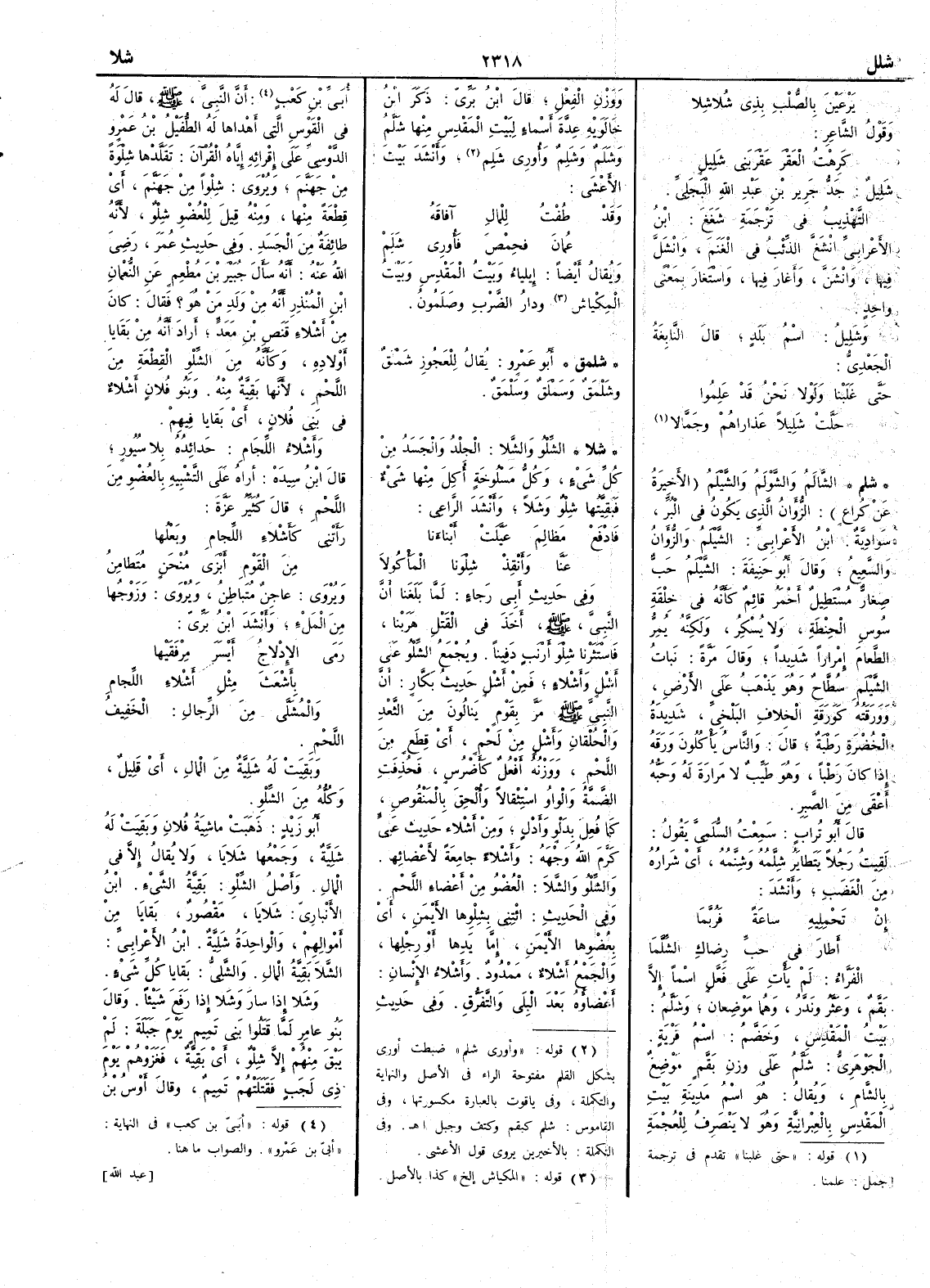 ( شلا ) الشِّلْوُ والشَّلا الجِلدُ والجسَد من كل شيء وكلُّ مسلوخة أُكِلَ منها شيءٌ فبَقِيَّتُها شِلْوٌ وشَلاً وأَنشد الراعي فادْفعْ مظالمَ عيَّلت أَبْناءَنا عَنّا وأَنْقِذْ شِلْوَنا المأْكُولا وفي حديث أَبي رجاءٍ لما بلغَنا أَن النبي صلى الله عليه وسلم أَخذ في القتل هربْنا فاسْتَثَرْنا شِلْوَ أَرنبٍ دفيناً ويجمع الشِّلْوُ على أَشْلٍ وأَشْلاءٍ فمن أَشْلٍ حديث بكارٍ أَن النبي صلى الله عليه وسلم مَرَّ بقومٍ يَنالون من الثَّعْدِ والحُلْقان وأَشْل من لحم أَي قطَع من اللحم ووزنُه أَفعُلٌ كأَضرُسٍ فحُذفت الضمة والواو استثقالاً وأُلحِق بالمنْقوص كما فُعل بدلو وأَدْل ومن أَشْلاءٍ حديث علي كرم الله وجهه وأَشْلاءٍ جامعة لأَعْضائها والشِّلْو والشَّلا العُضْو من أَعضاء اللحم وفي الحديث ائتني بشِلوها الأَيَمن أَي بعُضوِها الأَيَمنِ إِما يدِها أَو رجلِها والجمعُ أَشْلاءٌ ممدودٌ وأَشْلاءُ الإِنسان أَعضاؤُه بعدَ البِلى والتفَرُّق وفي حديث أُبَيِّ بنِ كَعْبٍ أَنَّ النبي صلى الله عليه وسلم قال له في القَوْسِ التي أَهْداها له الطُّفَيْلُ ابنُ عَمْروٍ الدَّوْسِي على إِقرائِه إِيَّاه القُرآن تَقَلَّدها شِلْوةً من جهنَّم ويروى شِلْواً من جَهَنَّم أَي قِطْعَةً منها ومنه قيل للعُضْوِ شِلْوٌ لأَنه طائِفةٌ من الجَسَد وفي حديث عمر رضي الله عنه أَنه سَأَلَ جُبَيْرَ بنَ مُطْعِمٍ عن النُّعْمانِ ابنِ المنْذِر أَنه مِنْ ولَدِ مَنْ هو ؟ فقال كان مِنْ أَشْلاء قَنَصِ بنِ مَعدٍّ أَراد أَنه من بَقايا أَولادِه وكأَنَّه من الشِّلْوِ القِطْعة من اللحمِ لأَنَّها بقِيَّة منه وبنو فلانٍ أَشْلاءٌ في بني فُلانٍ أَي بَقايا فيهم وأَشْلاءُ اللِّجَامِ حَدائِدُه بِلا سُيُورٍ قال ابن سيده أُراهُ على التَّشْبِيهِ بالعُضْوِ من اللَّحْمِ قال كثير عزة رَأَتْني كأَشْلاءِ اللِّجامِ وبَعْلُها منَ القَوْمِ أَبْزَى مُنْحَنٍ مُتَطامِنُ ويروى عاجِنٌ مُتَباطِنُ ويروى وزَوْجُها من المَلْءِ وأَنشد ابن بري رَمَى الإِدْلاجُ أَيْسَرَ مِرْفَقَيْهَا بأَشْعَثَ مِثْلِ أَشْلاءِ اللِّجامِ والمُشَلَّى من الرِّجالِ الخَفِيفُ اللَّحْمِ وبَقِيَتْ له شَلِيَّةٌ من المَالِ أَي قَلِيلٌ وكلُّه مِن الشِّلْوِ أَبو زيد ذَهَبَتْ ماشِيَةُ فُلانِ وبَقِيَتْ له شَلِيَّةٌ وجمعُها شَلايَا ولا يقالُ إِلاَّ في المَالِ وأَصْلُ الشِّلْوِ بَقِيَّةُ الشَّيءِ ابن الأَنباري شَلايَا مقصورٌ بَقايَا من أَمْوالِهم والواحِدَةُ شَلِيَّة ابن الأَعرابي الشَّلا بقِيَّةُ المَالِ والشَّلِيُّ بقايا كُلِّ شيء وشَلا إِذا سارَ وشَلا إِذا رَفَع شيئاً وقال بنو عامرٍ لمَّا قَتَلوا بَني تَميمٍ يومَ جَبَلة لم يبقَ منهمْ إِلاَّ شِلْوٌ أَي بَقِيَّة فَغَزَوْهُم يومَ ذِي لَجَب فَقَتَلَتْهم تَمِيمٌ وقال أَوسُ بنُ