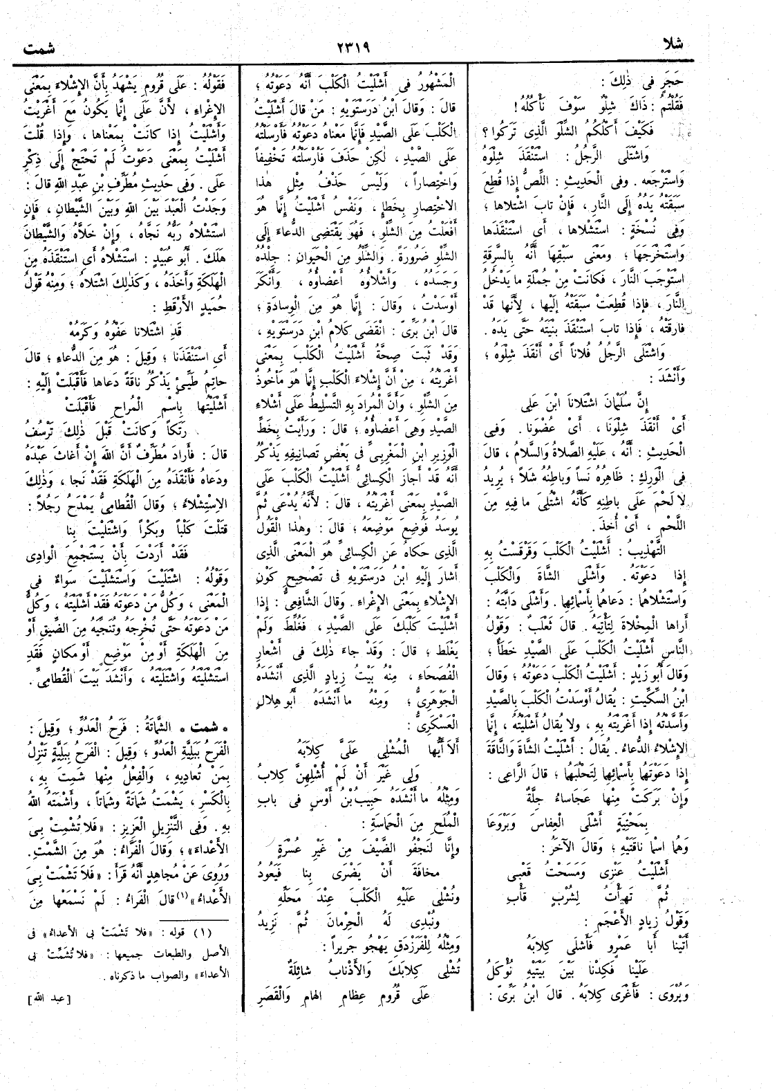حَجَرٍ في ذلك فَقُلْتُمُ ذَاكَ شِلْوٌ سَوْفَ نَأْكُلُه فكَيْفَ أَكْلُكُمْ الشِّلْوَ الذي تَرَكُوا ؟ واشْتَلى الرجلُ اسْتَنْقَذَ شِلْوَه واسْتَرْجَعَه وفي الحديث اللِّصُّ إِذا قُطِعَ سَبَقَتْهُ يَدُه إِلى النار فإِن تاب اشْتَلاها وفي نسخة اسْتَشْلاها أَي اسْتَنْقَذَها واسْتَخْرَجها ومعنى سَبْقِهَا أَنَّه بالسَّرِقَةِ اسْتَوْجَبَ النارَ فكانَتْ من جُمْلَةٍ ما يَدخُلُ النارَ فإِذا قُطِعَتْ سَبَقَتْه إلَيْها لأَنَّها قد فارَقَتْه فإذا تابَ اسْتَنْقَذَ بِنْيَتَه حتى يَدَهُ واشْتَلى الرجلُ فلاناً أَي أَنْقَذَ شِلْوَه وأَنشد إِنَّ سُلَيْمانَ اشْتَلانَا ابنَ عَلي أَي أَنْقَذَ شِلْوَنَا أَي عُضْوَنا وفي الحديث أَنه عليه الصلاة والسلام قال في الوَرِكِ ظَاهِرُه نَساً وباطِنُه شَلاً يريد لا لَحْمَ على باطِنِه كأَنَّه اشْتُليَ ما فيه من اللحم أَي أُخذ التهذيب أَشْلَيْتُ الكَلْبَ وقَرْقَسْتُ به إِذا دَعَوْتَه وأَشْلى الشَّاةَ والكَلْبَ واسْتَشْلاهُما دَعاهُما بأَسْمائِهِما وأَشْلى دَابَّتَه أَراها المُخْلاة لتَأْتِيَه قال ثعلب وقولُ الناسِ أَشليتُ الكَلْبَ على الصيَّدِ خَطَأٌ وقال أَبو زيد أَشْلَيْتُ الكَلْبَ دَعَوْته وقال ابن السكيت يقال أَوسَدْتُ الكَلْبَ بالصَّيْدِ وأَسَّدْتُه إِذا أَغْرَيْته به ولا يُقالُ أَشْلَيْته إِنما الإِشْلاءُ الدُّعاءُ يقال أَشْلْيتُ الشاةَ والنَّاقَةَ إِذا دَعَوْتَهُما بأَسمائِهِما لتَحْلُبَهُما قال الراعي وإِنْ بَرَكَتْ مِنْها عَجَاساءُ جِلَّةٌ بِمَحْنِيَةٍ أَشْلى العِفاسَ وبَرْوَعَا وهما اسما نافتيه وقال الآخر أَشْلَيْتُ عَنْزِي ومَسَحْت قَعْبي ثُمَّ تَهَيَّأْتُ لِشُرْبٍ قَأْبِ وقول زياد الأَعجم أَتَيْنا أَبا عَمْروٍ فَأَشْلى كِلابَهُ عَلَيْنَا فكِدْنا بَيْنَ بَيْتَيهِ نُؤْكَلُ ويروى فأَغْرَى كِلابَه قال ابن بري المشهورُ في أَشْلَيتُ الكَلْب أَنَّه دَعَوْته قال وقال ابن دَرَسْتَوَيْهِ من قال أَشْلَيْت الكَلْبَ على الصَّيدِ فإِنَّما مَعناهُ دَعَوْته فأَرْسَلْته على الصَّيْد لكن حَذَفَ فأَرْسَلْته تخفيفاً واختصاراً وليس حذفُ مثل هذا الاختصار بخطإِ ونفس أَشْلَيْت إِنما هو أَفْعَلْت من الشِّلْوِ فهو يقتضِي الدُّعاءَ إِلى الشِّلْوِ ضَرورةً والشِّلوُ منَ الحَيَوانِ جِلْدُه وجَسَدُه وأَشْلاؤُهُ أَعْضاؤُه وأَنكَرَ أَوْسَدْت وقال إِنما هُوَ مِنَ الوِسَادَةِ قال ابن بري انقضى كلام ابن دَرَسْتَوَيْهِ وقد ثبَتَ صحة أَشْلَيْت الكَلْبَ بمعنى أَغْرَيْته من أَنَّ إِشْلاءَ الكَلْب إِنَّما هو مأْخوذٌ من الشِّلْوِ وأَنَّ المراد به التسليط على أَشْلاءِ الصيدِ وهي أَعْضاؤُه قال ورأَيت بخَطِّ الوزير ابنِ المَغْرِبي في بعضِ تَصانِيفِه يذكر أَنه قد أَجاز الكسائيُّ أَشْلَيْت الكلب على الصيدِ بمعنى أَغْرَيْتُه قال لأَنه يُدعَى ثم يُوسَدُ فوُضِع موضِعَهُ قال وهذا القولُ الذي حكاهُ عن الكسائيّ هو المعنى الذي أَشار إِليه ابنُ دَرَسْتَوَيْه في تصحيح كون الإِشْلاءِ بمعنى الإِغْراءِ وقال الشافعي إِذا أَشْلَيتَ كَلْبَكَ على الصيدِ فغُلِّطَ ولم يَغْلَطْ قال وقد جاءَ ذلك في أَشعارِ الفُصَحَاء منه بيتُ زيادٍ الذي أَنشده الجوهري ومنه ما أَنشده أَبو هلالٍ العسكري أَلا أَيُّها المُشْلي عَلَيَّ كِلابَهُ ولي غَيْرَ أَنْ لَمْ أُشْلِهِنَّ كِلابُ ومثله ما أَنشدة حبيبُ بنُ أَوْسٍ في باب المُلَحِ من الحَمَاسَةِ وإِنَّا لنَجْفُو الضَّيْفَ من غيرِ عُسْرَةٍ مَخافَةَ أَن يَضْرَى بِنا فيعُودُ ونُشْلي عَلَيْهِ الكَلْبَ عِندَ مَحَلِّه ونُبْدِي له الحِرْمانَ ثُمَّ نَزِيدُ ومثله للفَرَزْدَق يَهْجُو جريراً تُشْلي كِلابَكَ والأَذْنابُ شائلةٌ على قُرُومِ عِظامِ الهَامِ والقَصَرِ فقوله على قُرومِ يَشْهَدُ بأَنَّ الإِشْلاءَ بمعنى الإِغْراءِ لأَنَّ على إِنما يكونُ مع أَغْرَيْتُ وأَشْلَيْتُ إِذا كانت بمعناها و