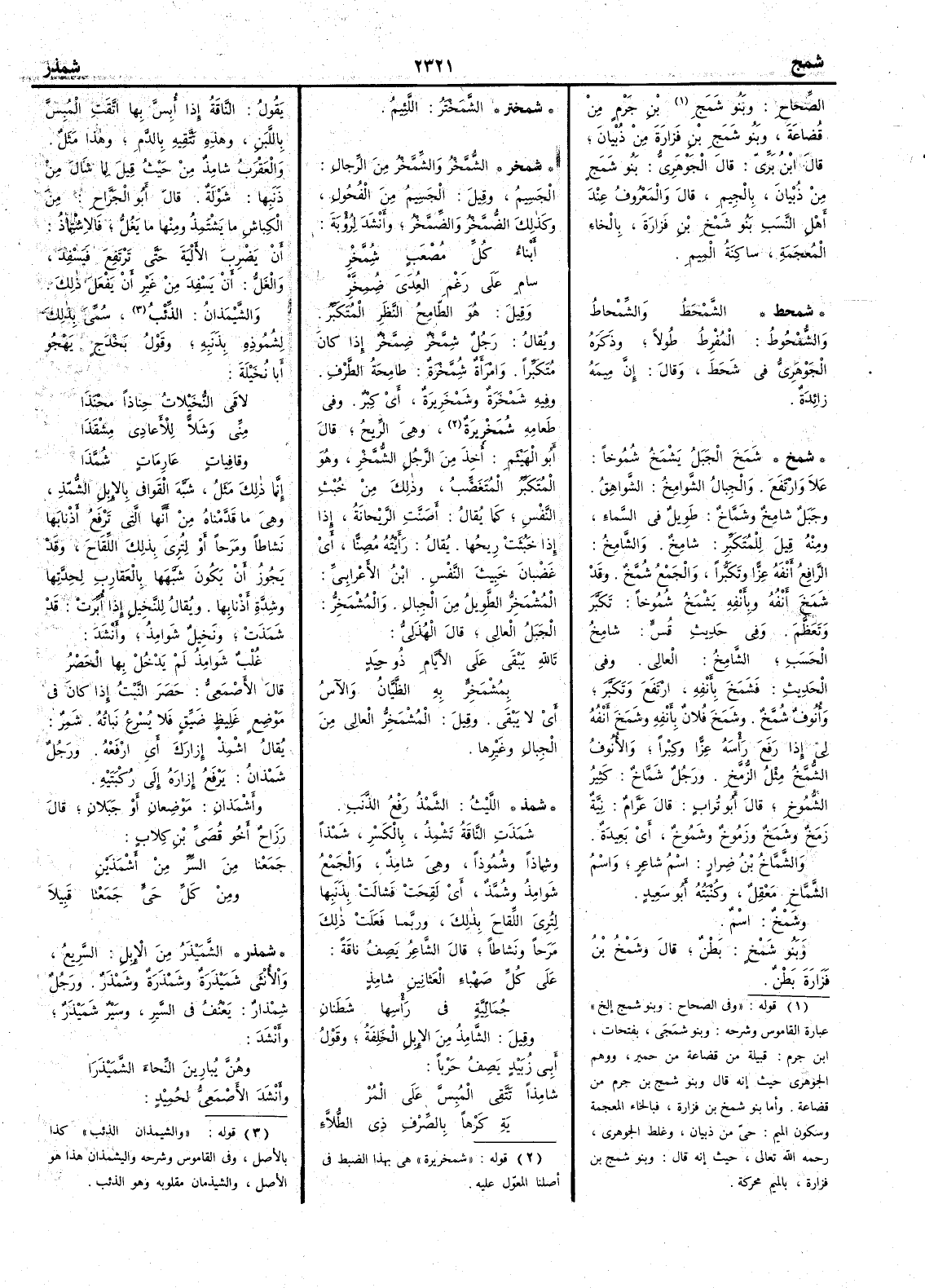 ( * قوله « وفي الصحاح وبنو شمج إلخ » عبارة القاموس وشرحه وبنو شمجى بفتحات ابن حرم قبيلة من قضاعة من حمير ووهم الجوهري حيث انه قال وبنو شمج بن جرم من قضاعة وأَما بنو شمخ بن فزارة فبالخاء المعجمة وسكون الميم حيّ من ذبيان وغلط الجوهري رحمه الله تعالى حيث انه قال وبنو شمج بن فزارة بالجيم محركة ) ابنِ جَرْم من قُضاعة بنو شَمَج بن فَزارة مِن ذُبْيان قال ابن بَرِّي قال الجوهري بنو شَمَج من ذبيان بالجيم قال والمعروف عند أَهل النسَب بنو شَمْخِ بنِ فَزارة بالخاء المعجمة ساكنة الميم ( شمحط ) الشَّمْحَطُ والشِّمْحاطُ والشُّمْحُوطُ المُفْرِطُ طُولاً وذكره الجوهري في شحط وقال إِن ميمه زائدة ( شمخ ) شَمَخَ الجَبَلُ يَشْمَخُ شُموخاً علا وارتفع والجبال الشَّوامخُ الشواهق وجبل شامخٌ وشَمَّاخٌ طويل في السماء ومنه قيل للمتكبر شامخ والشامخ الرافع أَنفه عِزّاً وتكبراً والجمع شُمَّخٌ وقد شَمَخَ أَنفه وبأَنفه يَشْمَخُ شُموخاً تكبر وتعظم وفي حديث قُسٍّ شامخُ الحَسَب الشامخ العالي وفي الحديث فَشَمَخَ بأَنفه ارتفع وتكبر وأُنُوف شُمَّخٌ وشَمَخ فلانٌ بأَنفه وشَمَخَ أَنْفُه لي إِذا رفع رأْسه عزّاً وكبراً والأُنُوفُ الشُّمَّخ مثل الزُّمَّخ ورجل شَمَّاخ كثير الشُّمُوخ قال أَبو تراب قال عَرَّام نِيَّة زَمَخٌ وشَمَخٌ وزَمُوخ وشَمُوخ أَي بعيدة والشَّمَّاخ بن ضِرار اسم شاعر واسم الشَّمَّاخ مَعْقِلٌ وكنيته أَبو سعيد وشَمْخٌ اسم وبنو شَمْخ بَطْنٌ قال وشَمْخُ بن فَزارة بطنٌ ( شمختر ) الشَّمَخْتَرُ اللئيم