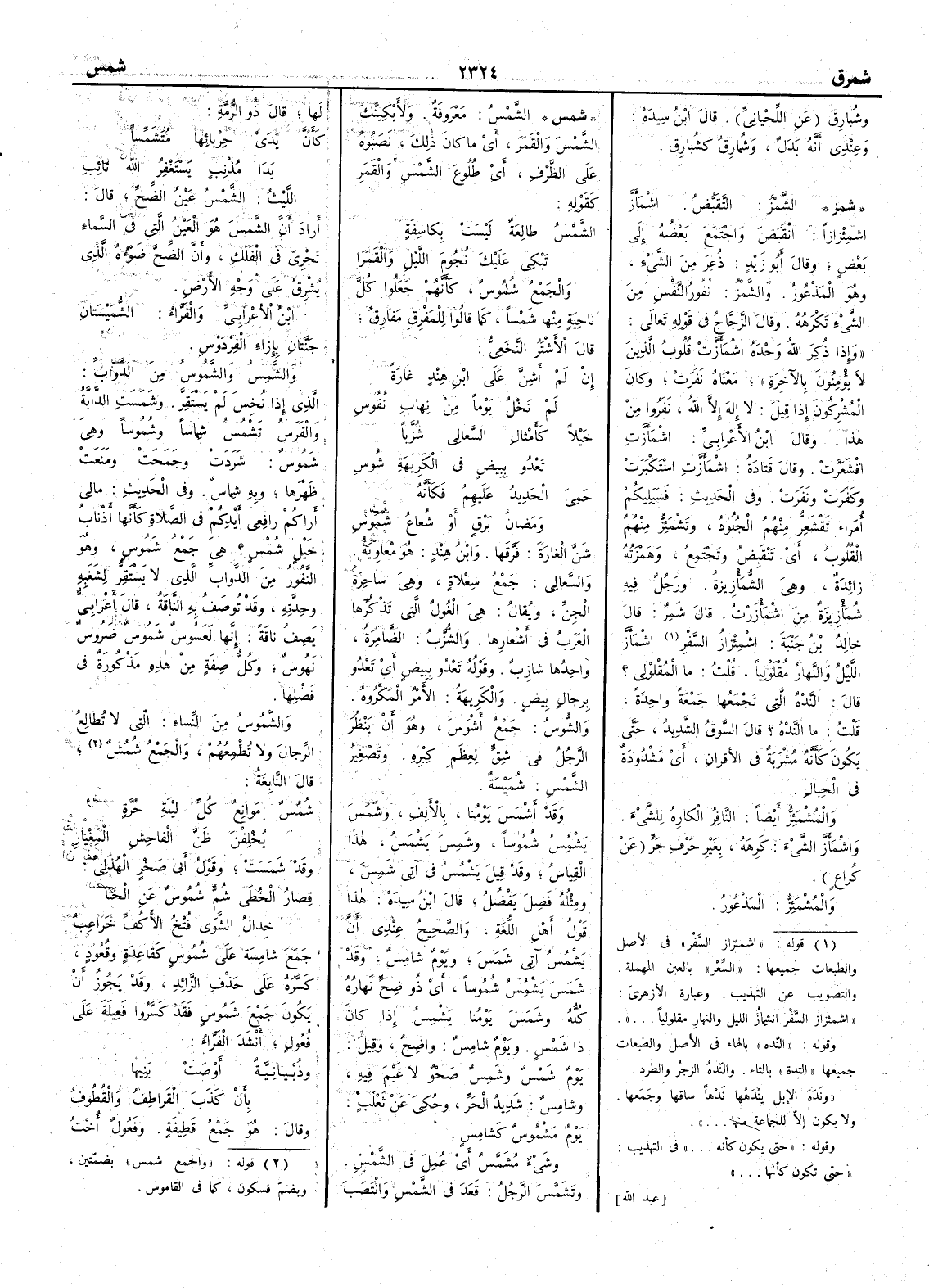 ( شمس ) الشمس معروفة ولأَبْكِيَنَّك الشمسَ والقَمَر أَي ما كان ذلك نصبوه على الظرف أَي طلوعَ الشمس والقمر كقوله الشمسُ طالعةٌ ليسَتْ بكاسِفَةٍ تَبْكِي عليكَ نُجومَ الليلِ والقَمَرا والجمع شُموسٌ كأَنهم جعلوا كل ناحية منها شمساً كما قالوا للمَفْرِق مَفارِق قال الأَشْتَرُ النَّخَعِيُّ إِنْ لم أَشِنَّ على ابنِ هِنْدٍ غارَةً لم تَخْلُ يوماً من نِهابِ نُفُوسِ خَيْلاً كأَمْثالِ السَّعالي شُزَّباً تَعْدُو ببيضٍ في الكريهةِ شُوسِ حَمِيَ الحديدُ عليهمُ فكأَنه وَمَضانُ بَرْقٍ أَو شُعاعُ شُمُوسِ شَنَّ الغارة فرَّقها وابن هند هو معاوية والسَّعالي جمع سِعْلاةٍ وهي ساحرة الجنّ ويقال هي الغُول التي تذكرها العرب في أَشعارها والشُّزَّبُ الضامرة واحدها شازِبٌ وقوله تَعْدُو ببيض أَي تعدو برجال بيض والكريهة الأَمر المكروه والشُّوسُ جمع أَشْوَسَ وهو أَن ينظر الرجل في شِقٍّ لعِظَم كِبْرِه وتصغير الشمس شُمَيْسَة وقد أَشْمَسَ يومُنا بالأَلف وشَمَسَ يَشْمُِسُ شُموساً وشَمِسَ يَشْمَسُ هذا القياس وقد قيل يَشْمُسُ في آتي شَمِس ومثله فَضِلَ يَفْضُل قال ابن سيده هذا قول أَهل اللغة والصحيح عندي أَن يَشْمُسُ آتي شَمَسَ ويوم شامسٌ وقد شَمَس يَشْمِسُ شُموساً أَي ذُو ضِحٍّ نهارُه كله وشَمَس يومُنا يَشْمِسُ إِذا كان ذا شمس ويوم شامِسٌ واضحٌ وقيل يوم شَمْس وشَمِسٌ صَحْوٌ لا غيم فيه وشامِسٌ شديدُ الحَرِّ وحكي عن ثعلب يوم مَشْمُوس كَشامِسٍ وشيء مُشَمَّس أَي عُمِلَ في الشمس وتَشَمَّسَ الرجلُ قَعَدَ في الشمس وانتصب لها قال ذو الرمة كأَنَّ يَدَيْ حِرْبائِها مُتَشَمِّساً يَدا مُذْنِبٍ يَسْتَغْفِرُ اللَّه تائِبِ الليث الشمس عَيْنُ الضِّحِّ قال أَراد أَن الشمس هو العين التي في السماء تجري في الفَلَكِ وأَن الضِّح ضَوْءُه الذي يَشْرِقُ على وجه الأَرض ابن الأَعرابي والفراء الشُّمَيْسَتان جنتان بإِزاء الفِرْدَوْس والشَّمِسُ والشَّمُوسُ من الدواب الذي إِذا نُخِسَ لم يستقرّ وشَمَسَت الدابة والفرسُ تَشْمُسُ شِماساً وشُمُوساً وهي شَمُوسٌ شَرَدتْ وجَمَحَتْ ومَنَعَتْ ظهرها وبه شِماسٌ وفي الحديث ما لي أَراكم رافعي أَيديكم في الصلاة كأَنها أَذْنابُ خيل شُمْسٍ ؟ هي جمعُ شَمُوسٍ وهو النَّفُورُ من الدواب الذي لا يستقرّ لشَغَبه وحِدَّتِه وقد توصف به الناقة قال أَعرابي يصف ناقة إِنها لعَسُوسٌ شَمُوسٌ ضَرُوسٌ نَهُوسٌ وكل صفة من هذه مذكورة في فصلها والشَّمُوسُ من النساء التي لا تُطالِعُ الرجال ولا تُطْمِعُهم والجمع شُمُسٌ قال النابغة شُمُسٌ مَوانِعُ كلِّ ليلةِ حُرَّةٍ يُخْلِفْنَ ظَنَّ الفاحِشِ المِغْيارِ وقد شَمَسَتْ وقولُ أَبي صخر الهذلي قِصارُ الخُطَى شُمٌّ شُمُوسٌ عن الخَنا خِدالُ الشَّوَى فُتْخُ الأَكُفِّ خَراعِبُ جَمَعَ شامِسَةً على شُمُوسٍ كقاعدة وقُعُود كَسَّره على حذف الزائد وقد يجوز أَن يكون جَمَعَ شَمُوس فقد كَسَّروا فَعِيلة على فُعُول أَنشد الفرّاء وذُبْيانيَّة أَوْصَتْ بَنيها بأَنْ كَذَبَ القَراطِفُ والقُطوفُ وقال هو جَمع قَطِيفَة وفَعِّول أُخْت